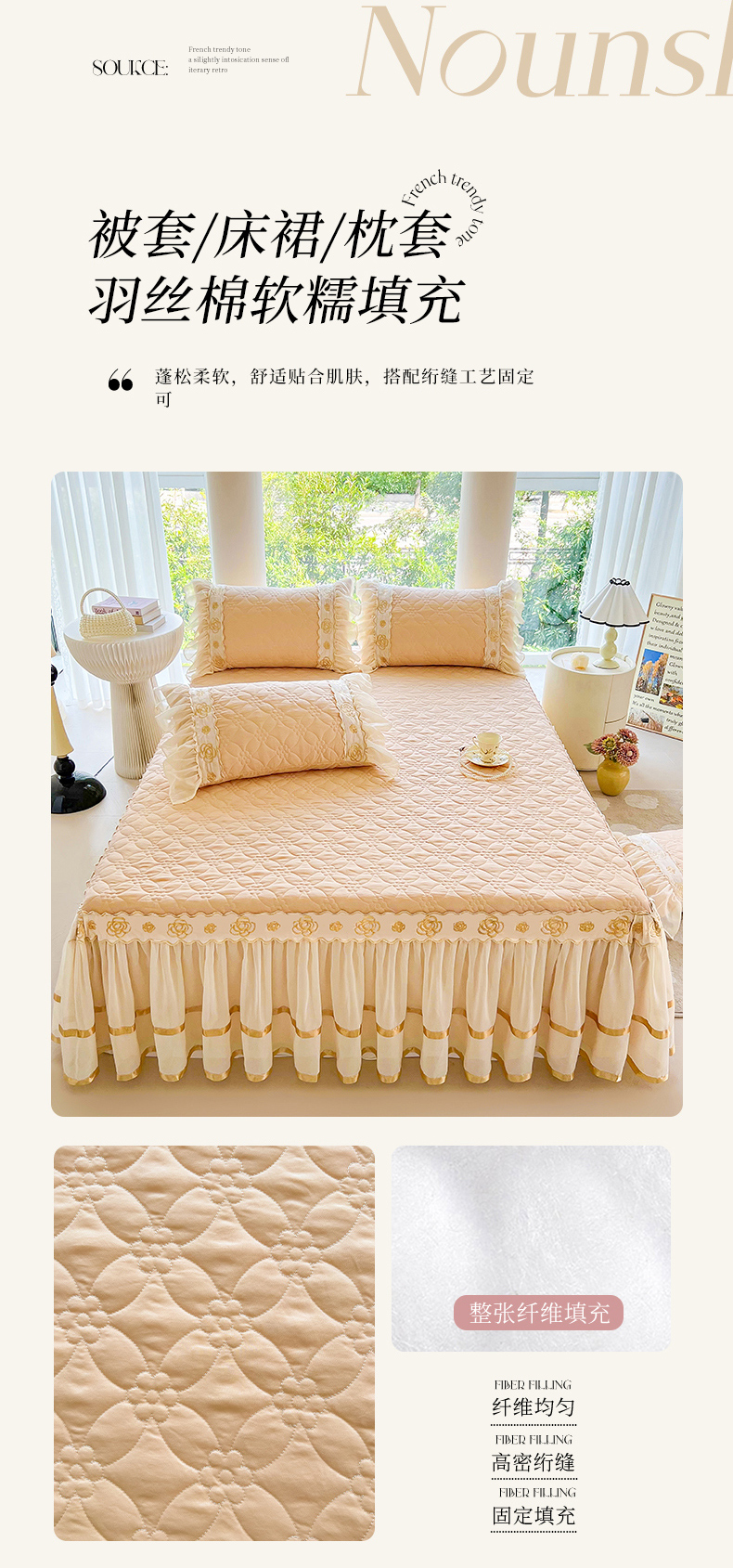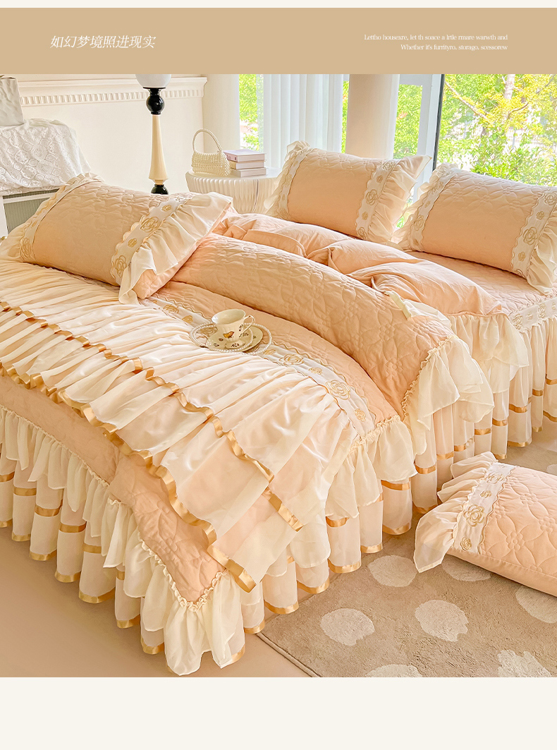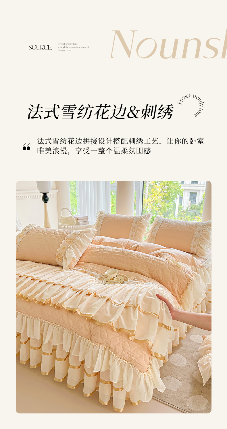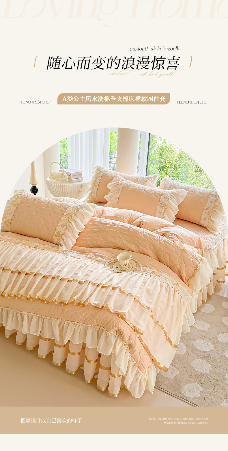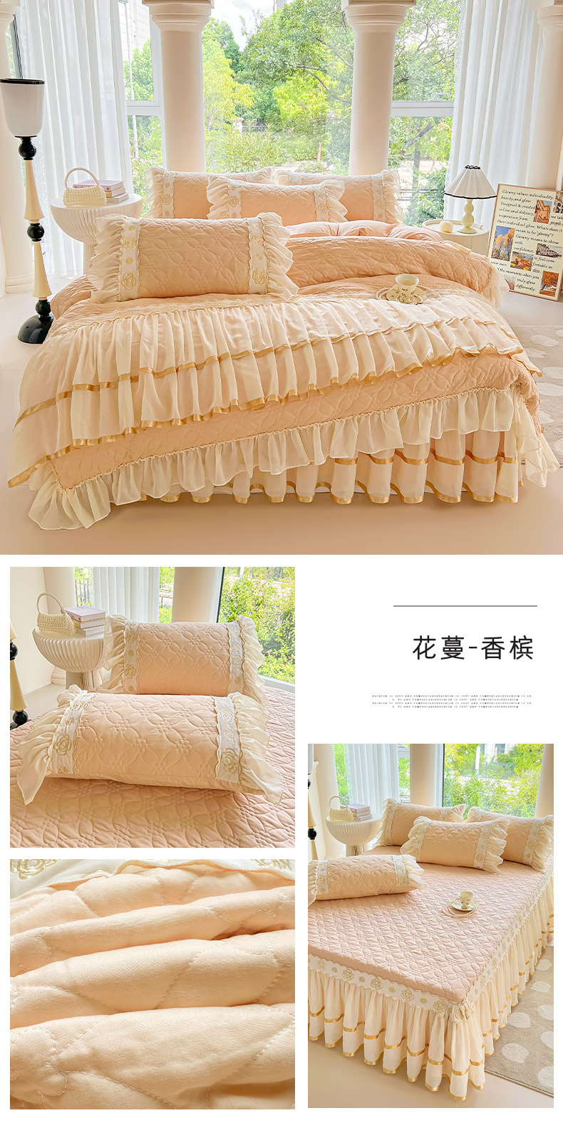 当前位置: 91家纺网 > 商品网购 > 床品套件 > 四件套 > 其它四件套 > 罗艺轩 2024新款公主风水洗棉夹棉床裙款四件套-花蔓花蔓-香槟