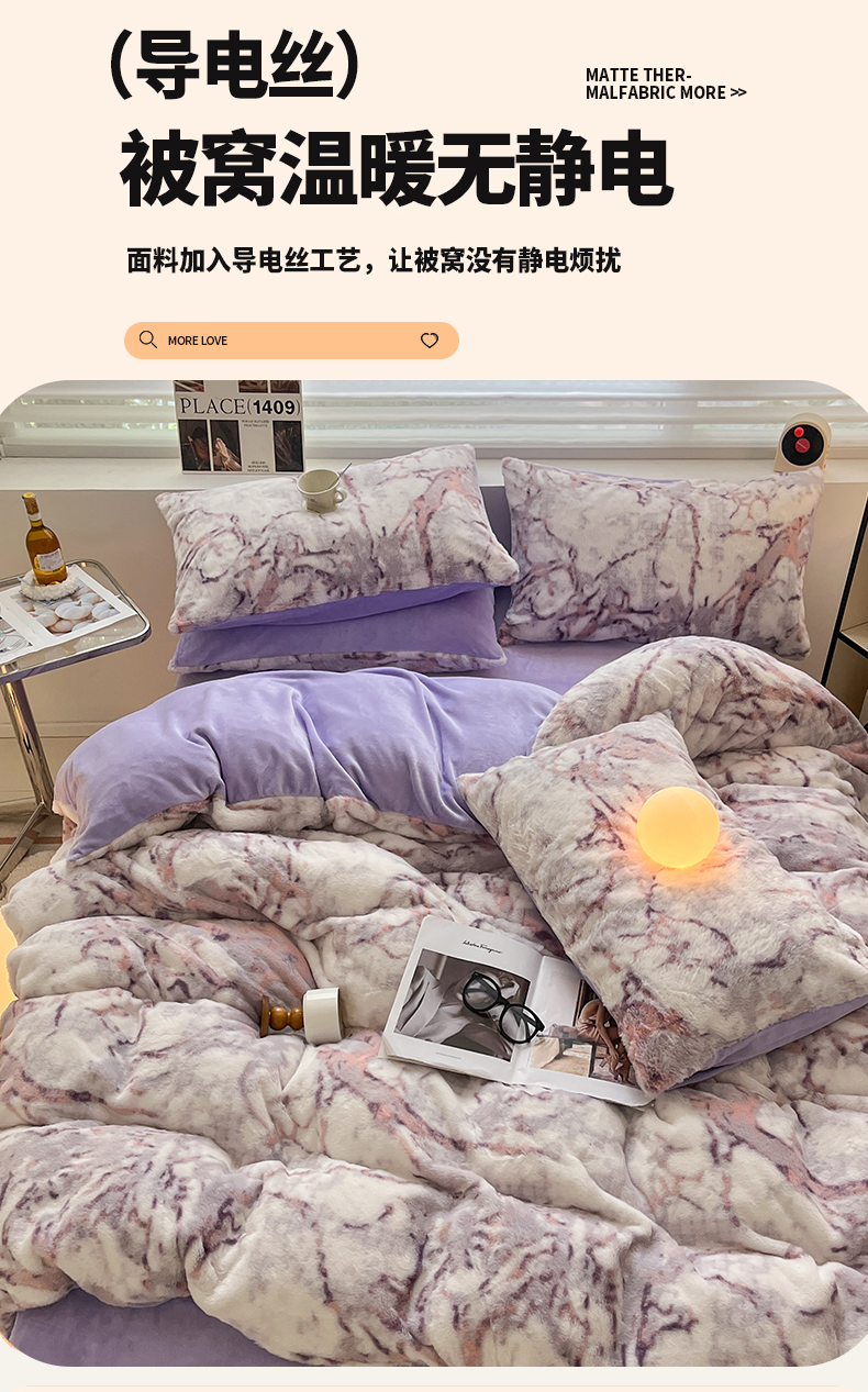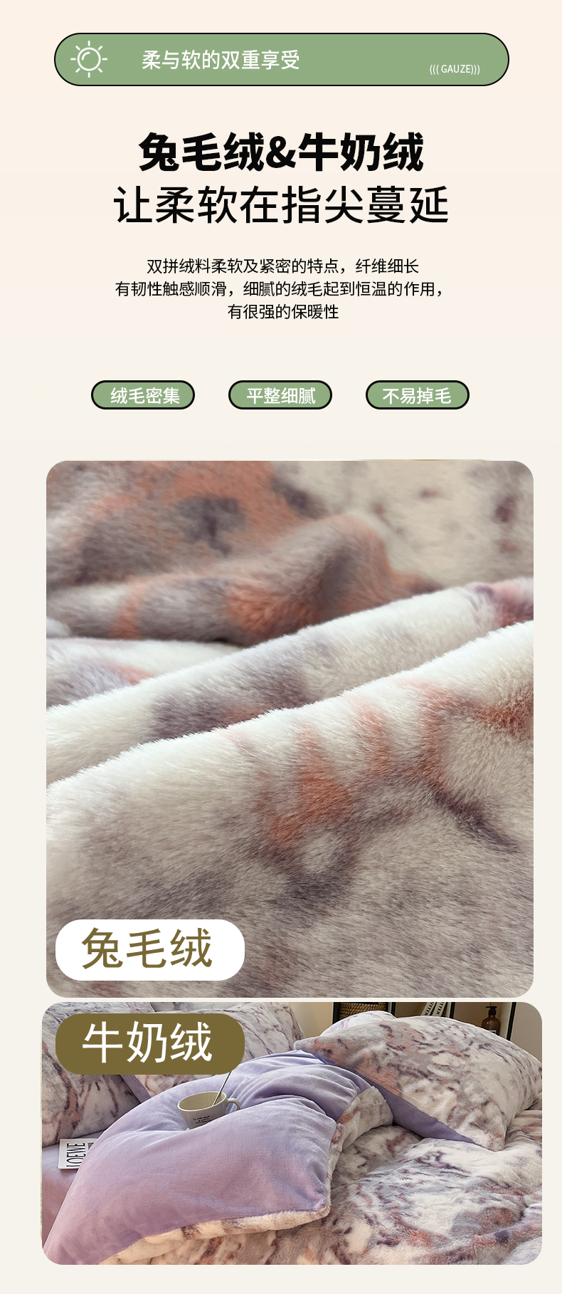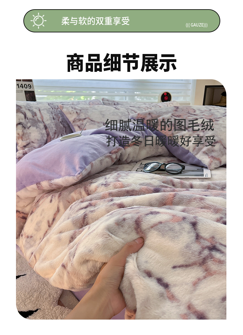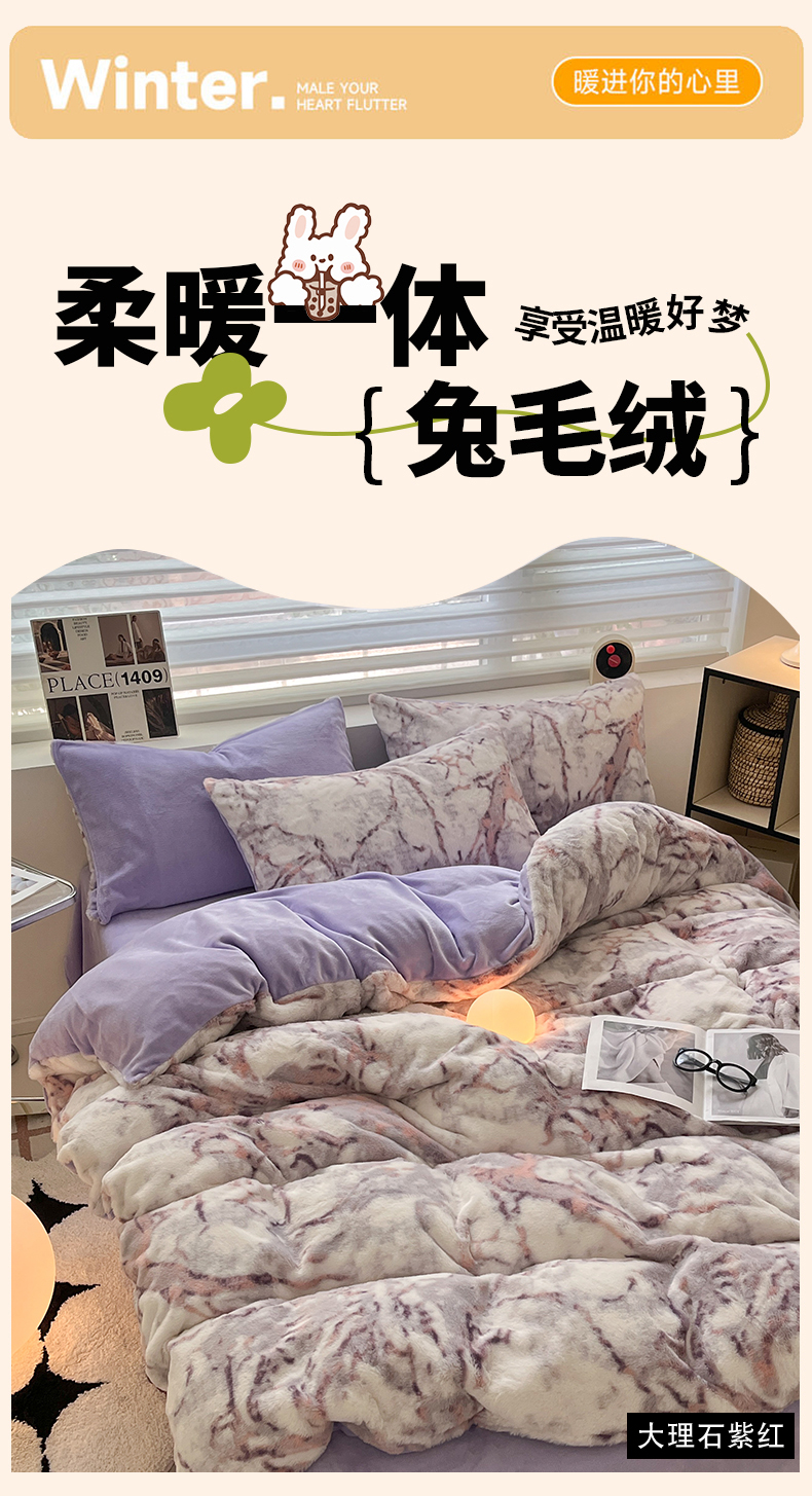 当前位置: 91家纺网 > 商品网购 > 床品套件 > 四件套 > 牛奶绒四件套 > 金爱家 2024新款立体牛奶绒兔毛绒印花四件套 兔毛印花-大理石紫红