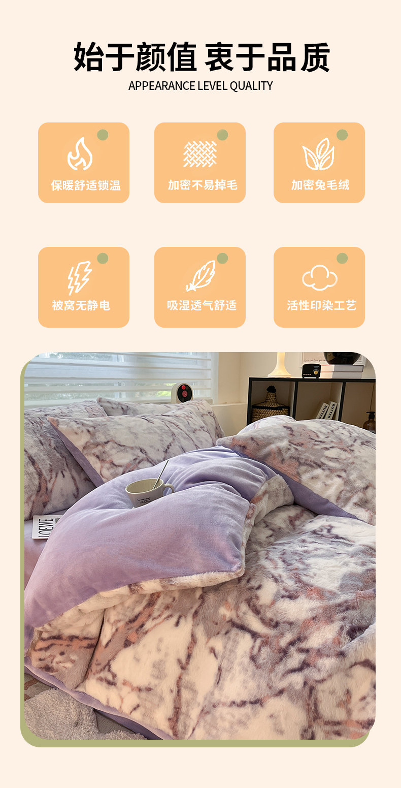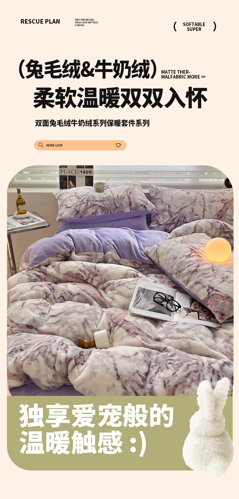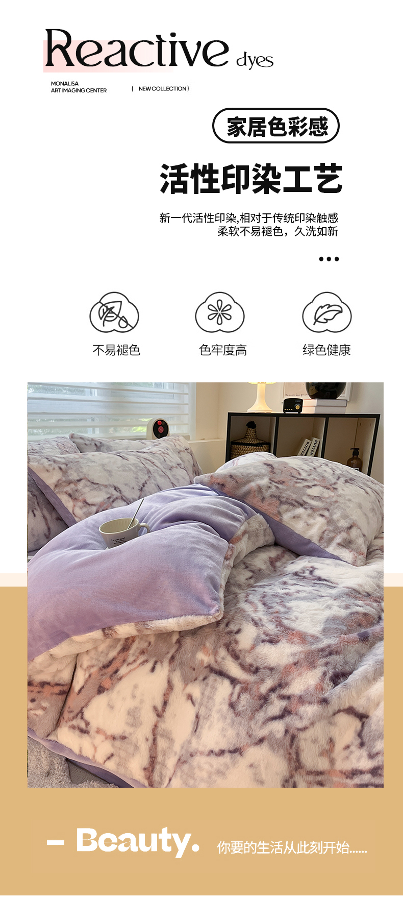 当前位置: 91家纺网 > 商品网购 > 床品套件 > 四件套 > 牛奶绒四件套 > 金爱家 2024新款立体牛奶绒兔毛绒印花四件套 兔毛印花-大理石紫红