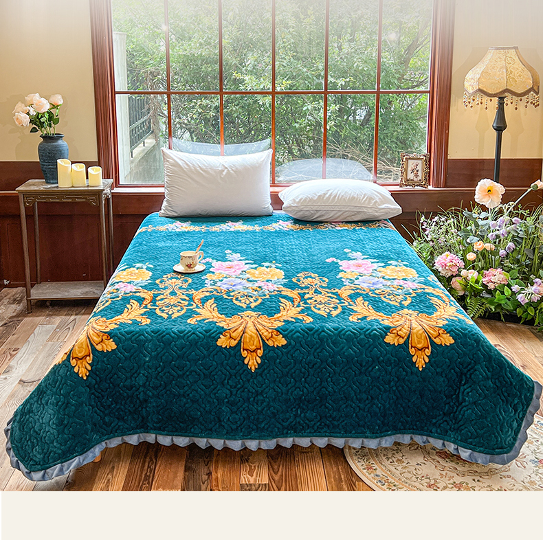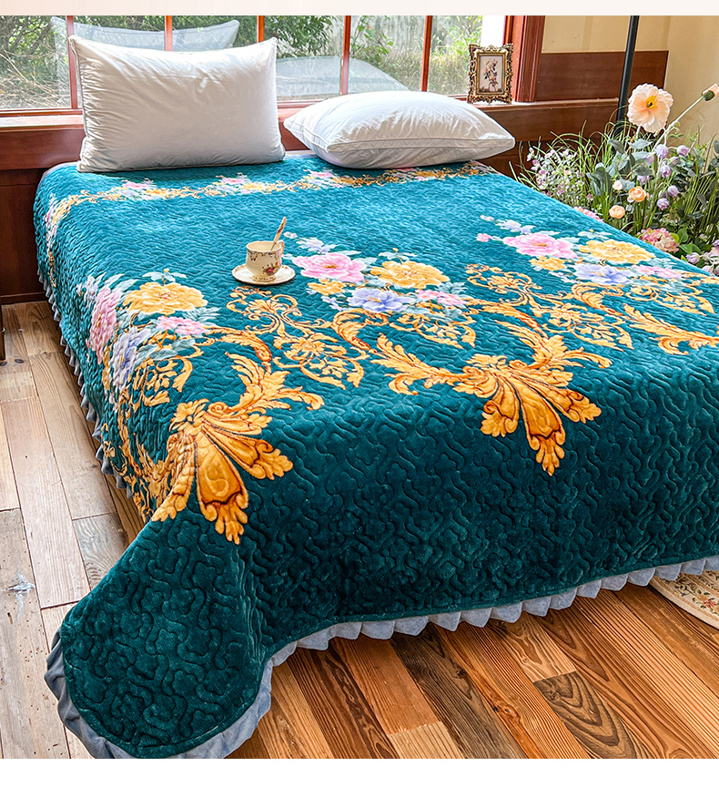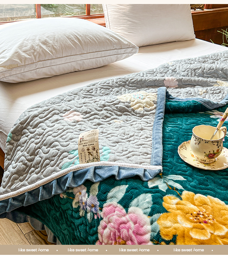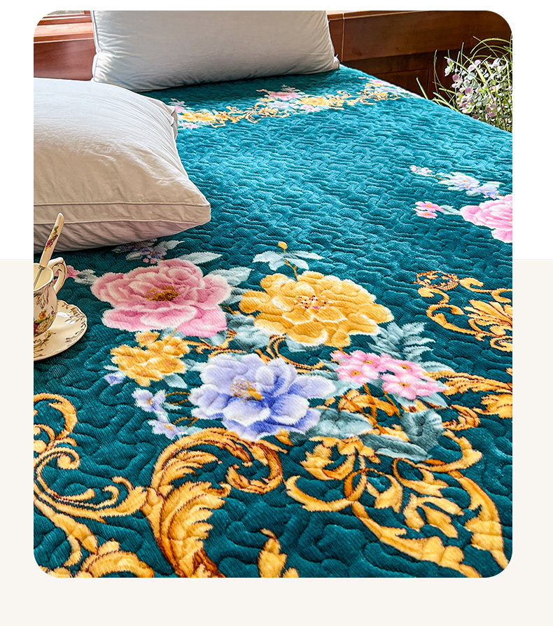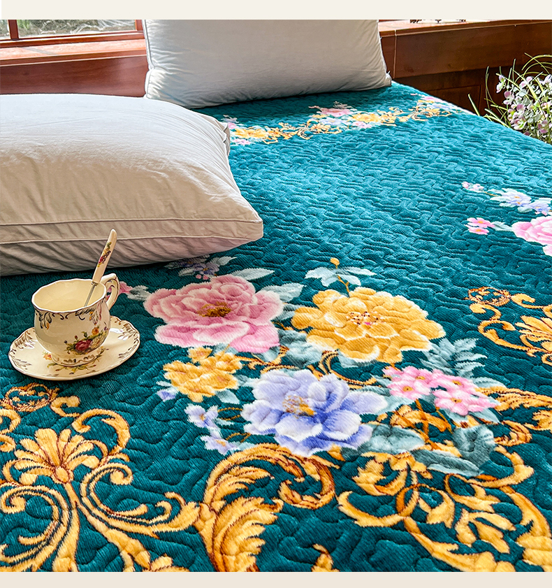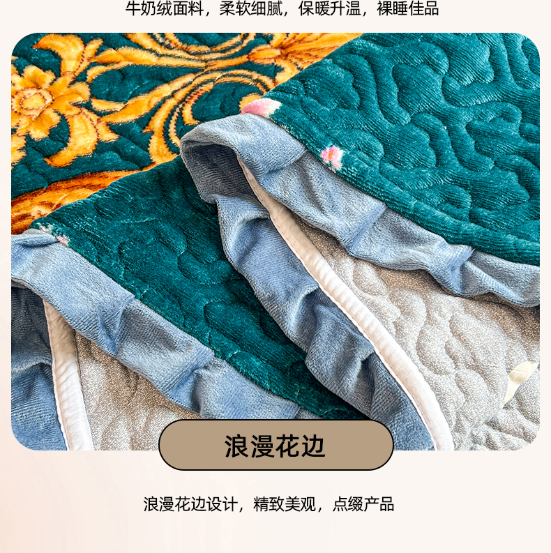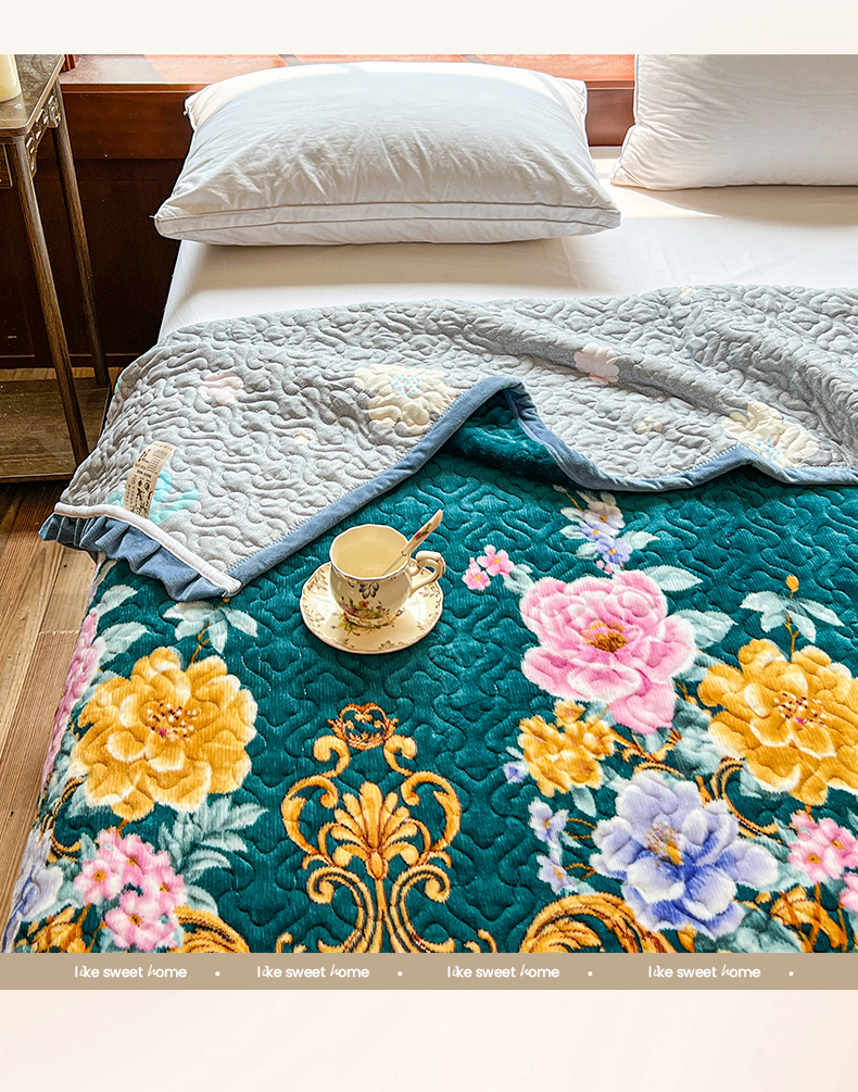 悦织湾家纺 2025新款印花牛奶绒花边夹棉床盖 雅韵风情