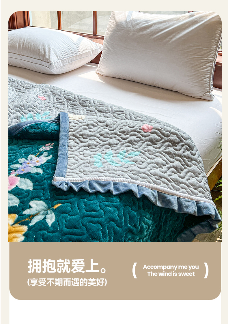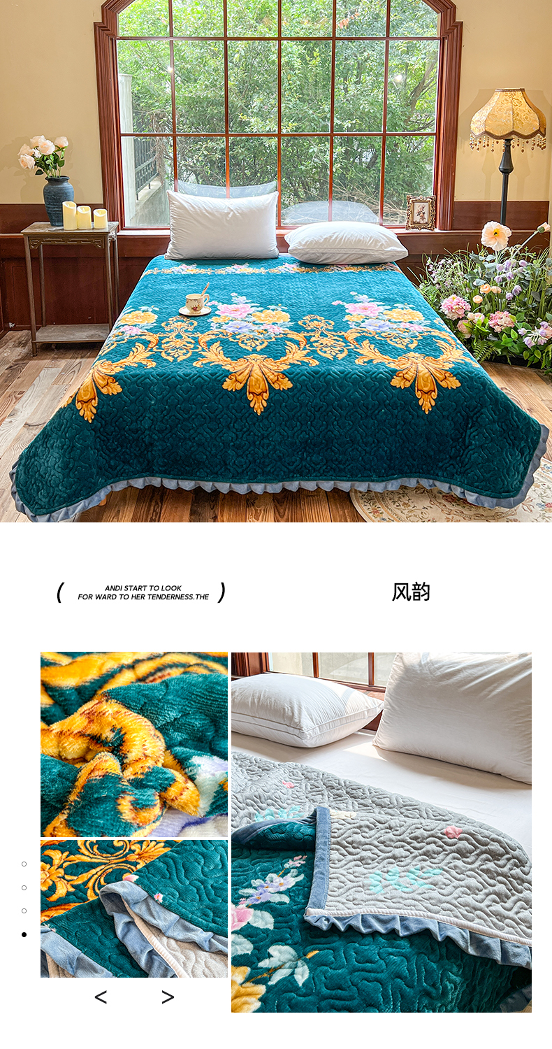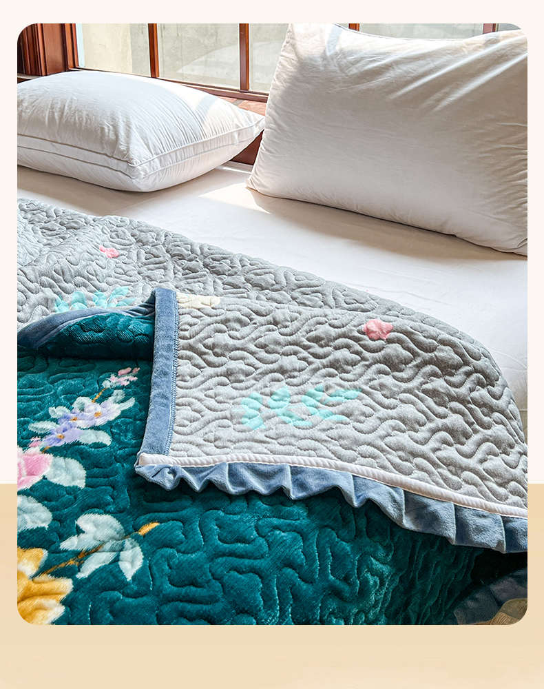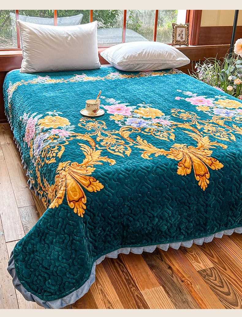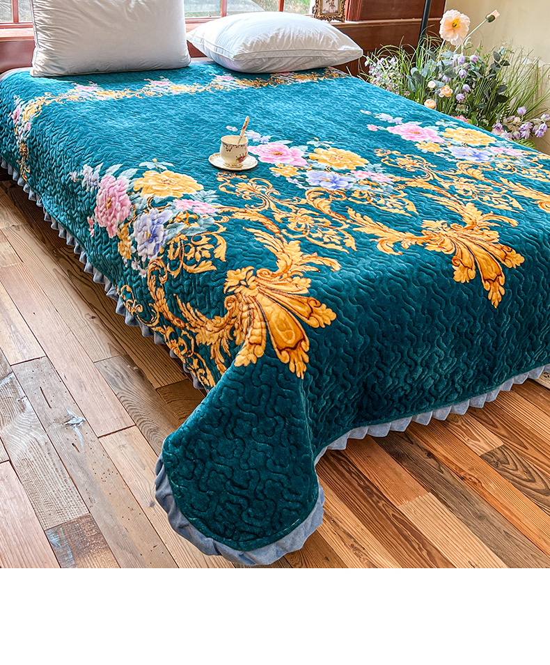 悦织湾家纺 2025新款印花牛奶绒花边夹棉床盖 雅韵风情