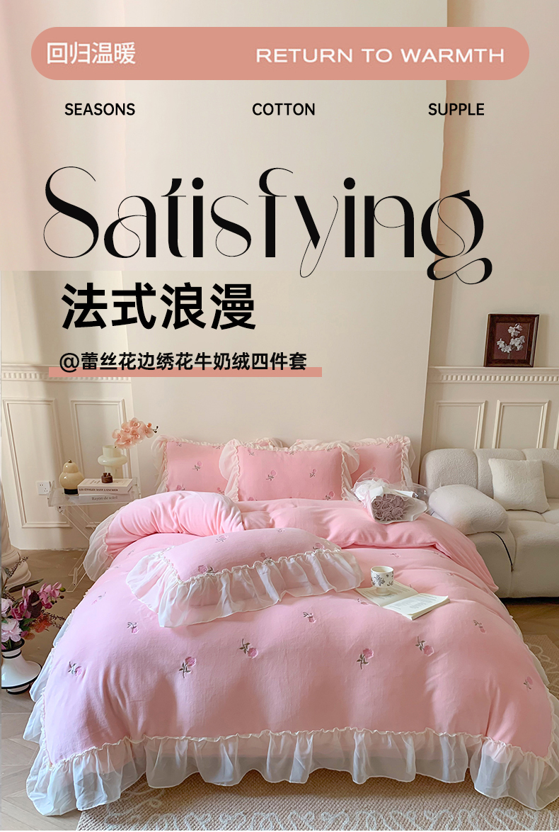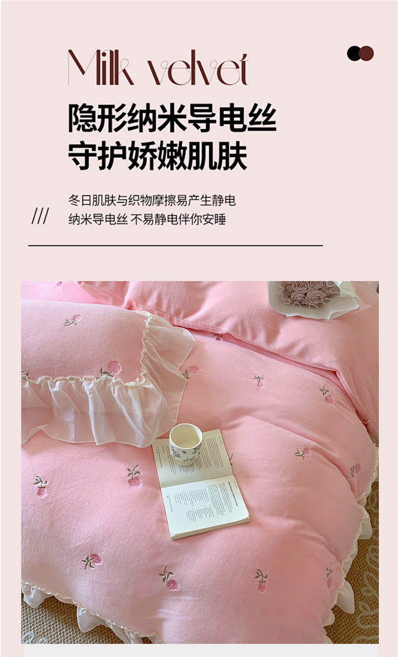 你好美丽 刺绣款200克牛奶绒四件套(含买家秀)花香四溢粉,花香四溢粉