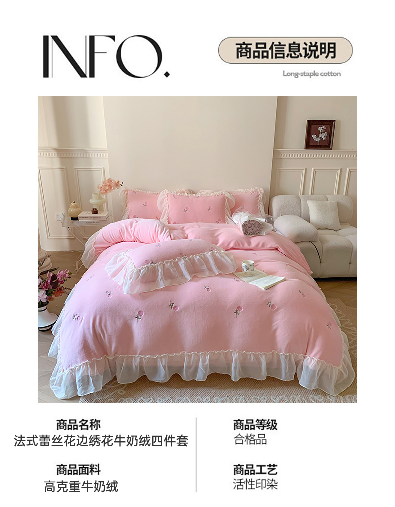 商品名称:(总)你好美丽 2025新款A类200克牛奶绒安娜满版刺绣花边四件套