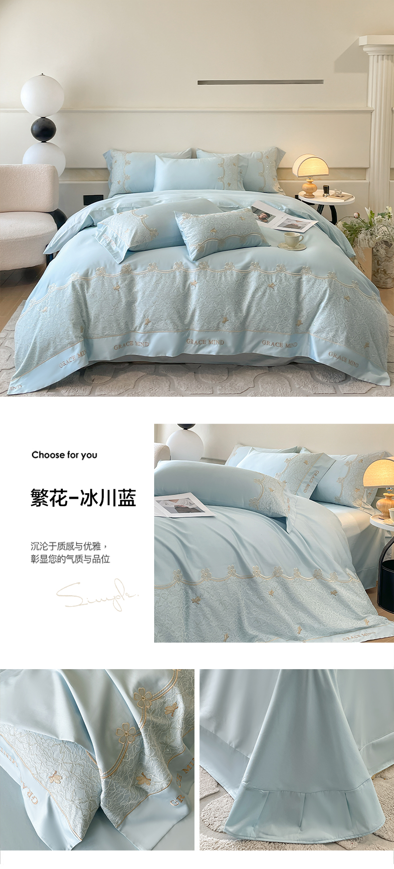 祺瑞佳家纺 2024新款A类100%双面纯棉法式蕾丝刺绣花四件套全棉长绒棉四季款床单床笠——繁花 繁花-冰川蓝