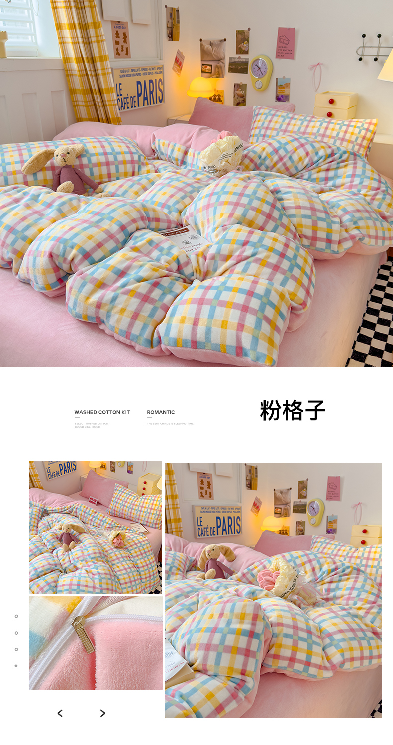 当前位置: 91家纺网 > 商品网购 > 床品套件 > 四件套 > 牛奶绒四件套 > 2024新款高克重亲肤牛奶绒四件套-场景二 粉格子