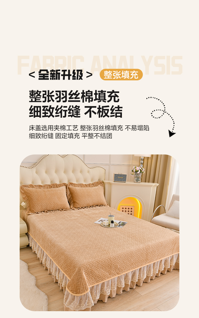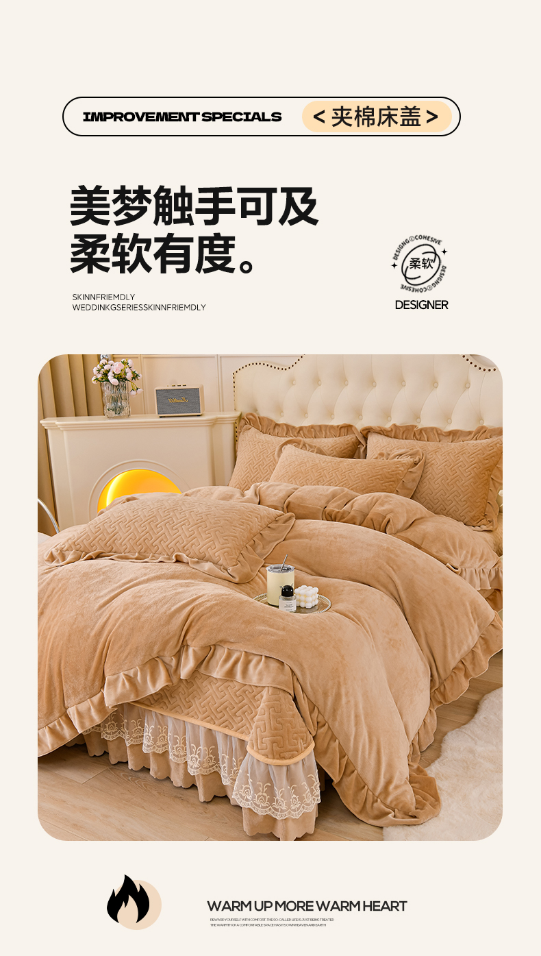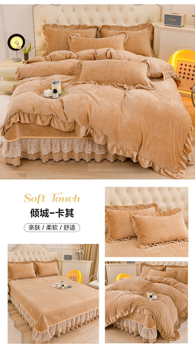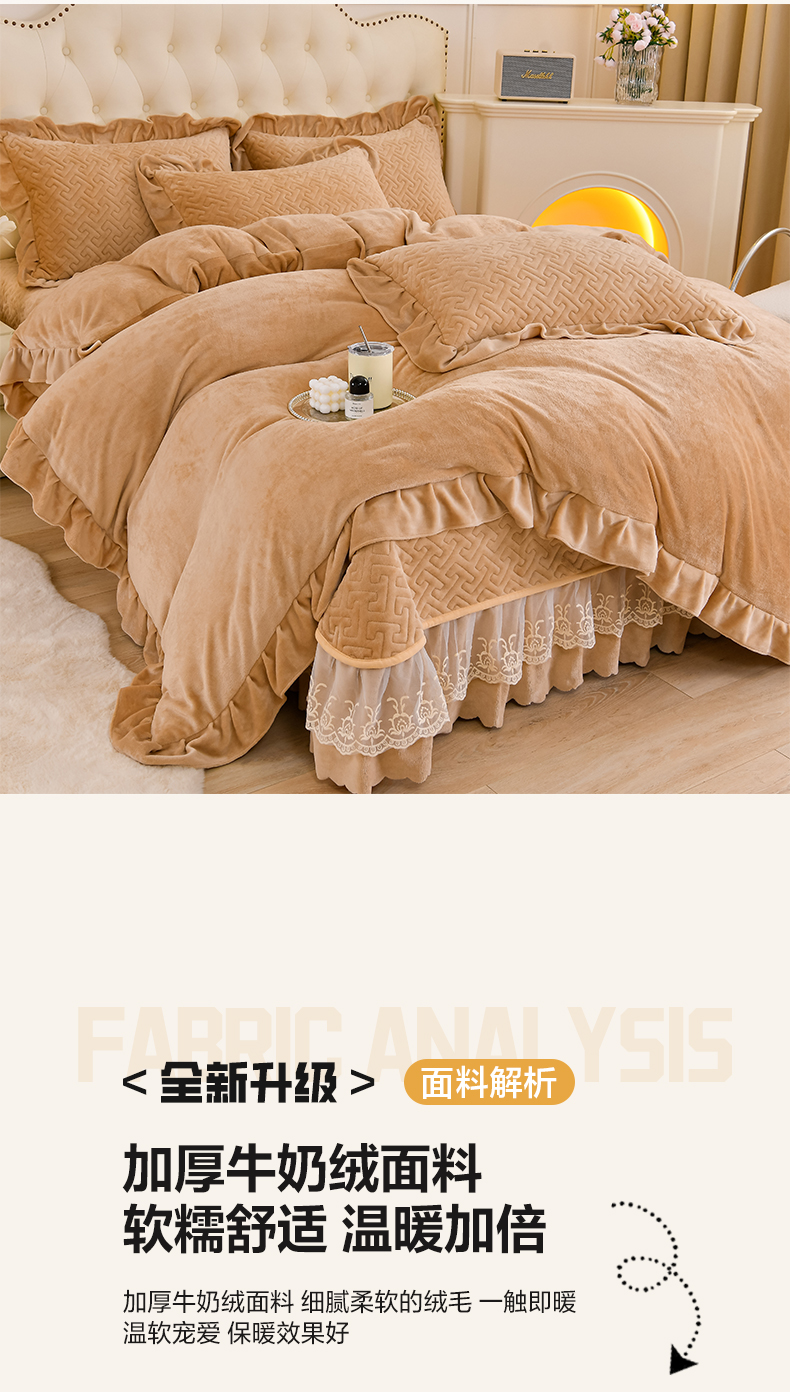 当前位置: 91家纺网 > 商品网购 > 床品套件 > 四件套 > 牛奶绒四件套 > 民新家纺 2025新款牛奶绒印花夹棉床盖四件套倾城-卡其