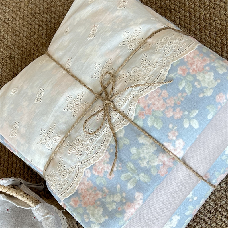 2024新款全棉印花双层纱四件套--蕾丝花边款繁园-蓝