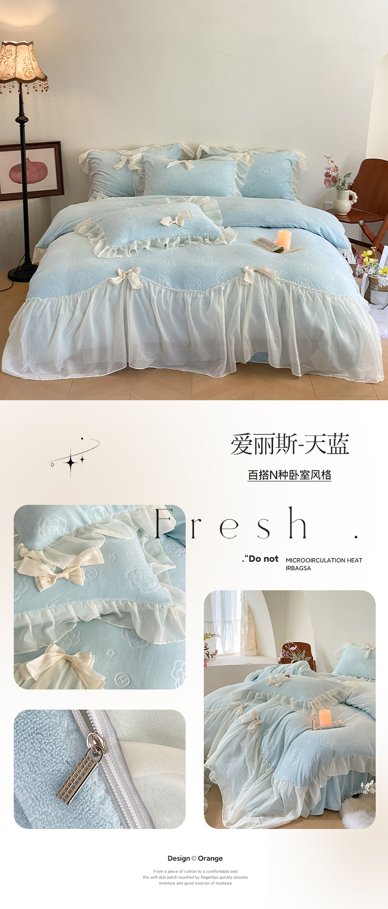 当前位置: 91家纺网 > 商品网购 > 床品套件 > 四件套 > 牛奶绒四件套 > 逸尚阁 2024新款雕花牛奶绒花边四件套-爱丽斯 爱丽斯-天蓝