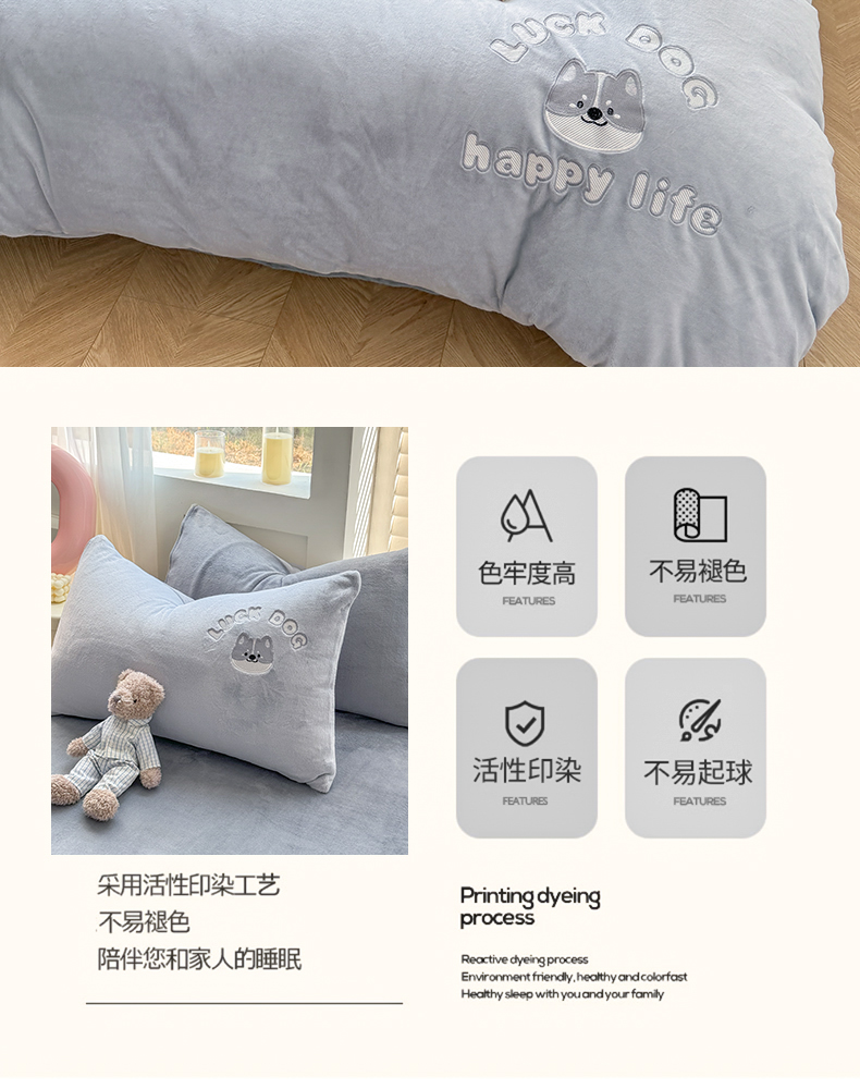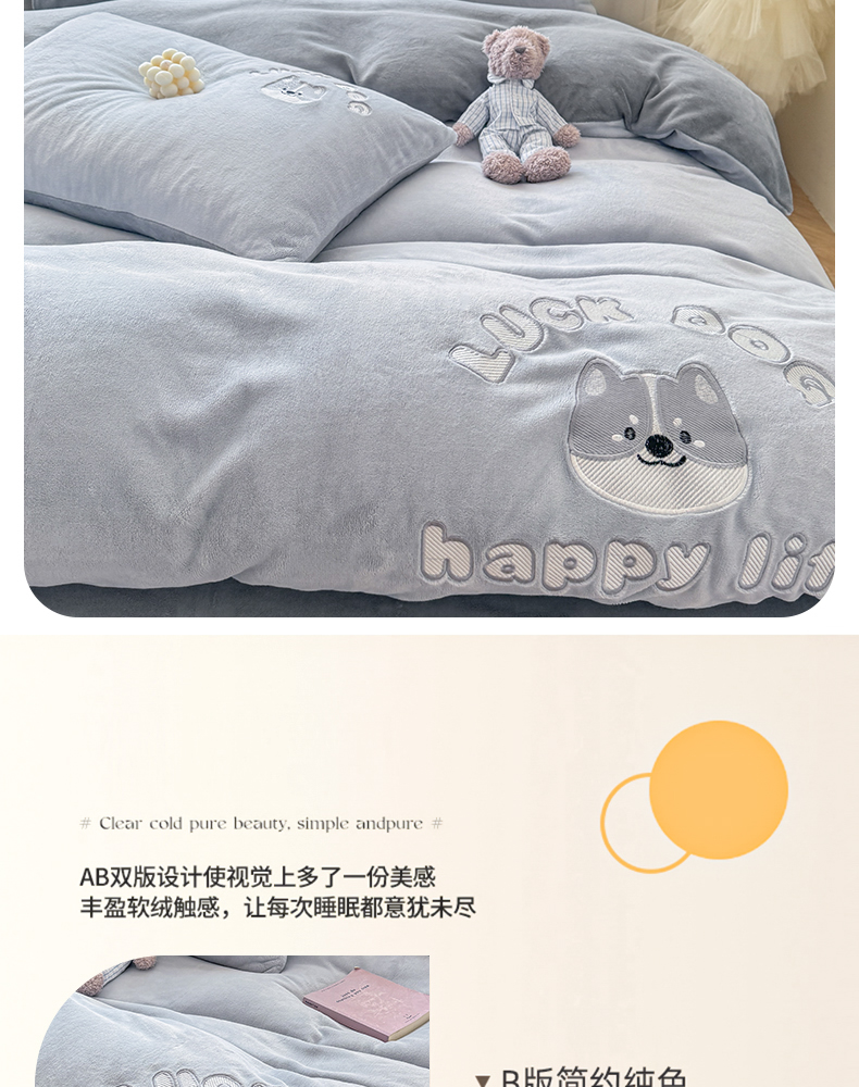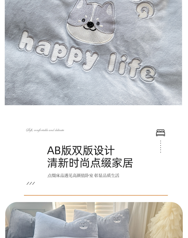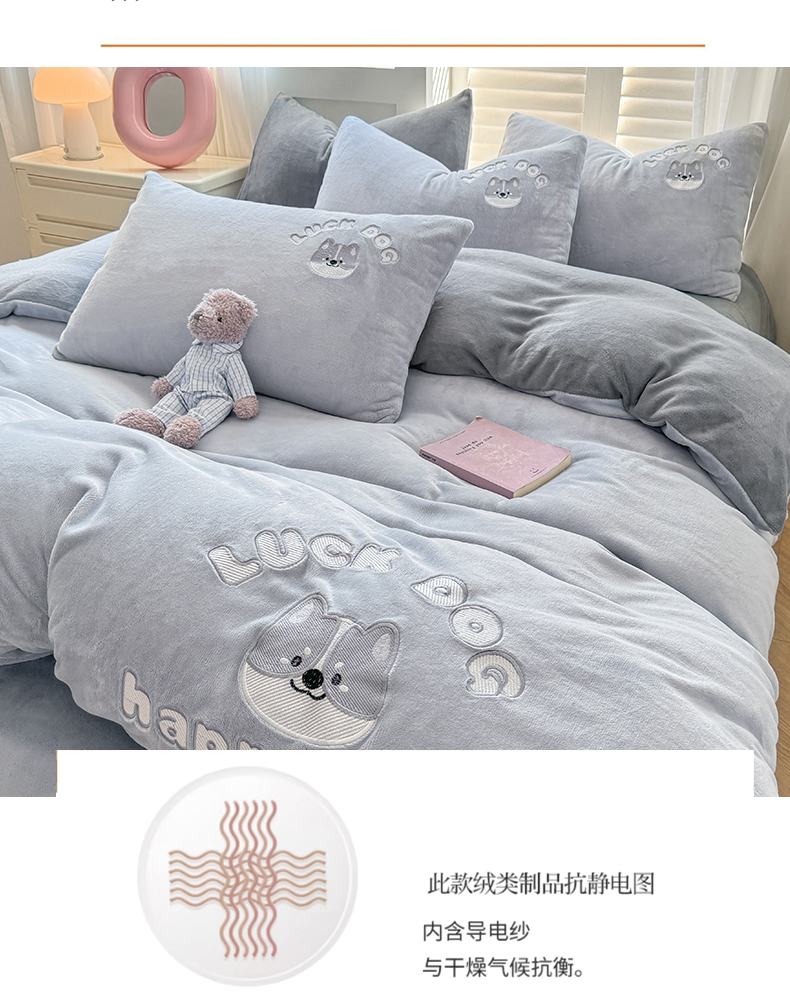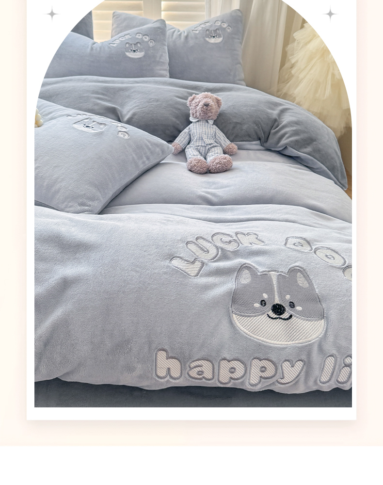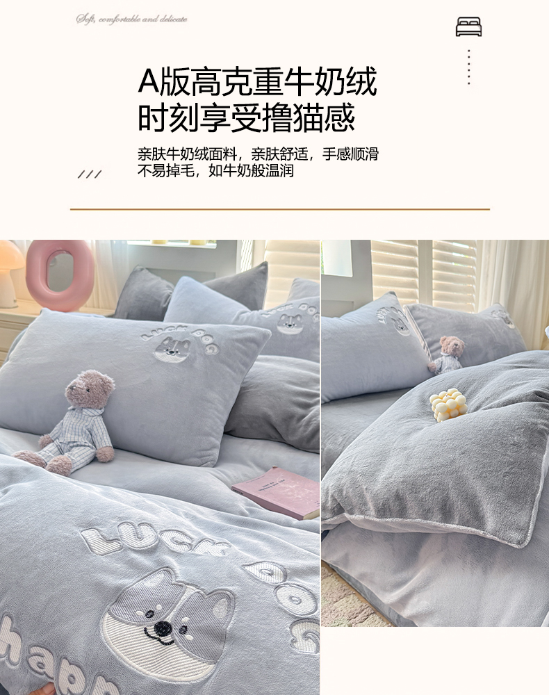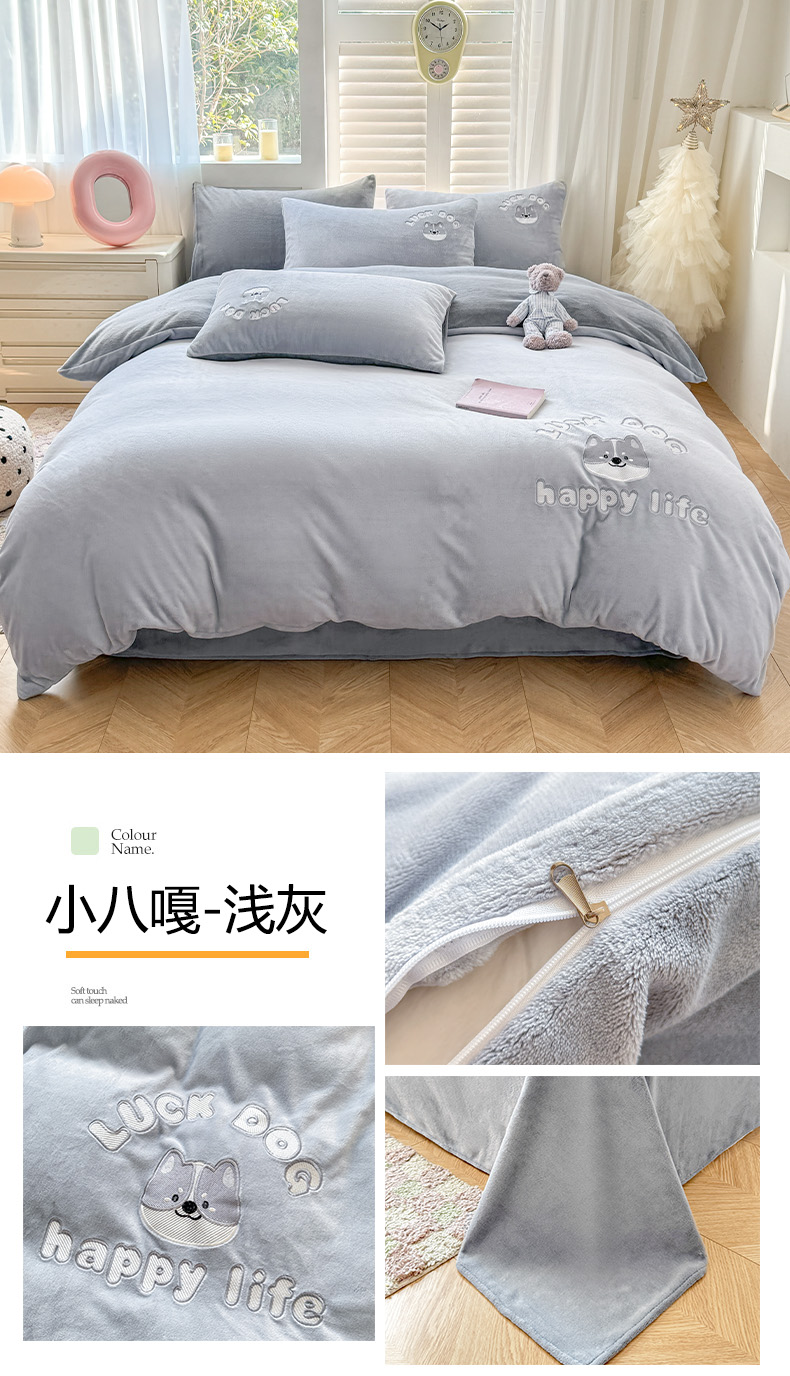 商品名称:梦舒羽 2025新款高克重小清新牛奶绒四件套冬季法莱绒珊瑚绒-刺绣小狗系列(风格一) 小八嘎-浅灰太空灰
