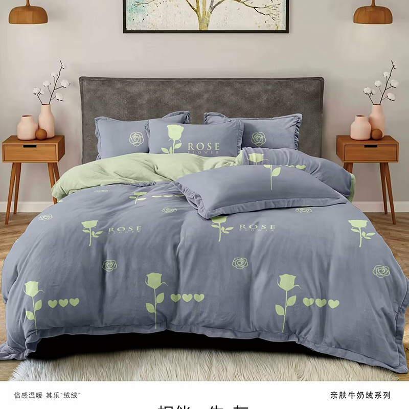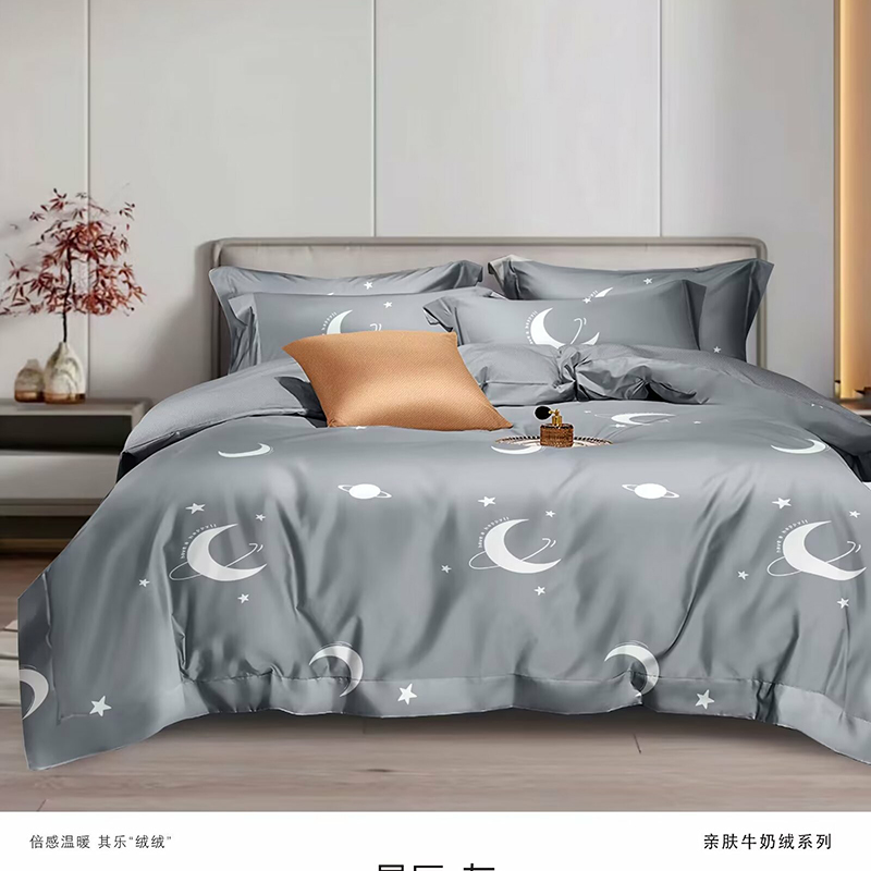 商品名称:优纤家纺 2024新款加厚保暖牛奶绒印花四件套 平安果-灰