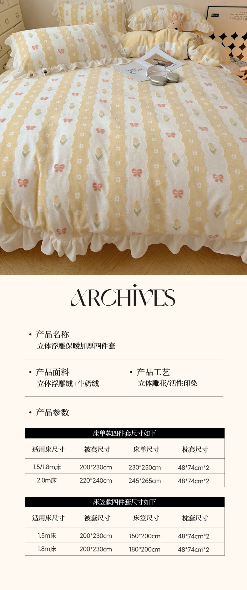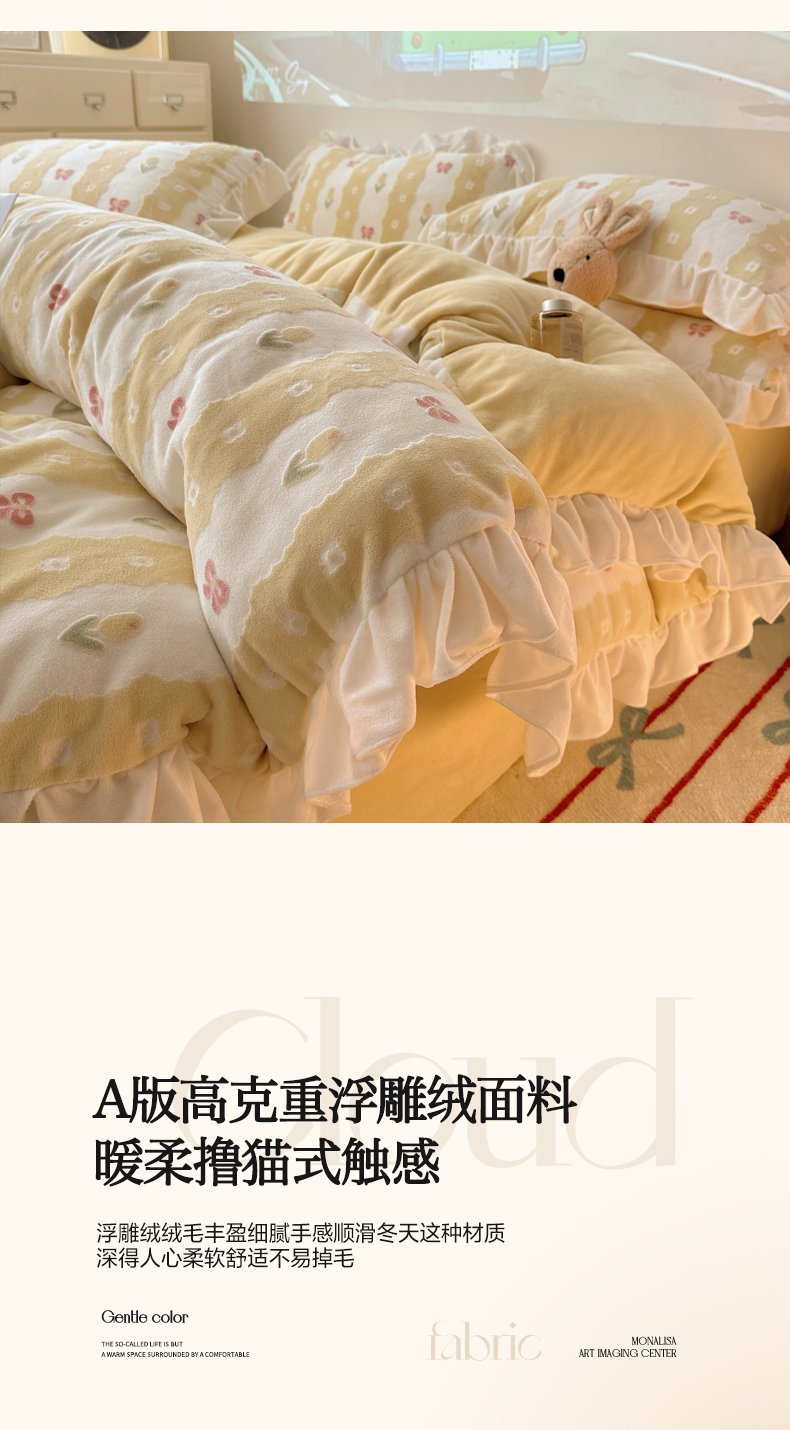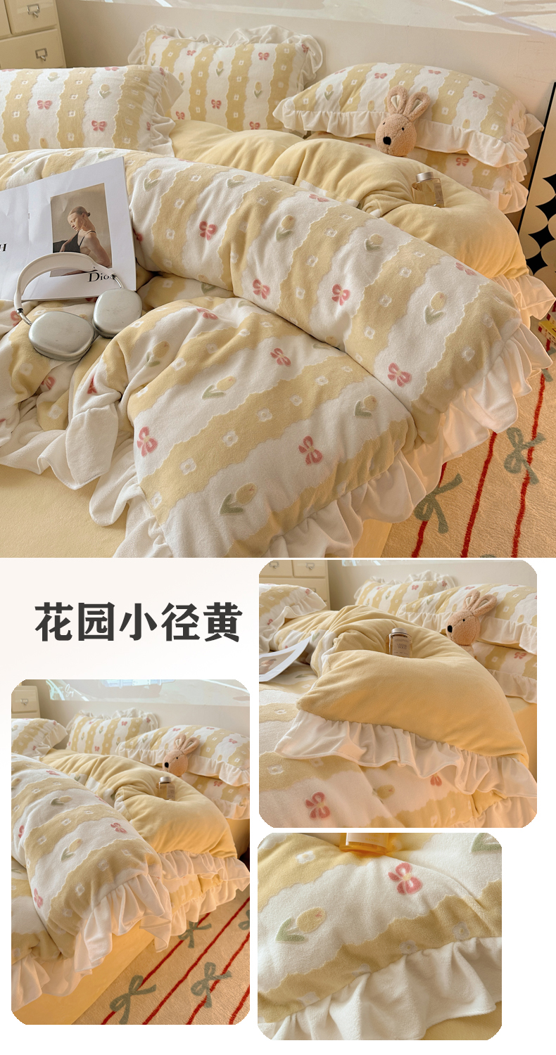 商品名称:三朵家纺 2024新款3D立体浮雕花边保暖加厚四件套 花园小径黄