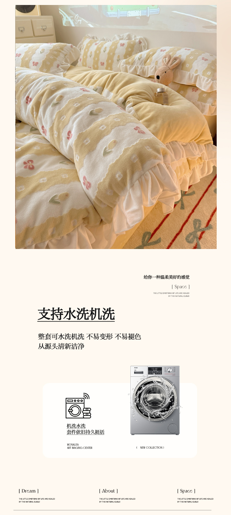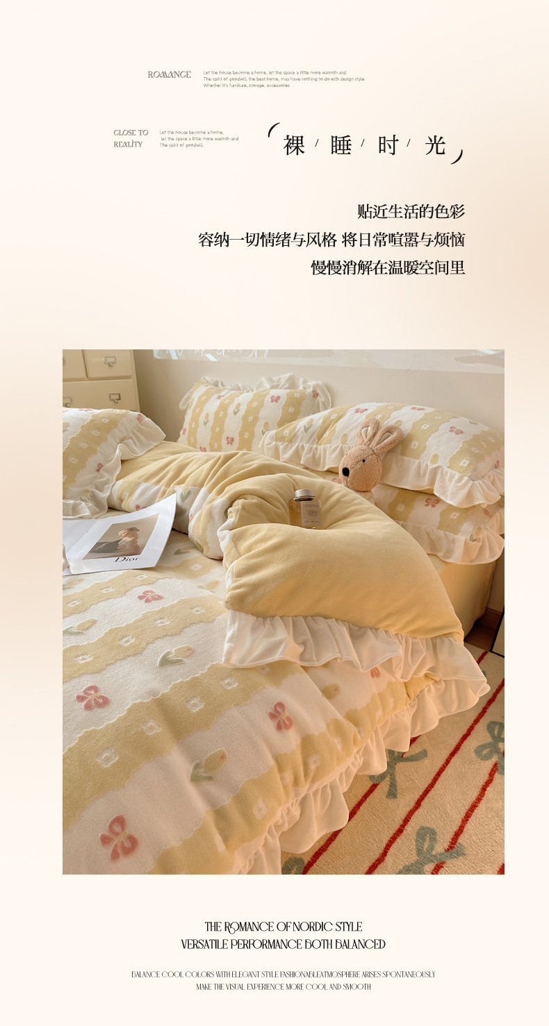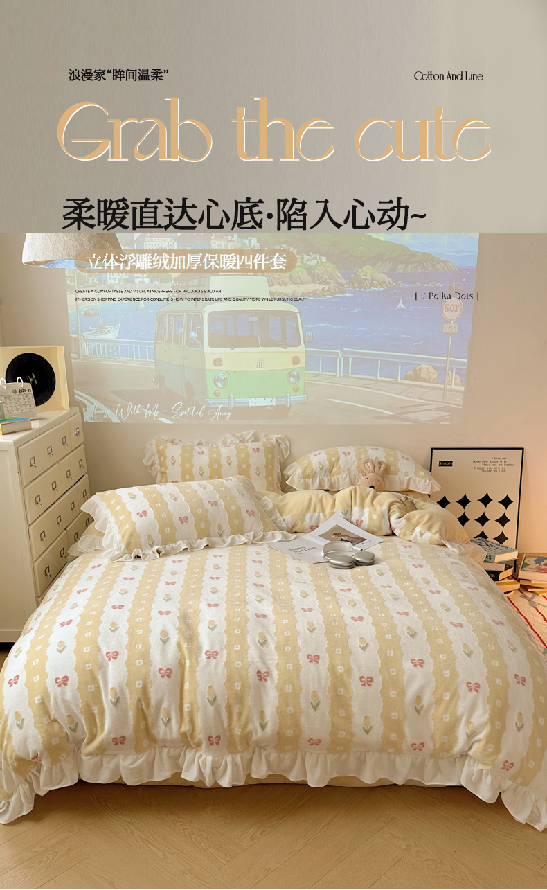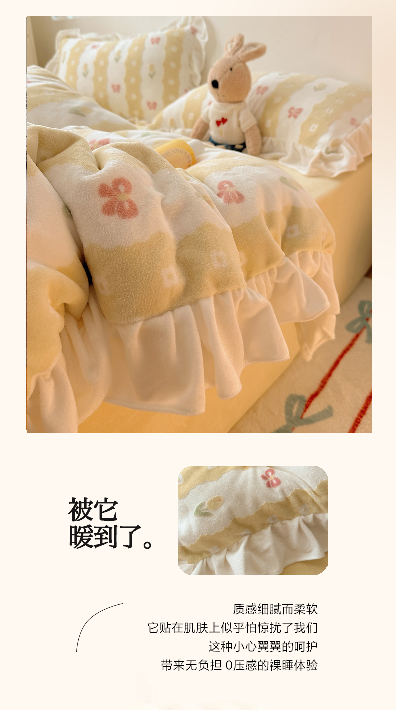 商品名称:三朵家纺 2024新款3D立体浮雕花边保暖加厚四件套 花园小径黄