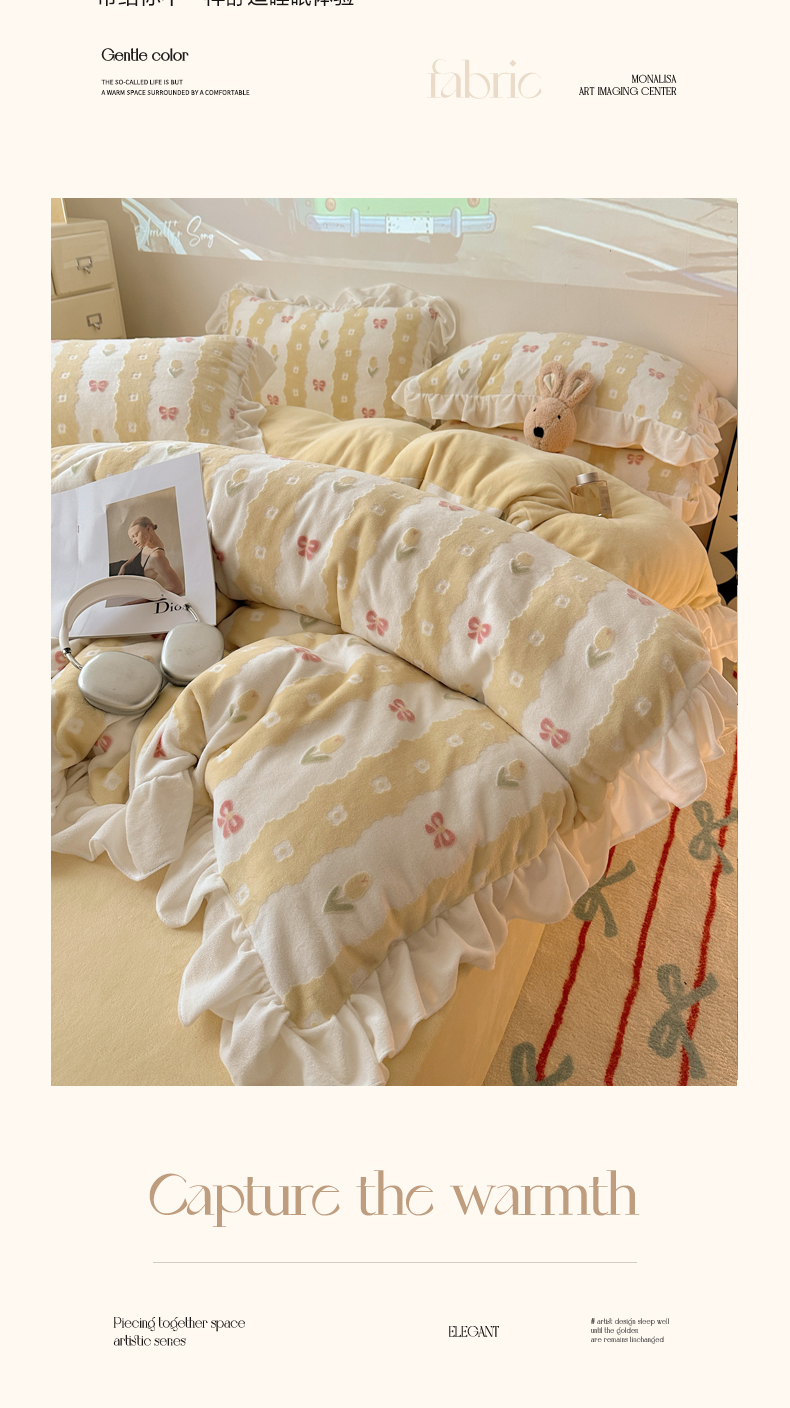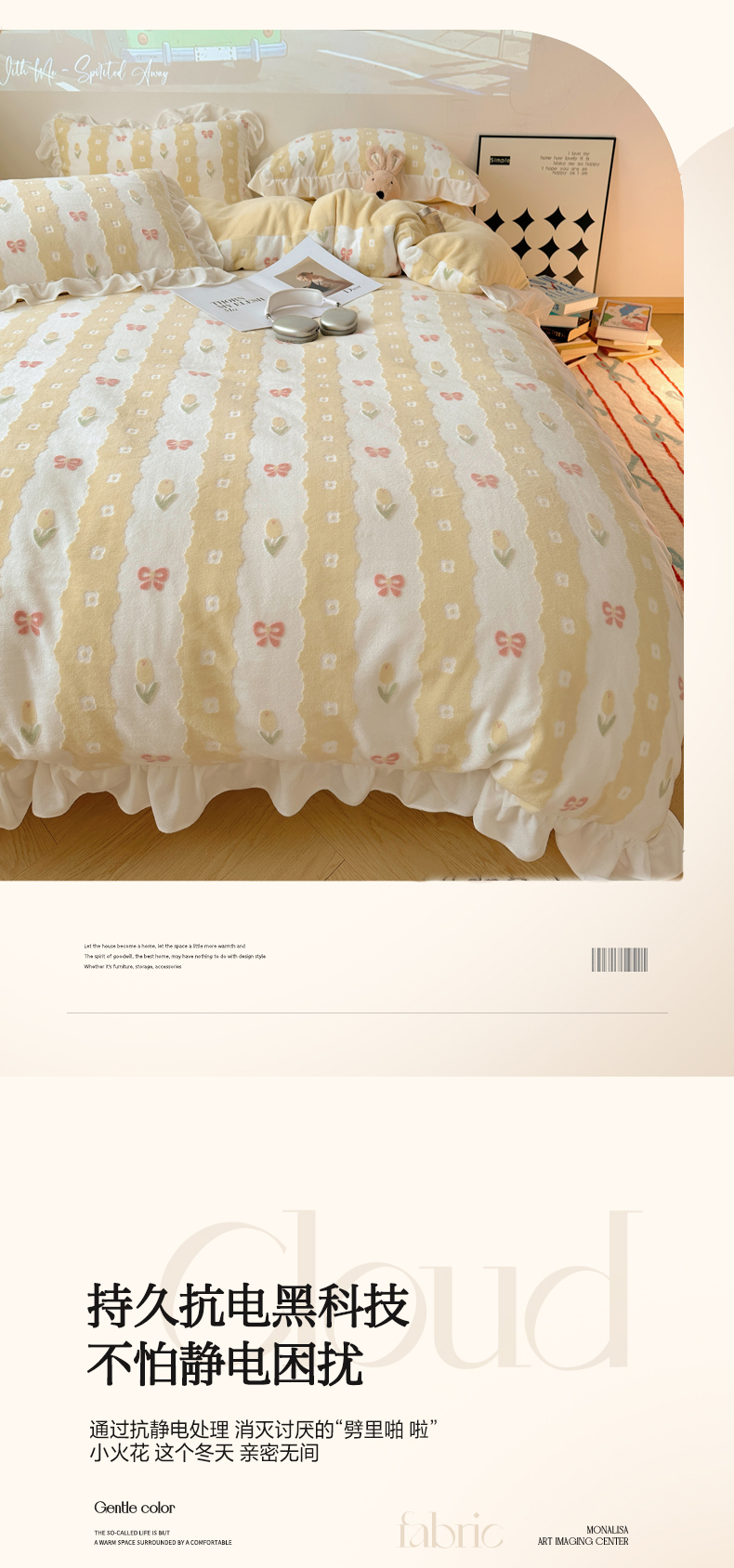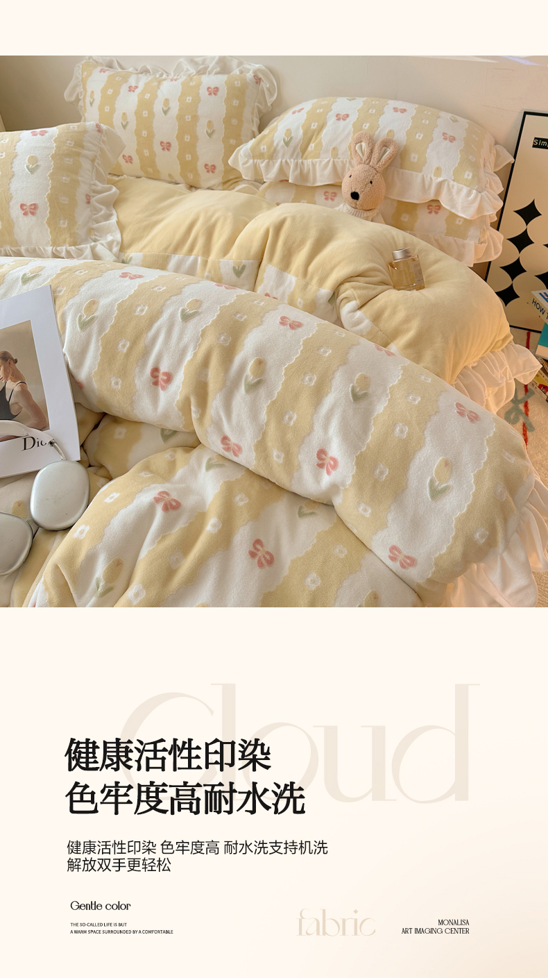 三朵家纺 2024新款3D立体浮雕花边保暖加厚四件套 花园小径黄