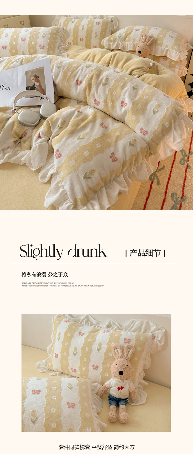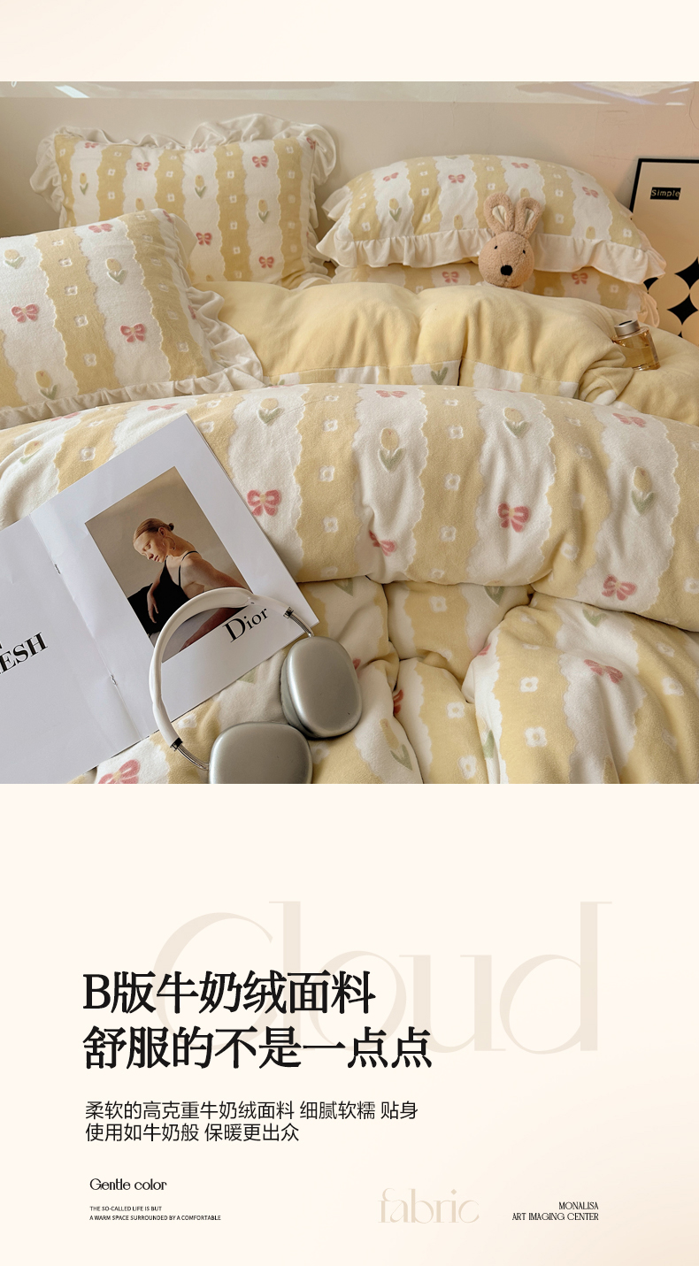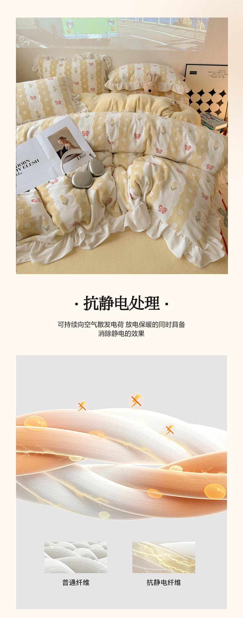 三朵家纺 2024新款3D立体浮雕花边保暖加厚四件套 花园小径黄