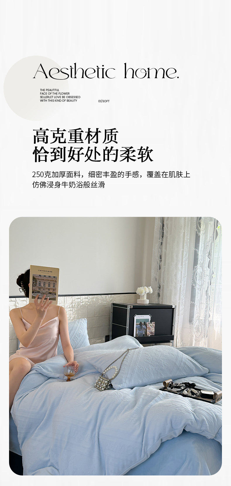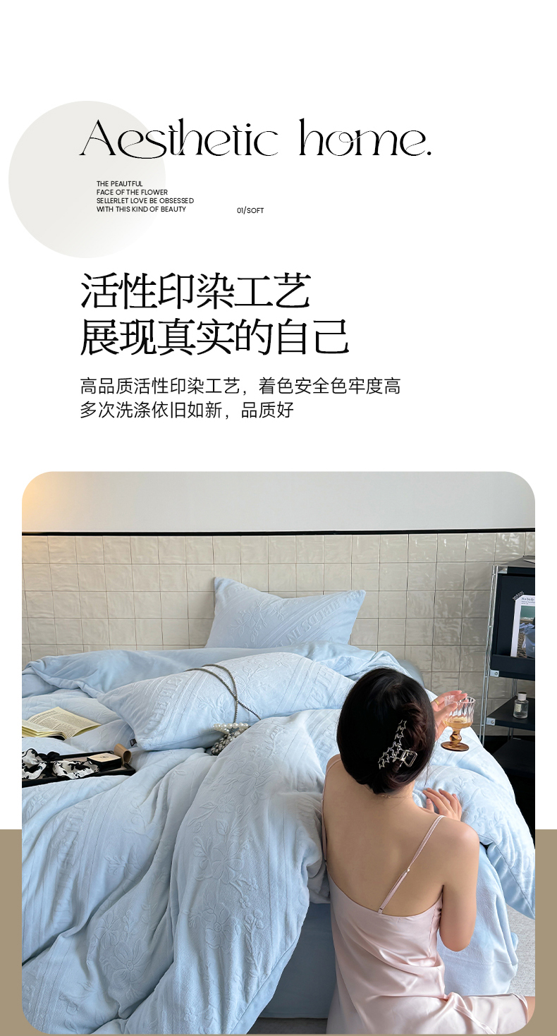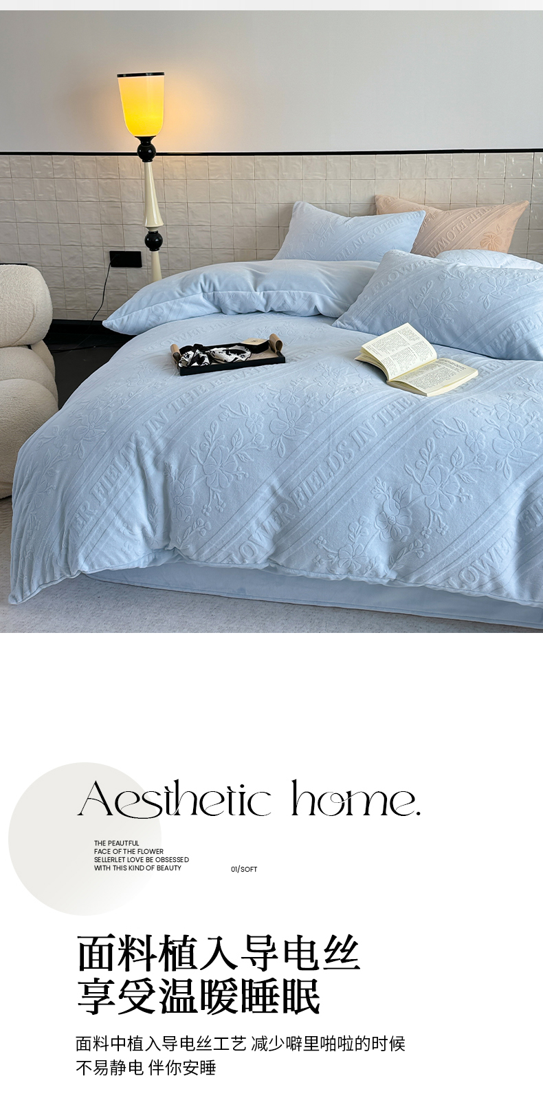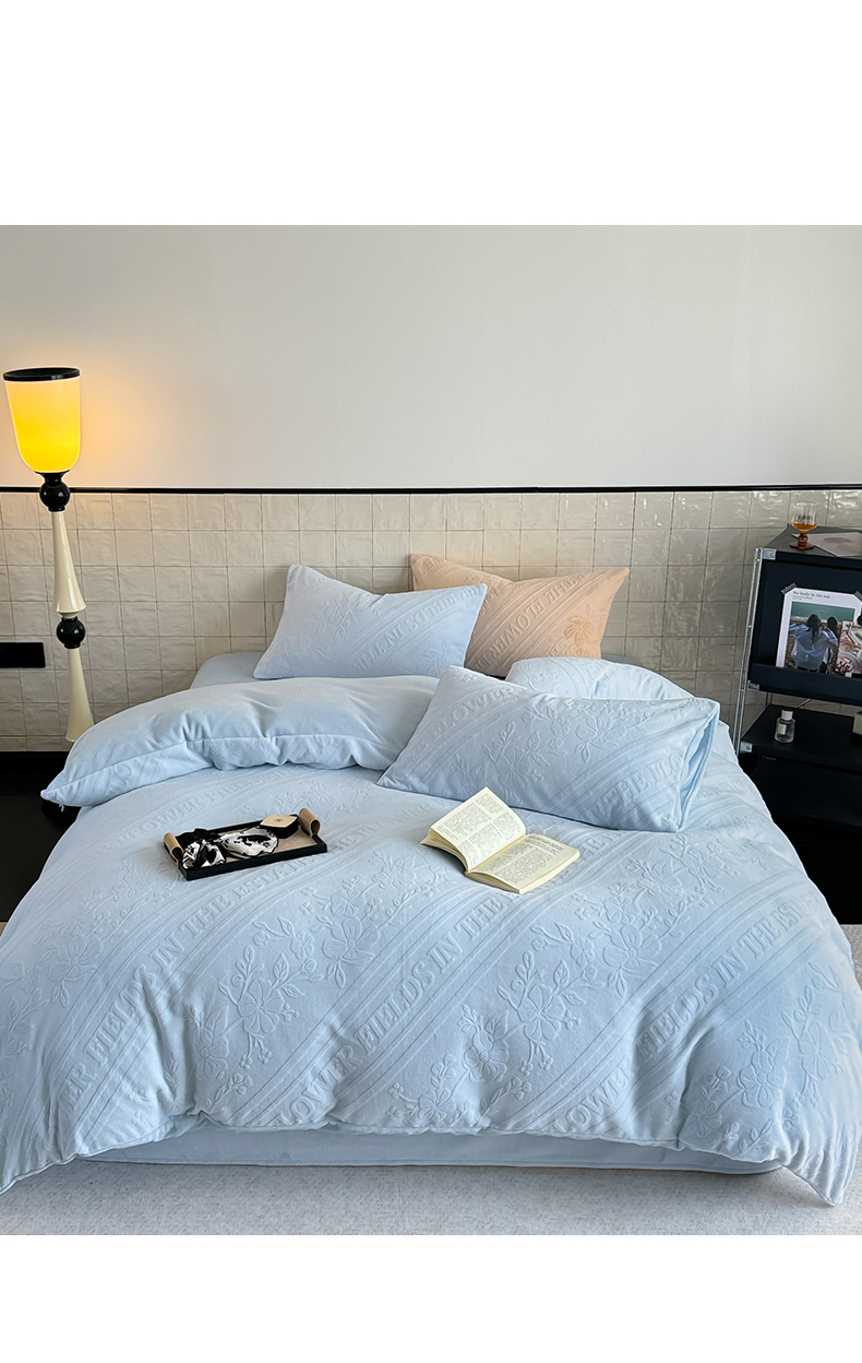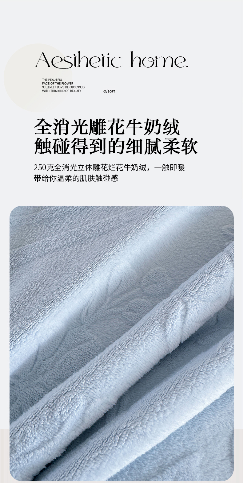 商品名称:若未家居 LOVEWE HOUSE 2025新款AB版250克全消光立体雕花烂花牛奶绒四件套-蝶舞 英文花开-浅天蓝