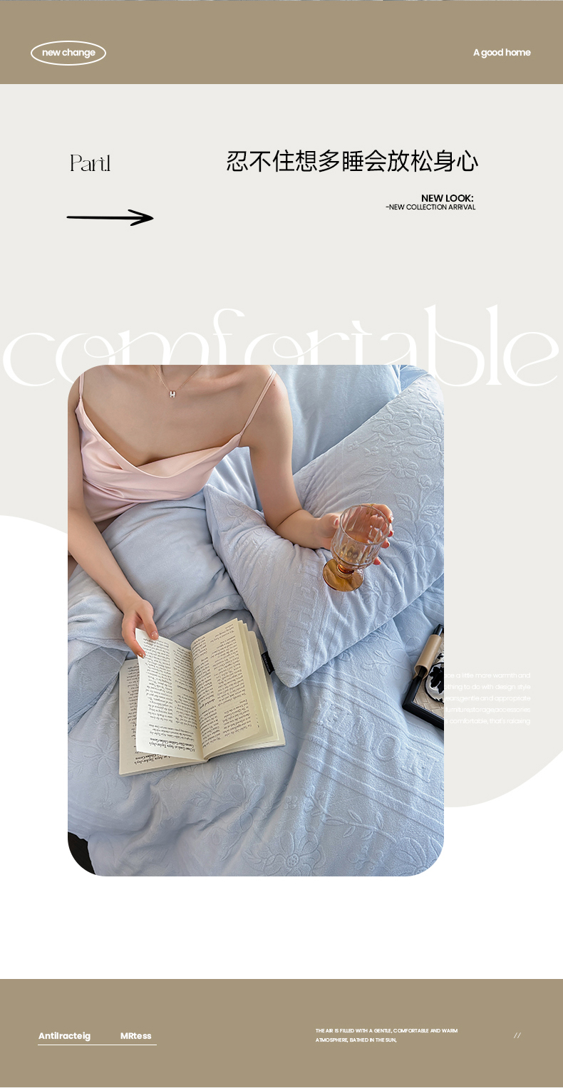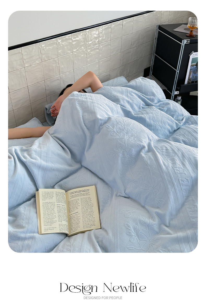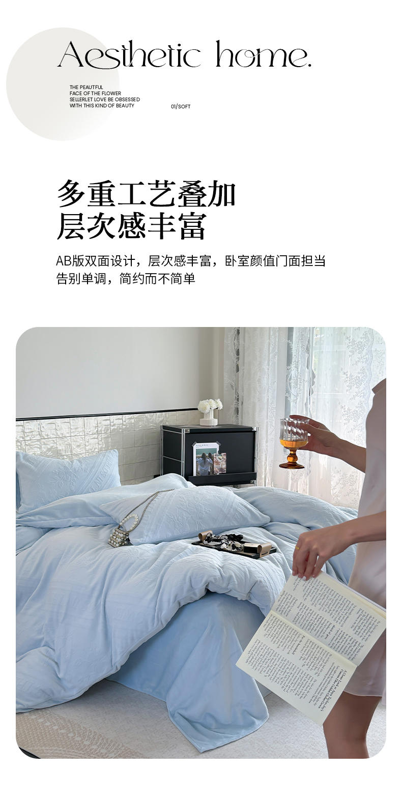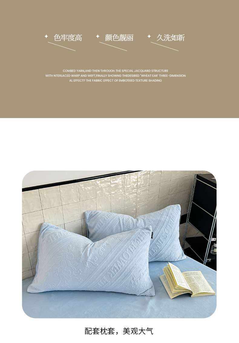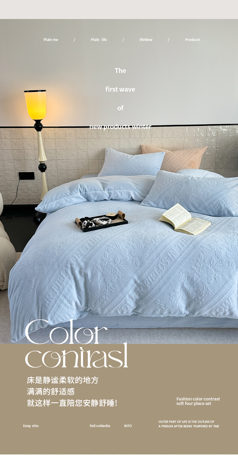 商品名称:若未家居 LOVEWE HOUSE 2025新款AB版250克全消光立体雕花烂花牛奶绒四件套-蝶舞 英文花开-浅天蓝