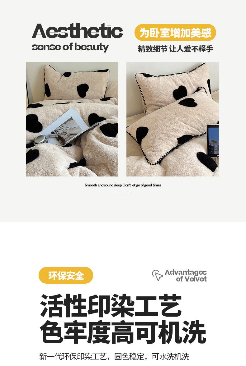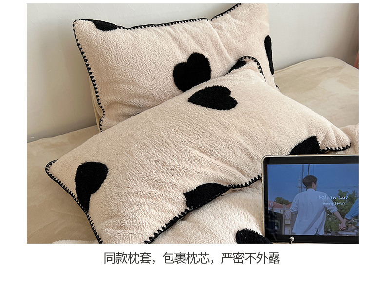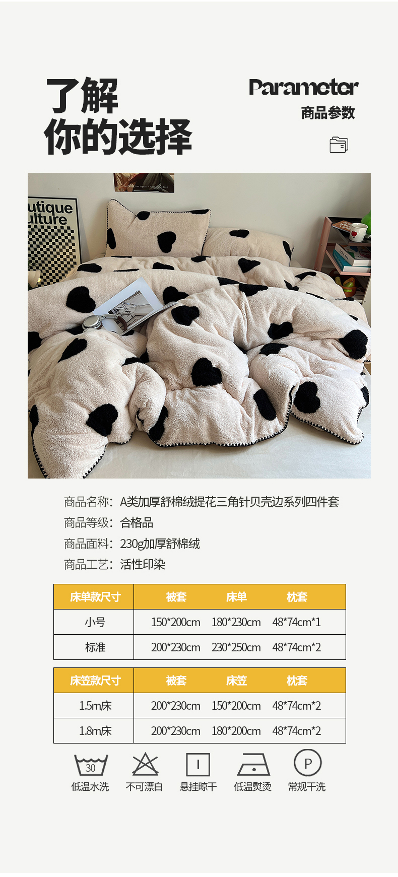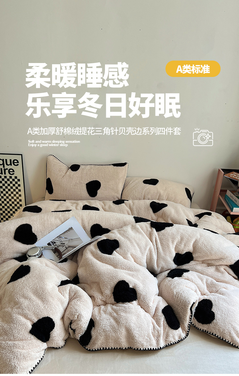 当前位置: 91家纺网 > 商品网购 > 床品套件 > 四件套 > 牛奶绒四件套 > 桃子家居 2024新款A类加厚美拉德温暖治愈风舒棉绒黑纱阳离子提花三角针贝壳边牛奶绒系列四件套 绒三角针-美拉德爱心