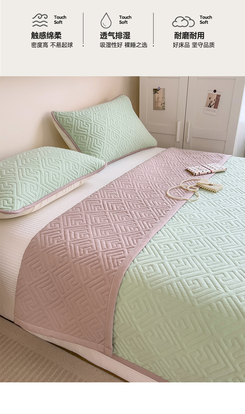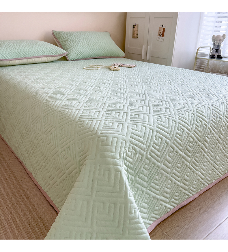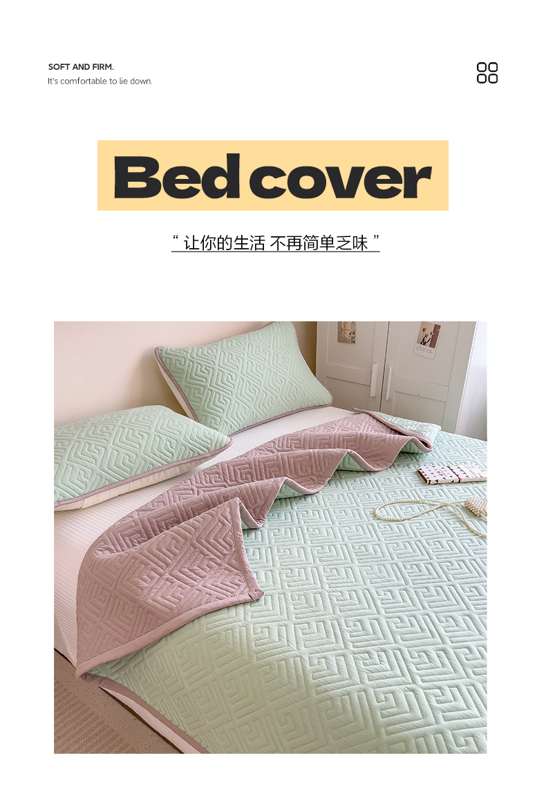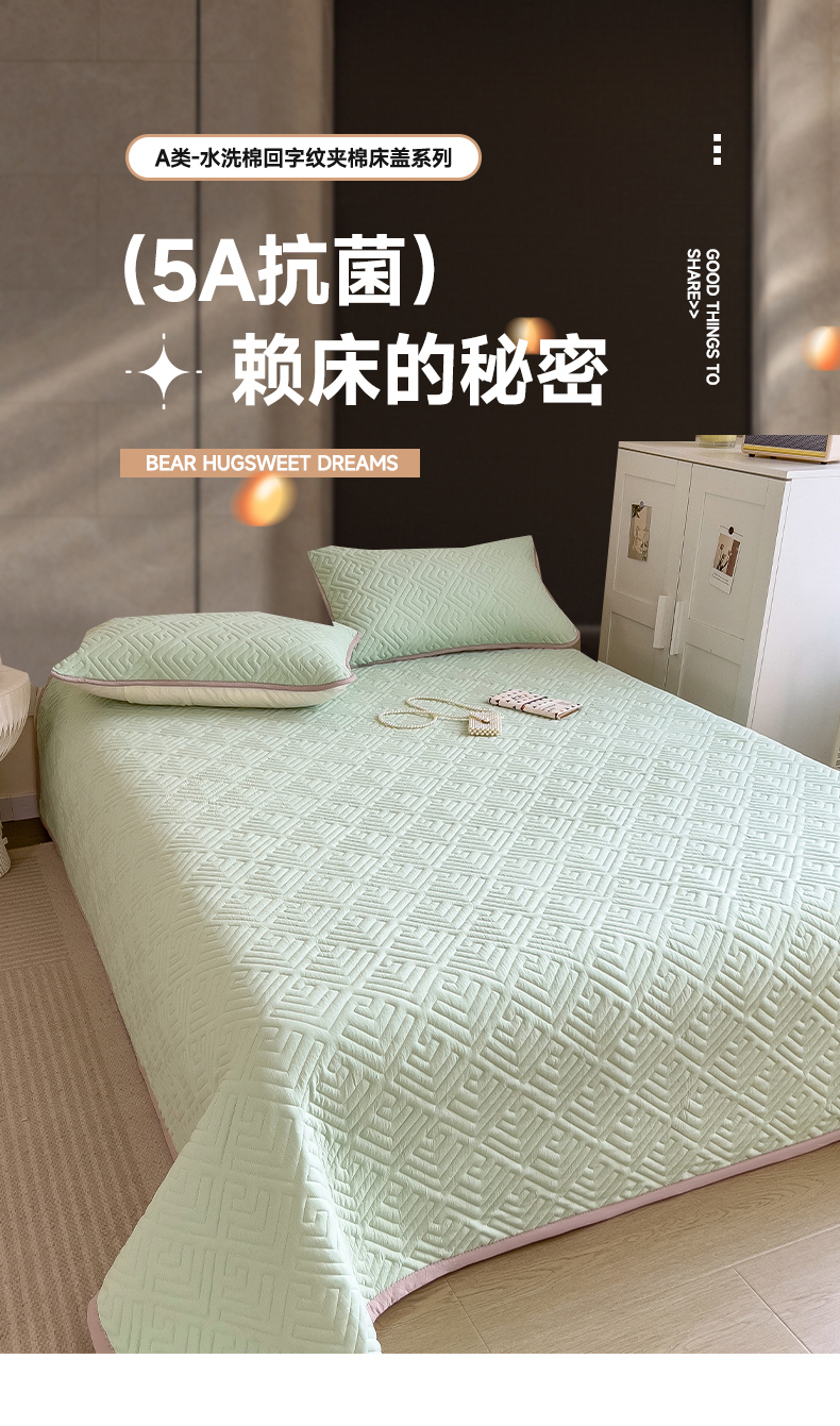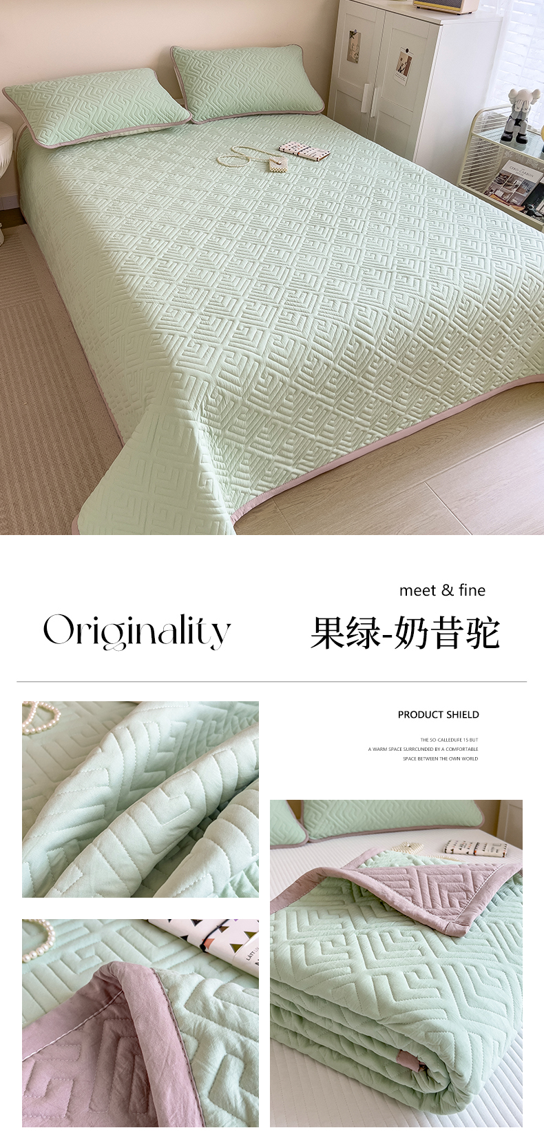 商品名称:叠派家纺 2024新款水洗棉回字纹夹棉床盖 果绿-奶昔驼