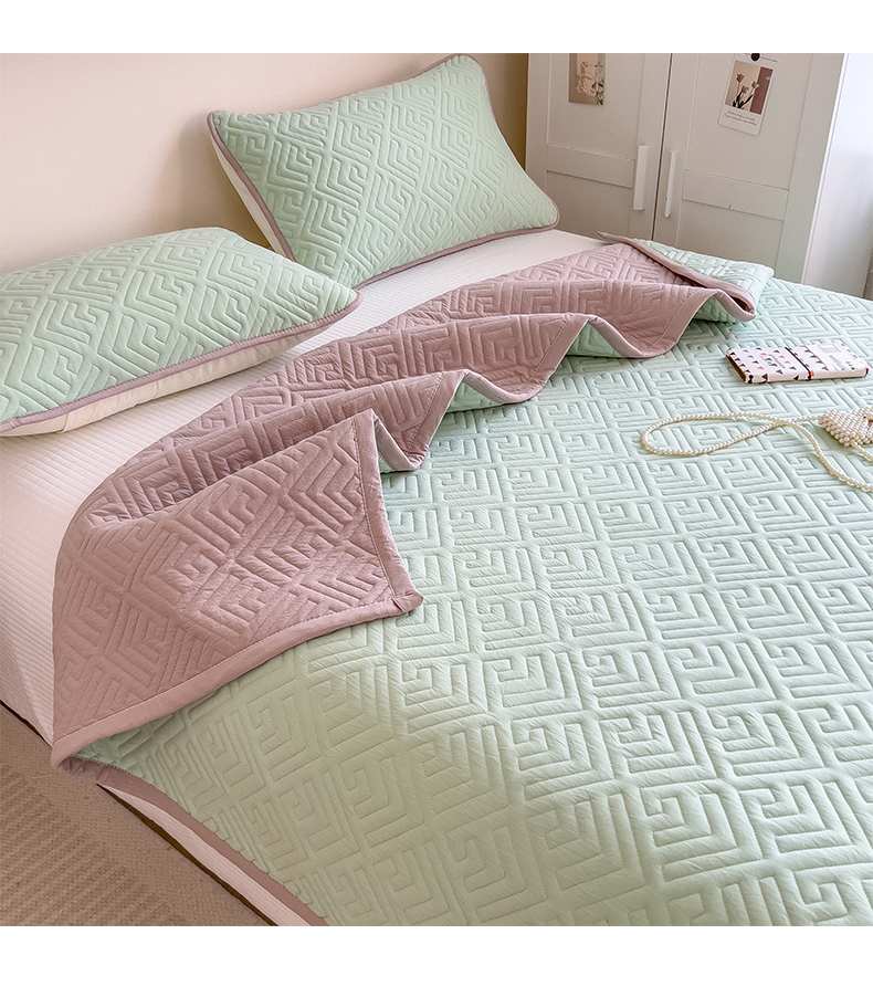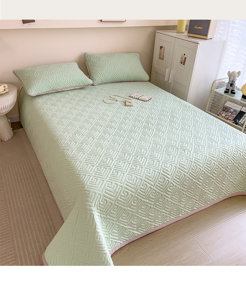 叠派家纺 2024新款水洗棉回字纹夹棉床盖 果绿-奶昔驼