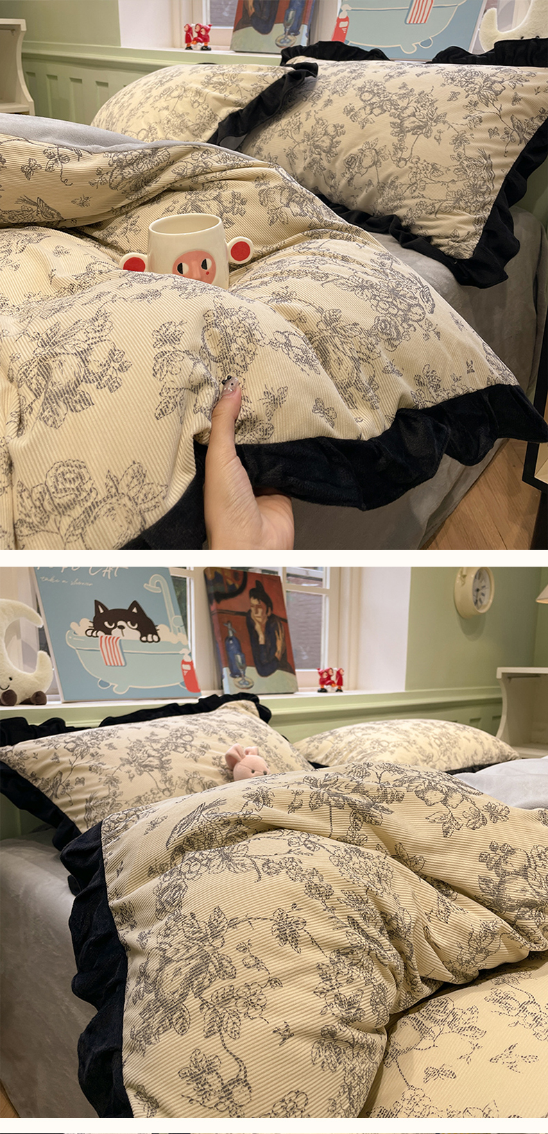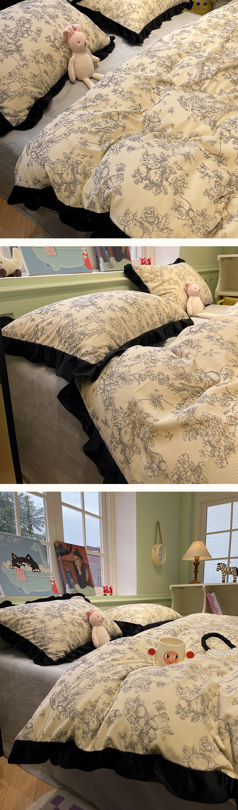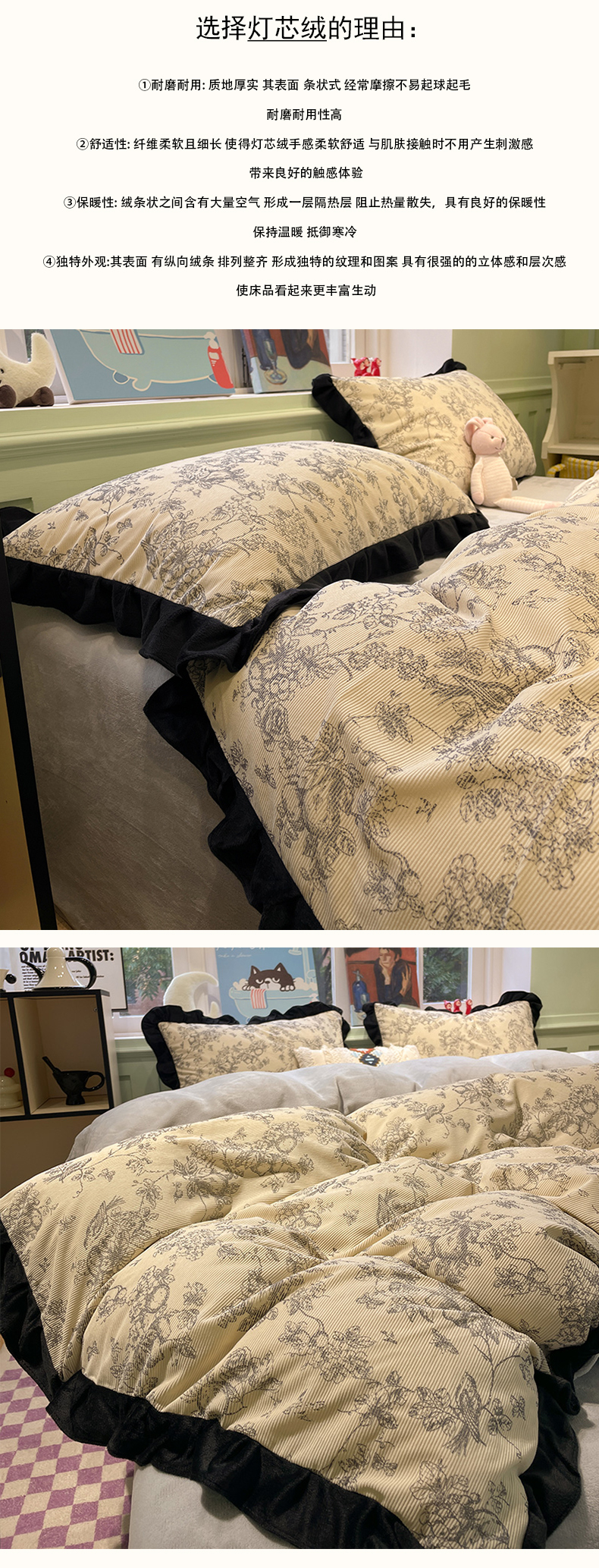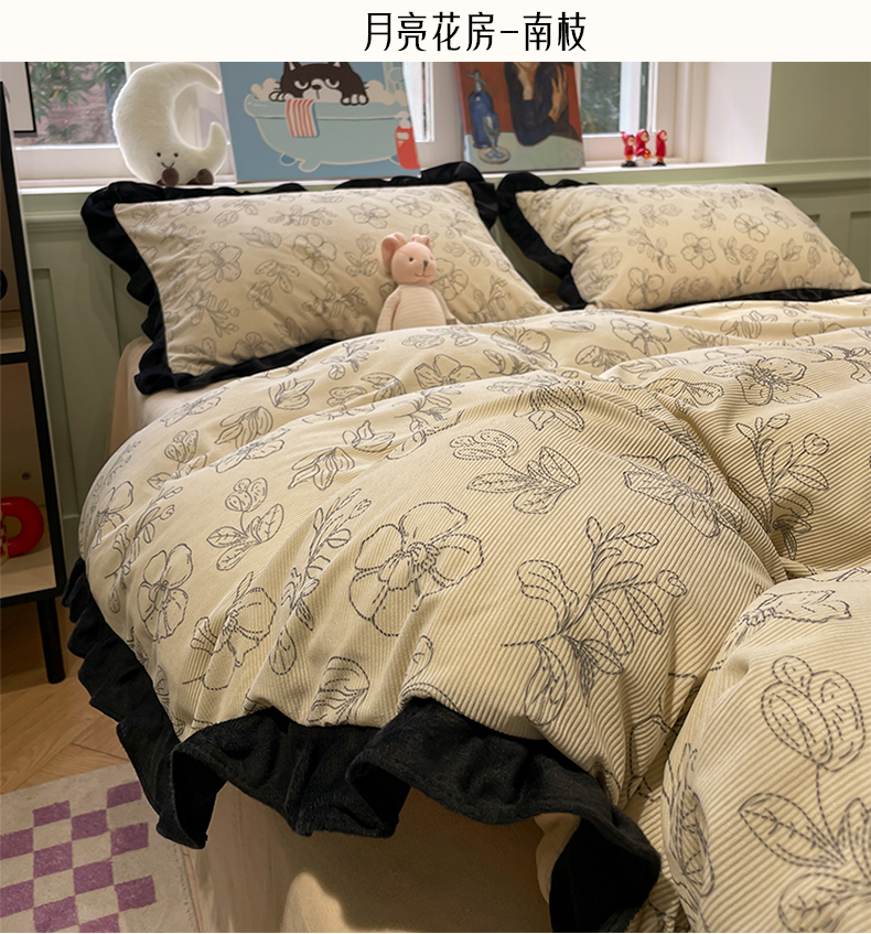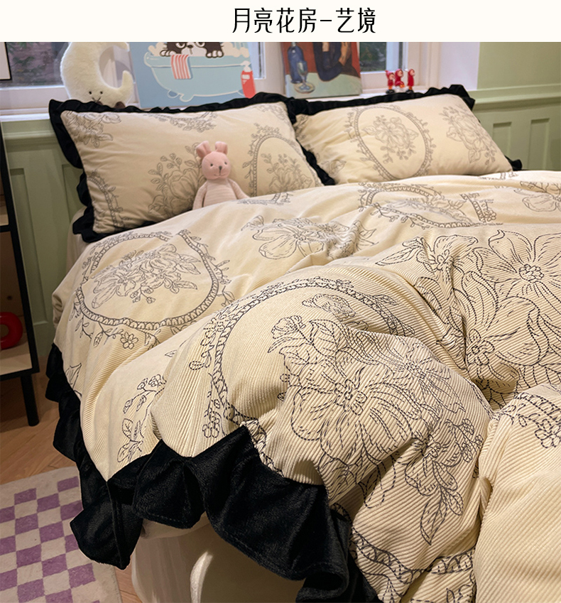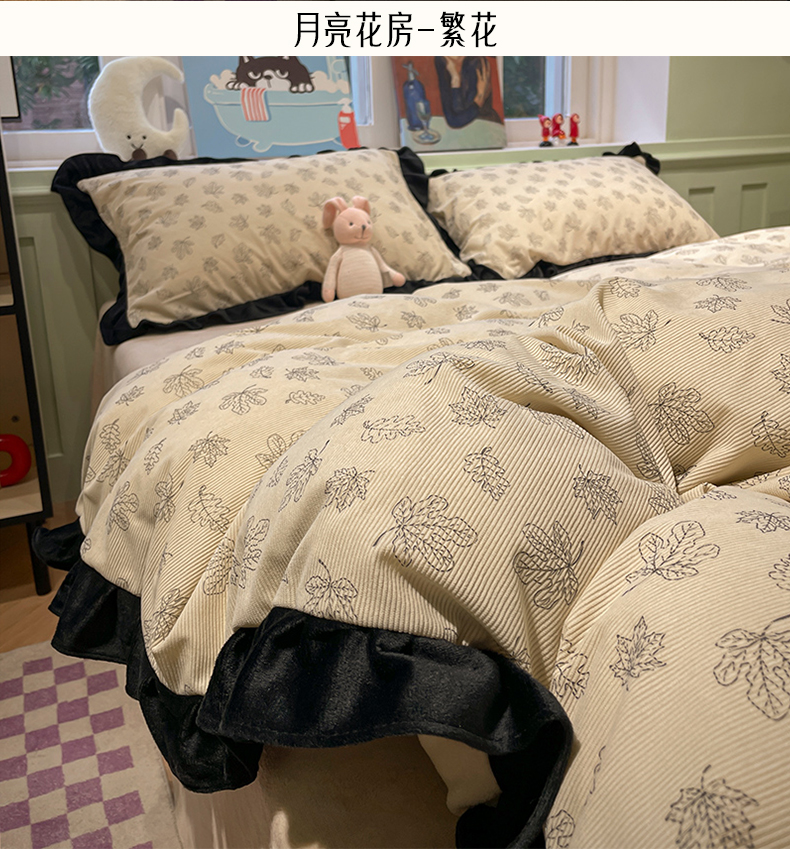 当前位置: 91家纺网 > 商品网购 > 床品套件 > 四件套 > 牛奶绒四件套 > 羚羊语家纺 爆款2024轻法式赫本风灯芯绒四件套小香风提花立体韩版花边牛奶绒三件套珊瑚法莱绒灯芯绒单被套-实拍风 月亮花房-初禾