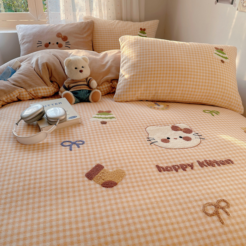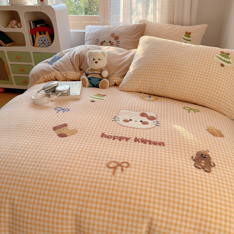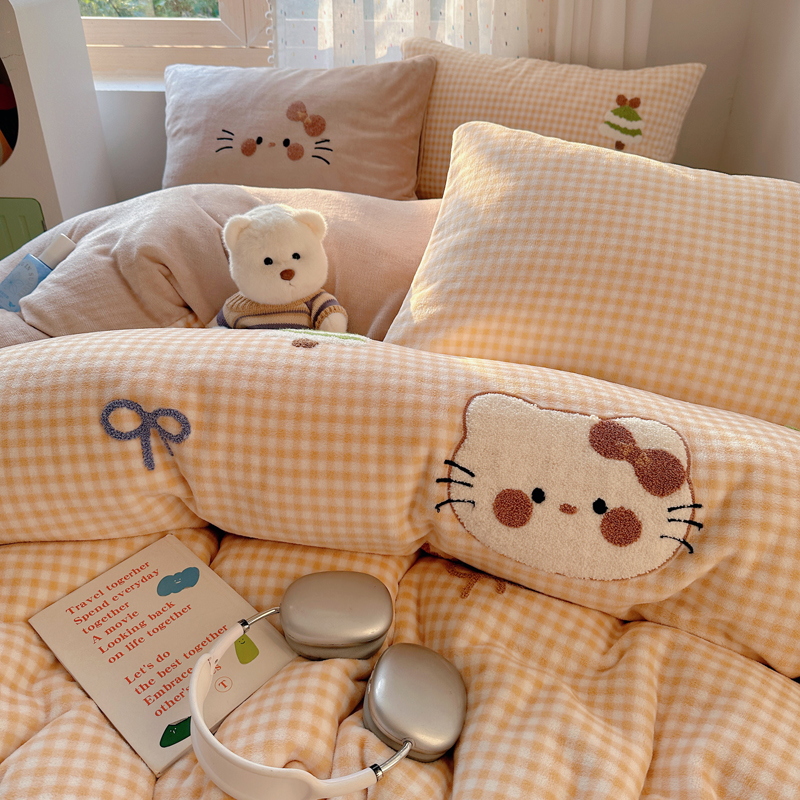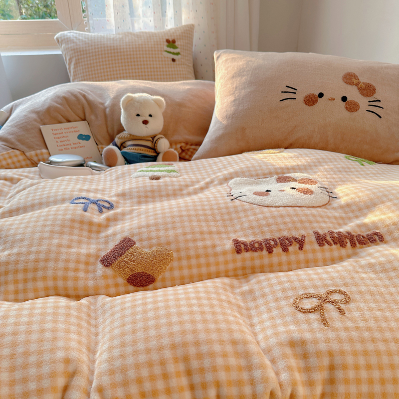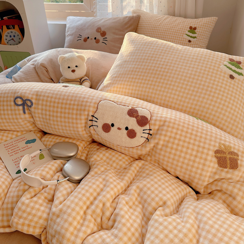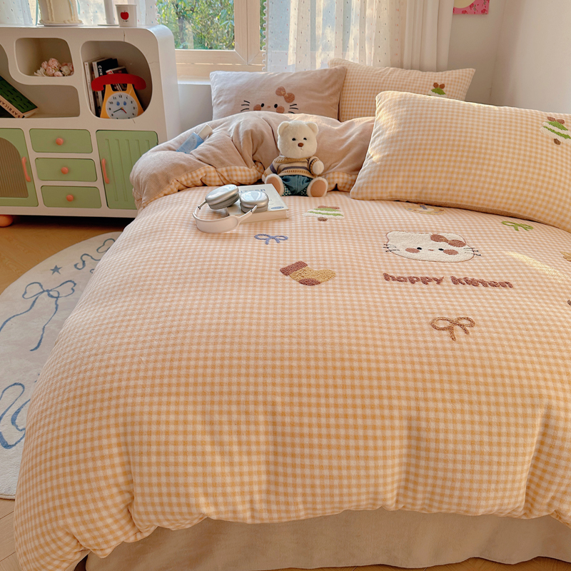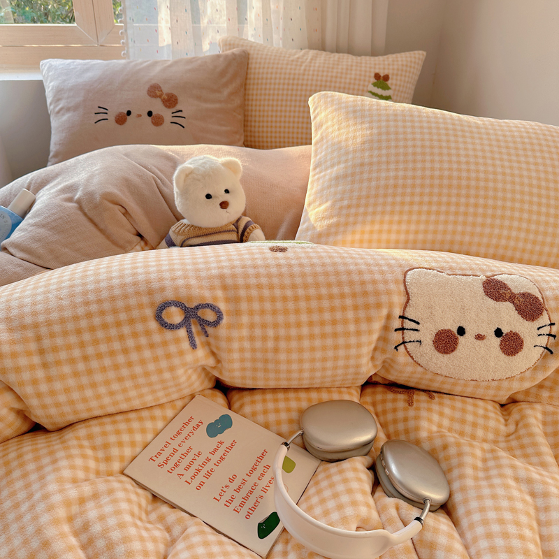(总)顾里家纺 2024秋冬新款格子猫咪毛巾绣牛奶绒四件套,粉格猫咪,黄格猫咪,咖格猫咪,蓝格猫咪,绿格猫咪
