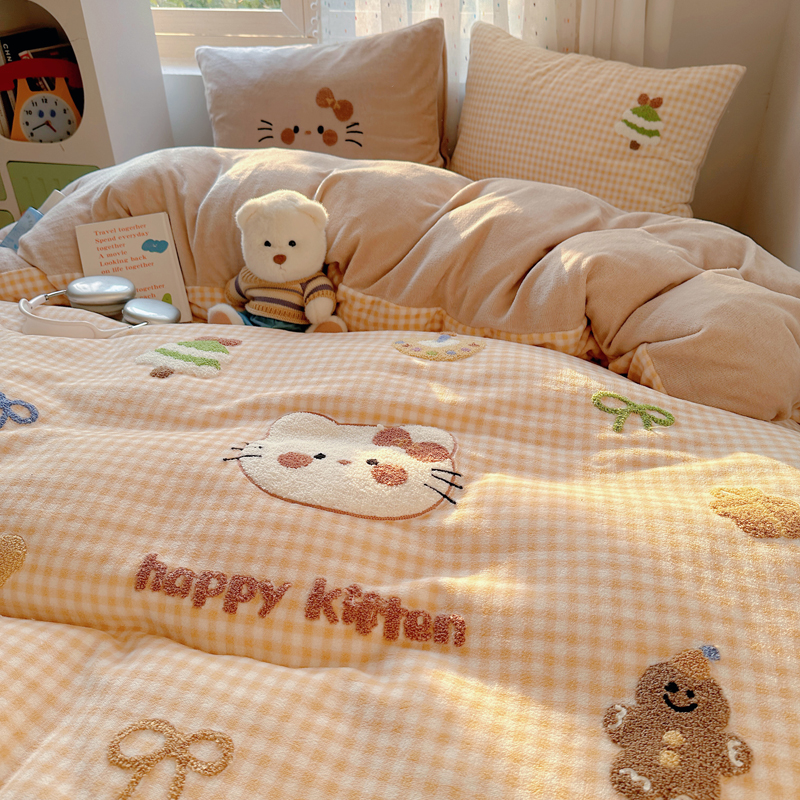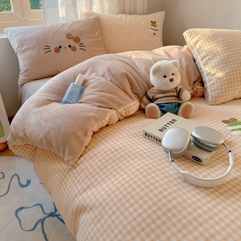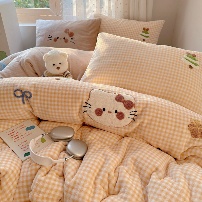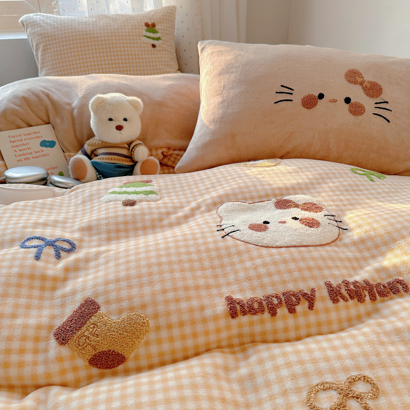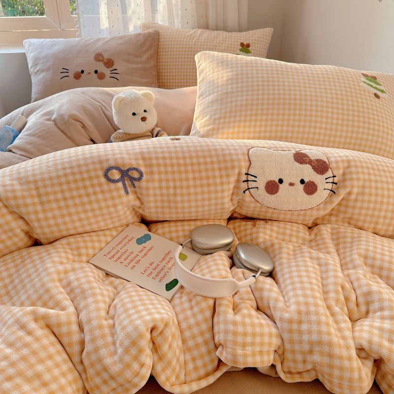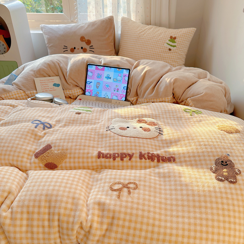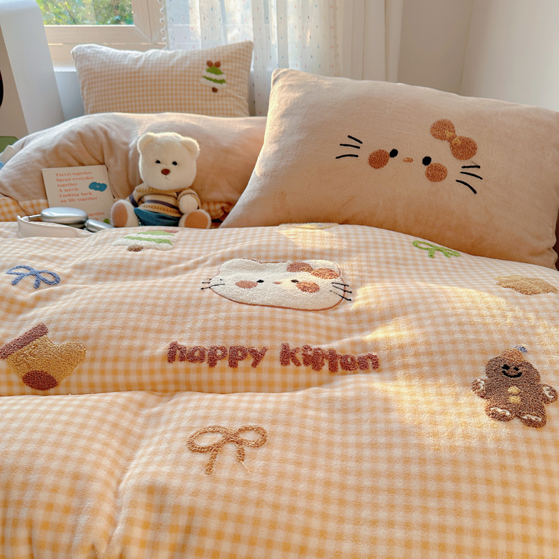 (总)顾里家纺 2024秋冬新款格子猫咪毛巾绣牛奶绒四件套,粉格猫咪,黄格猫咪,咖格猫咪,蓝格猫咪,绿格猫咪
