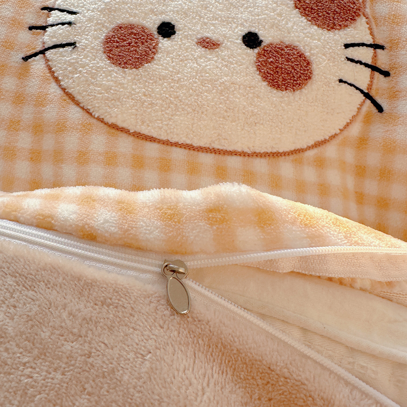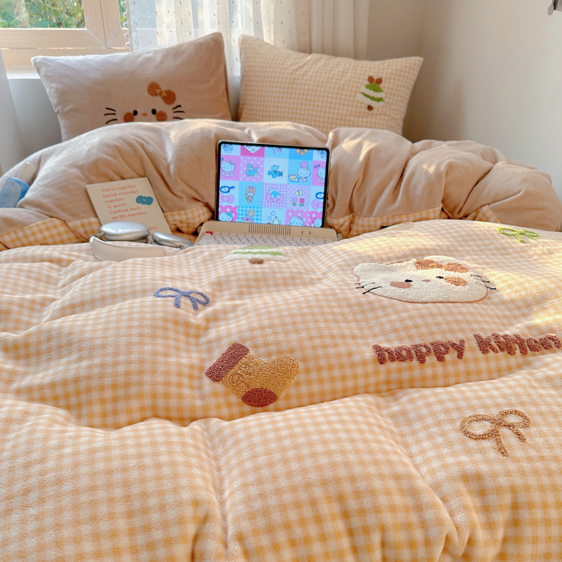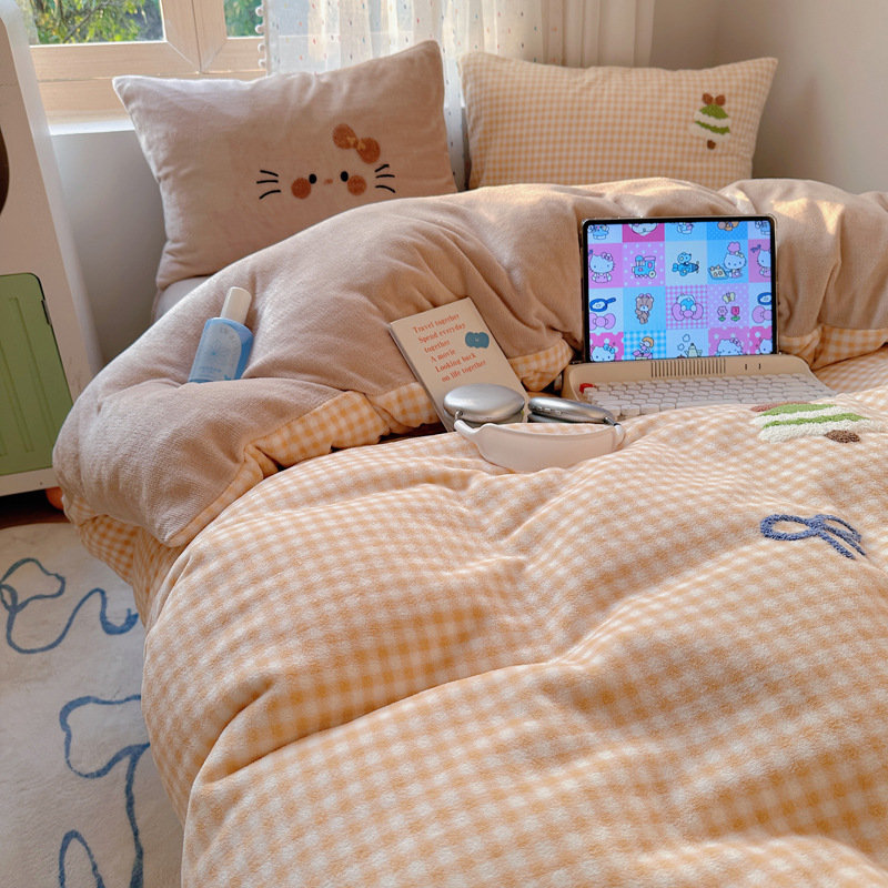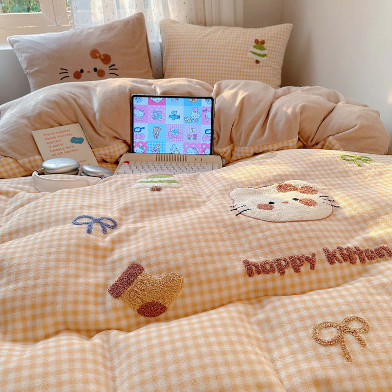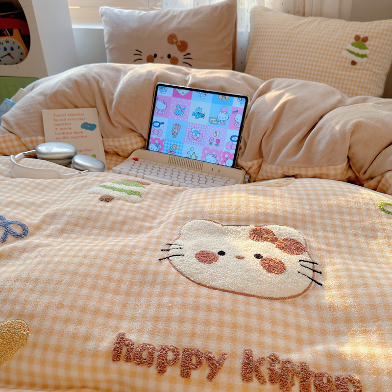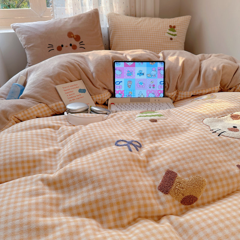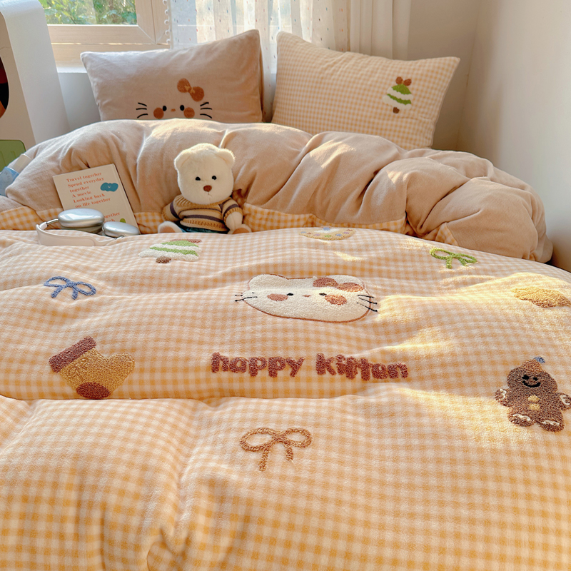 (总)顾里家纺 2024秋冬新款格子猫咪毛巾绣牛奶绒四件套,粉格猫咪,黄格猫咪,咖格猫咪,蓝格猫咪,绿格猫咪