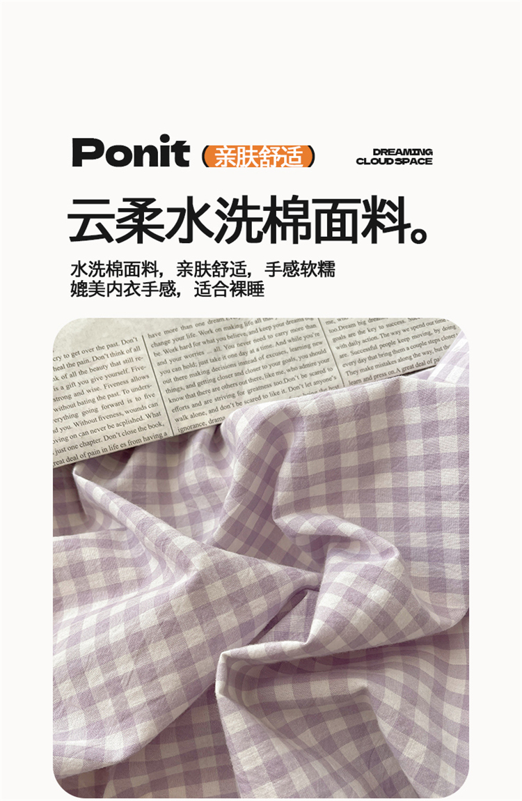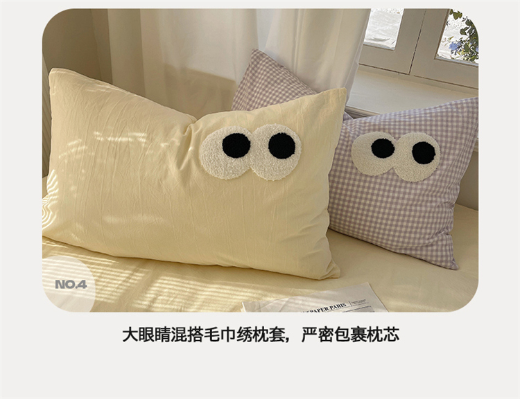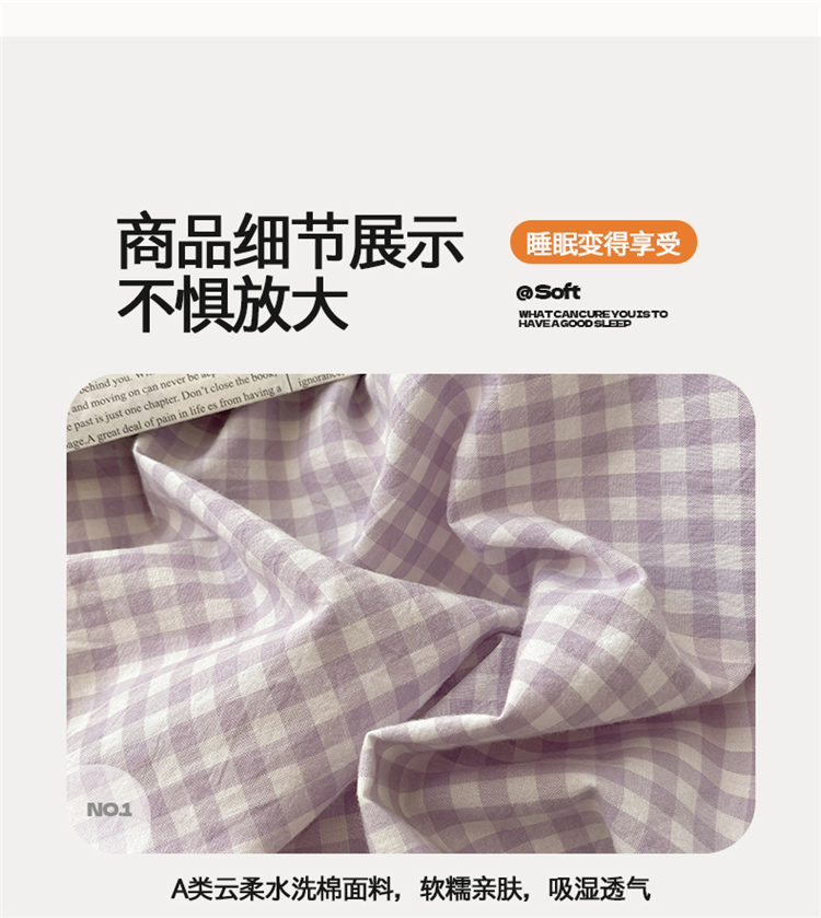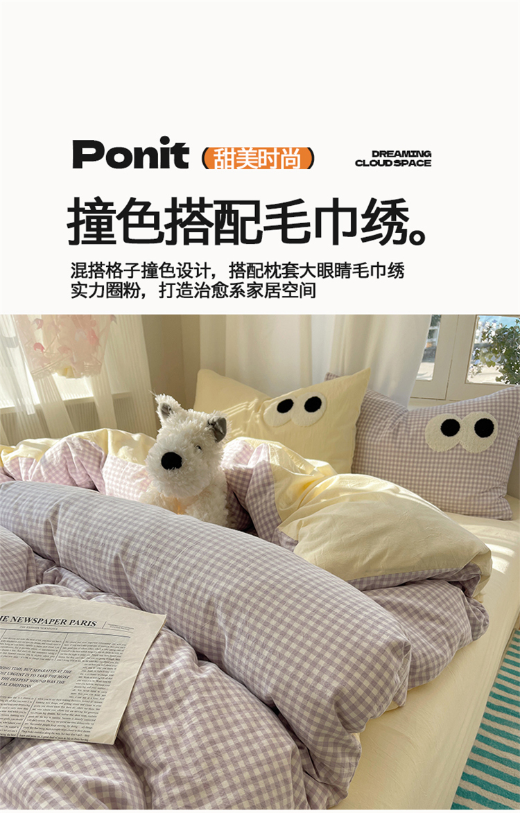 当前位置: 91家纺网 > 商品网购 > 床品套件 > 四件套 > 水洗棉四件套 > 2025新款A类亲肤舒适软糯云柔水洗棉大眼睛毛巾绣混搭格子撞色系列四件套 大眼紫小格奶黄
