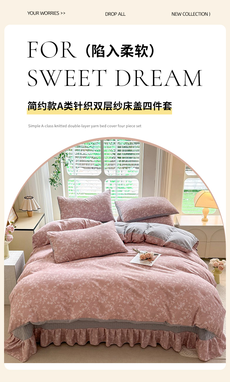 (总)韩约家纺 2025新款简约款1针织双层纱床盖四件套,波波狗(简约款),朝花夕拾(简约款),春风里(简约款),淡雅花姿(简约款),蝶恋(简约款),蝶影(简约款),花影缤纷(简约款),兰黛(简约款),曼玲(简约款),奶油波波(简约款),婉君(简约款),樱桃之恋(简约款)