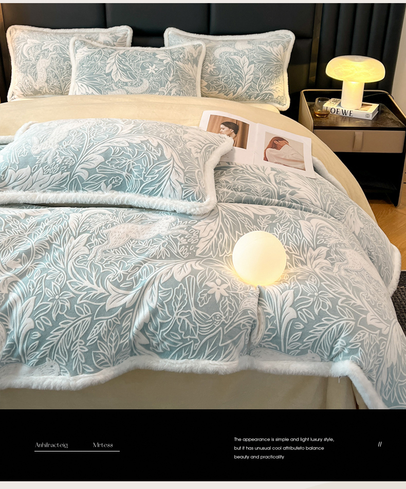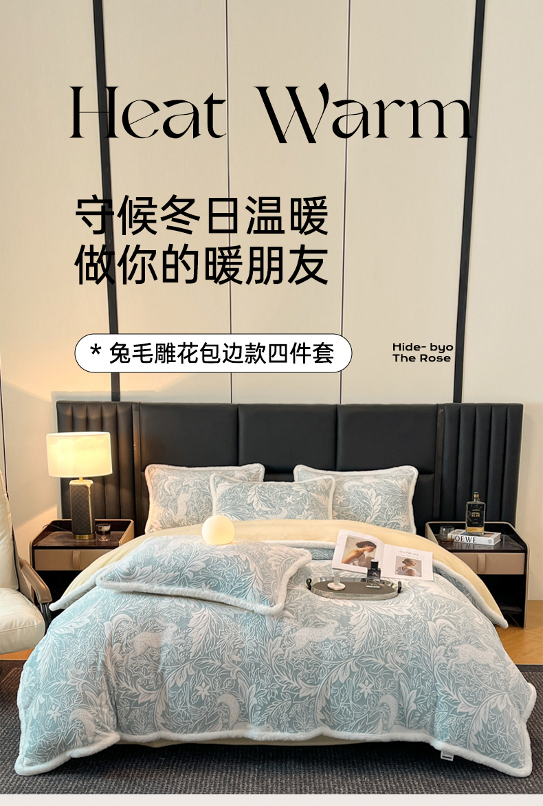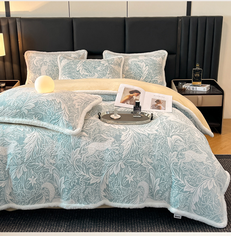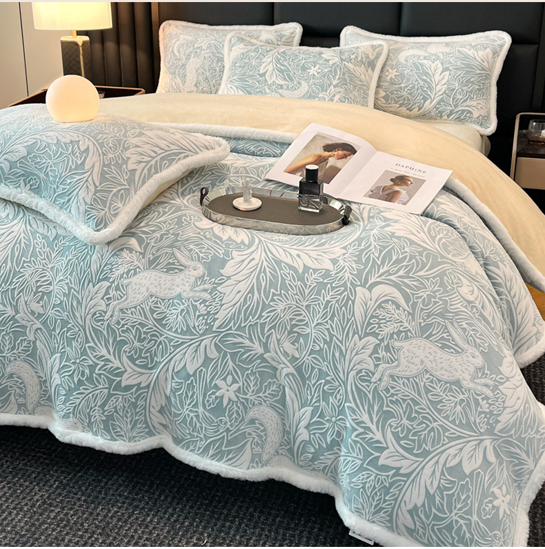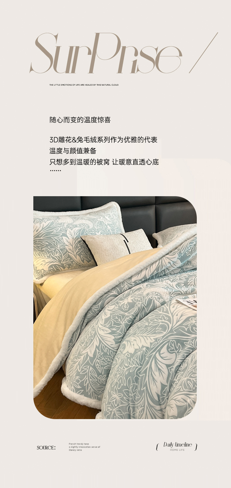 畅畅家纺 2025新款兔毛绒大包边雕花牛奶绒绒四件套 香缇娜-蓝