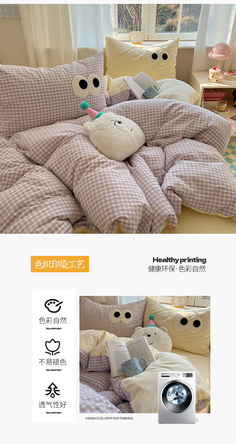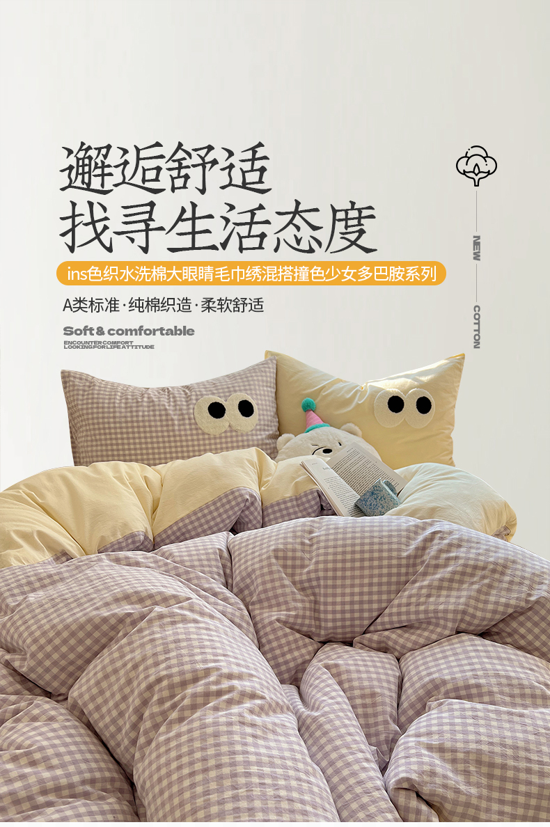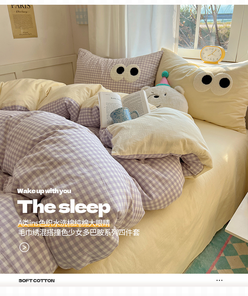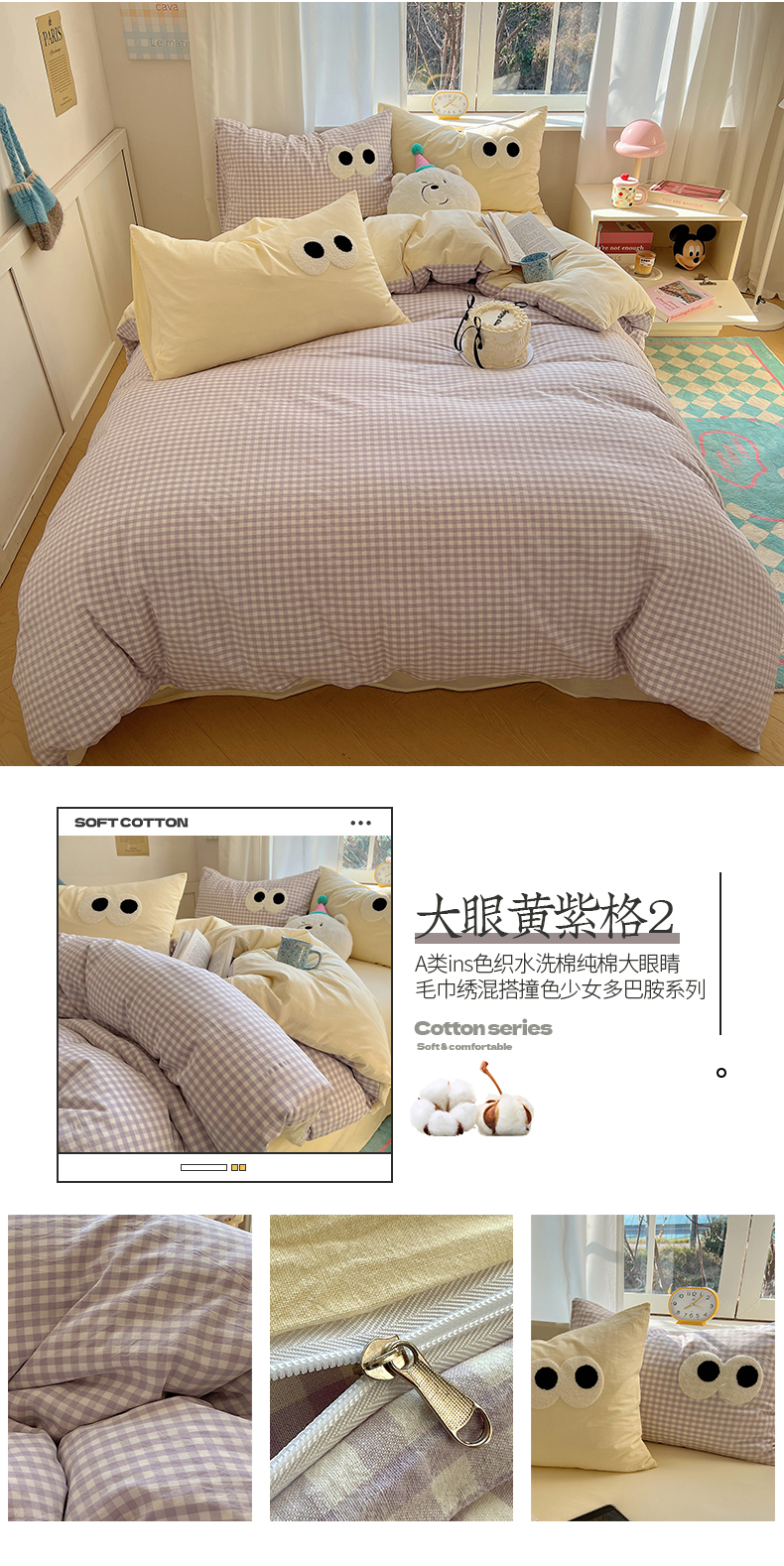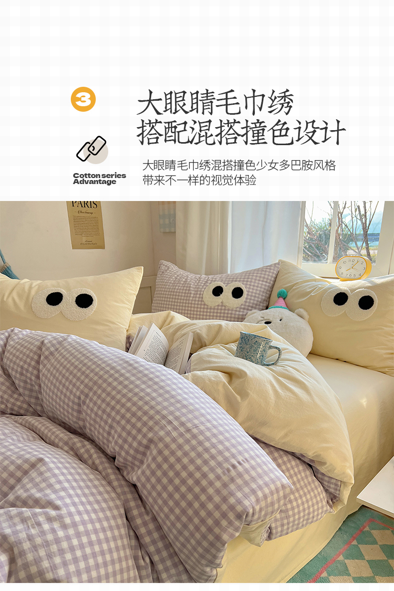 当前位置: 91家纺网 > 商品网购 > 床品套件 > 四件套 > 水洗棉四件套 > 桃子家居 2026新款A类ins色织水洗棉纯棉大眼睛毛巾绣混搭撞色少女多巴胺系列四件套 色织水洗棉-大眼黄紫格2