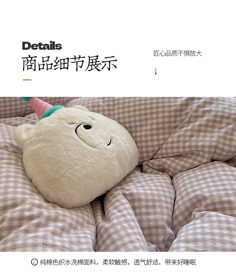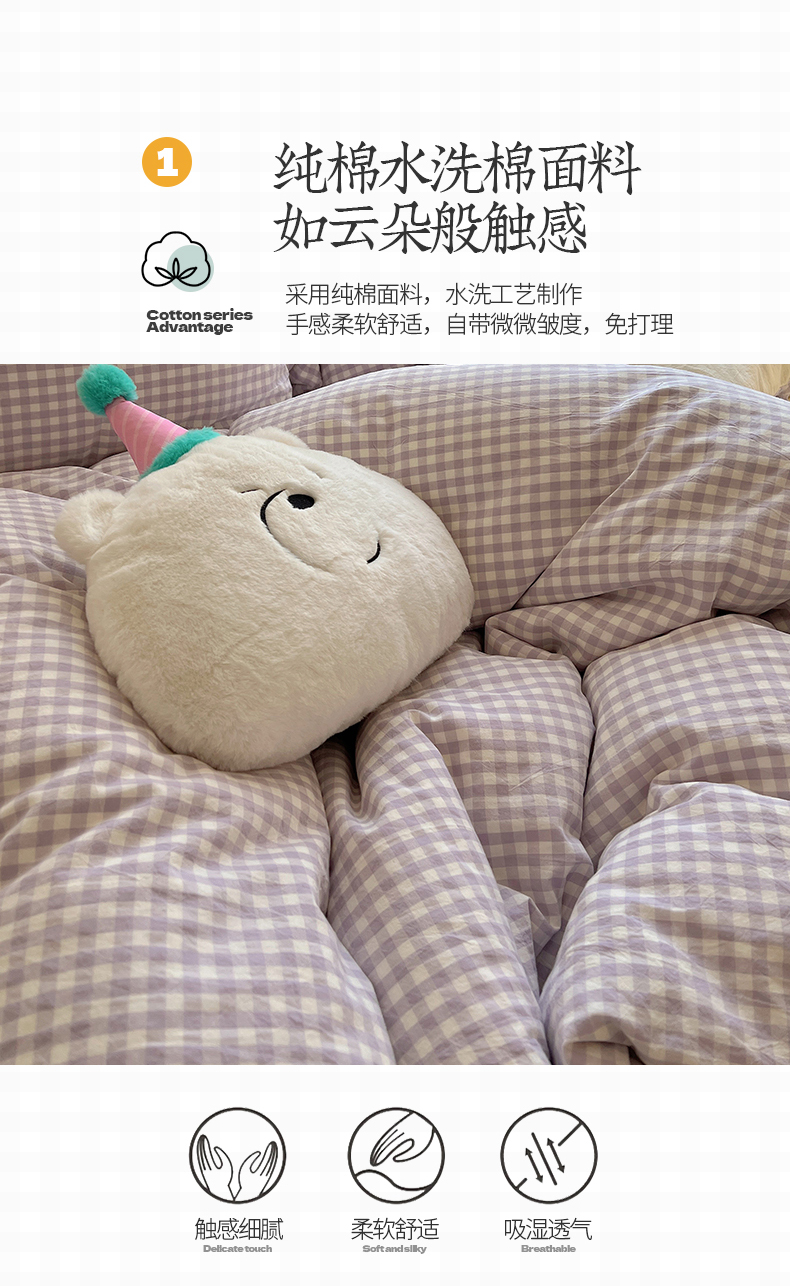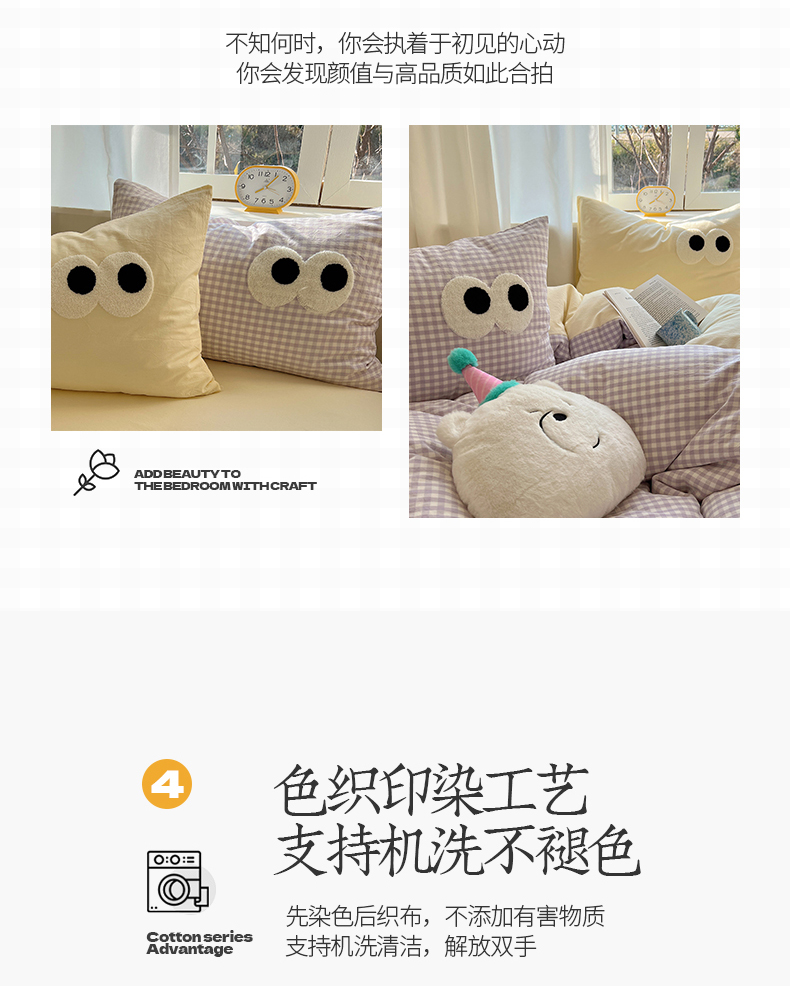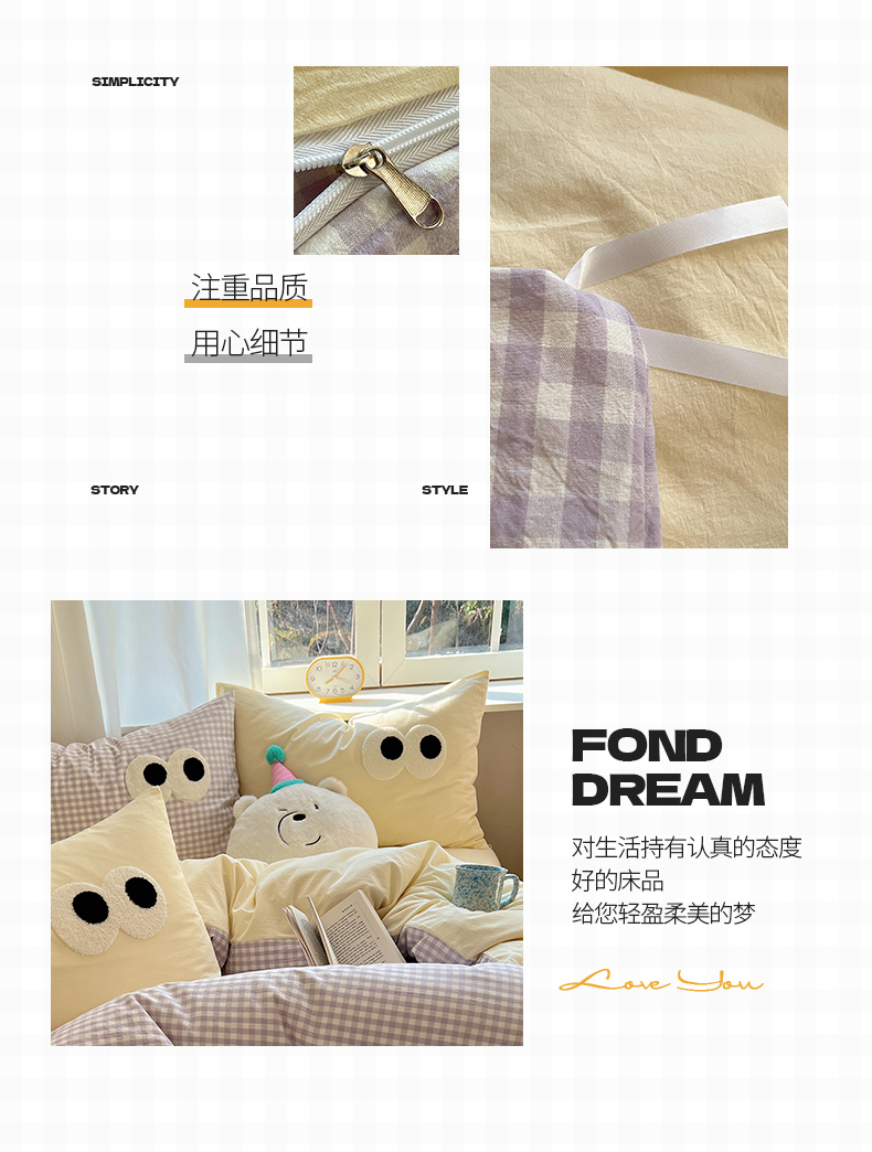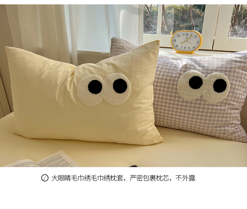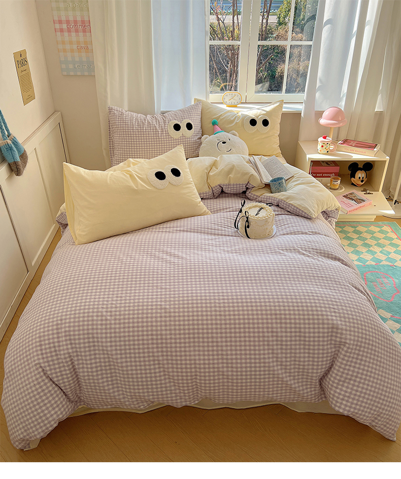 当前位置: 91家纺网 > 商品网购 > 床品套件 > 四件套 > 水洗棉四件套 > 桃子家居 2026新款A类ins色织水洗棉纯棉大眼睛毛巾绣混搭撞色少女多巴胺系列四件套 色织水洗棉-大眼黄紫格2