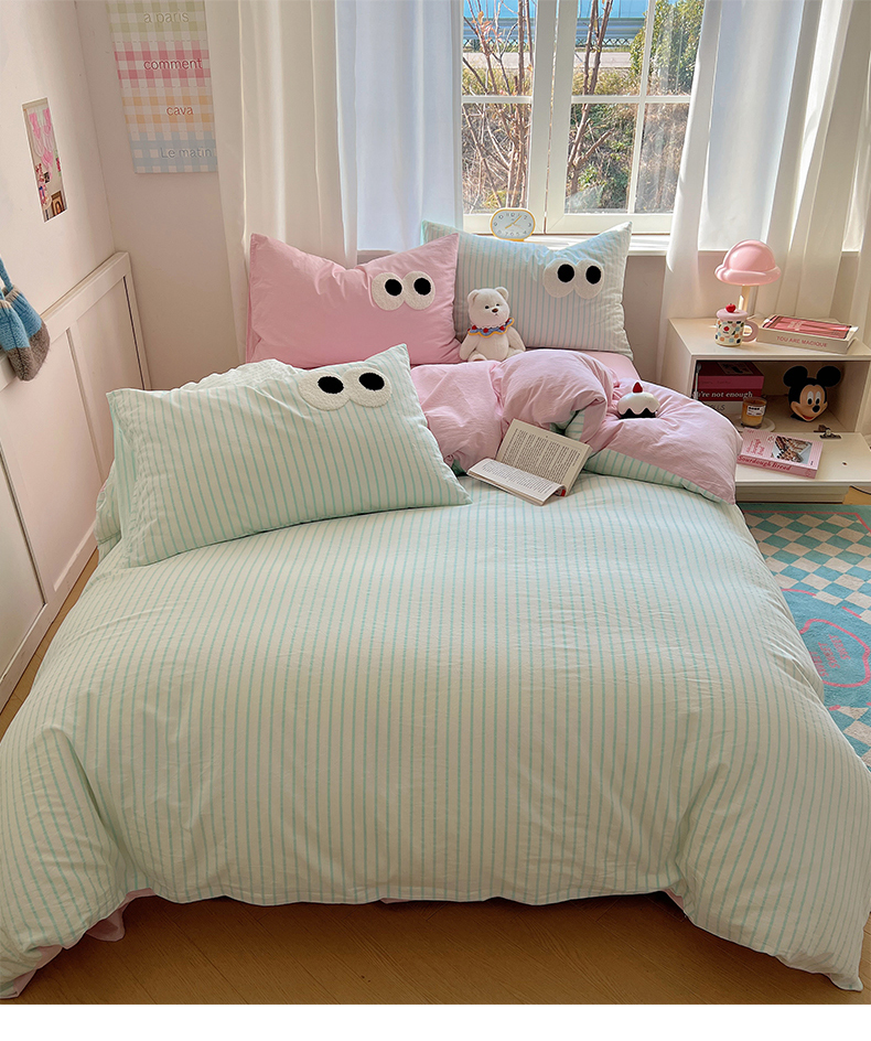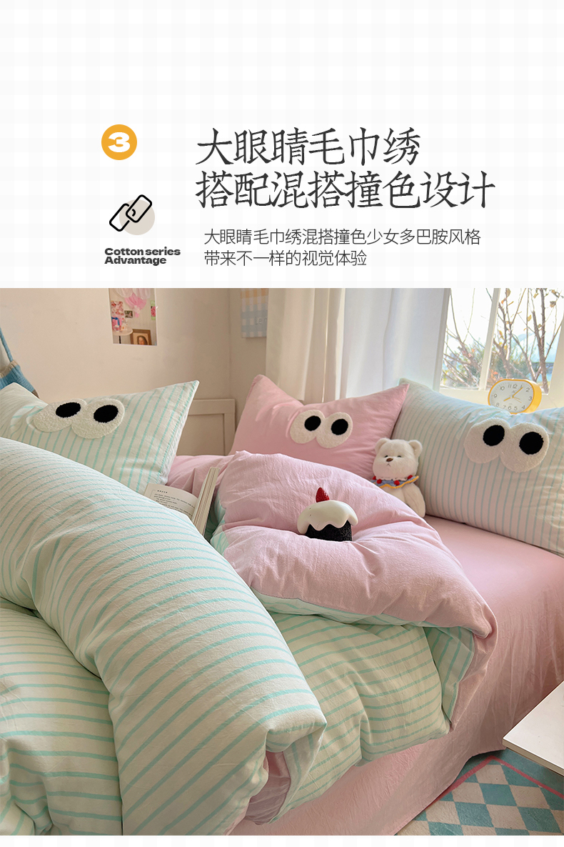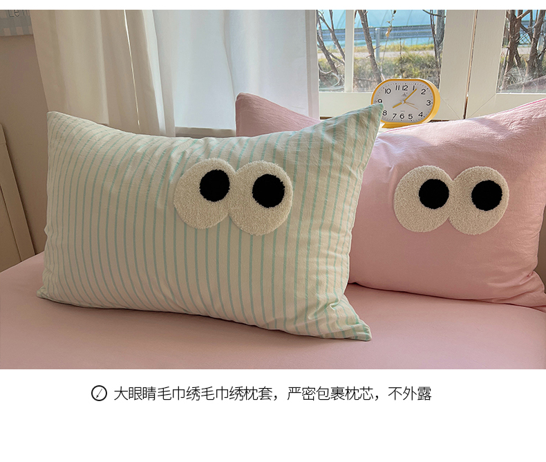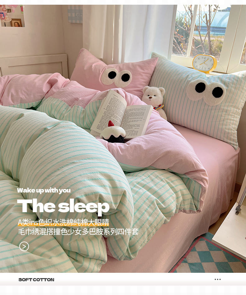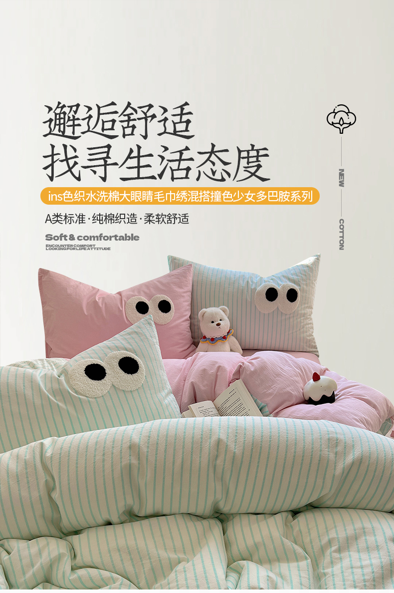 当前位置: 91家纺网 > 商品网购 > 床品套件 > 四件套 > 水洗棉四件套 > 桃子家居 2026新款A类ins色织水洗棉纯棉大眼睛毛巾绣混搭撞色少女多巴胺系列四件套 色织水洗棉-大眼蓝条粉