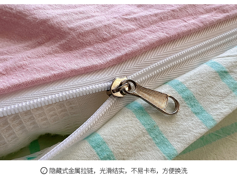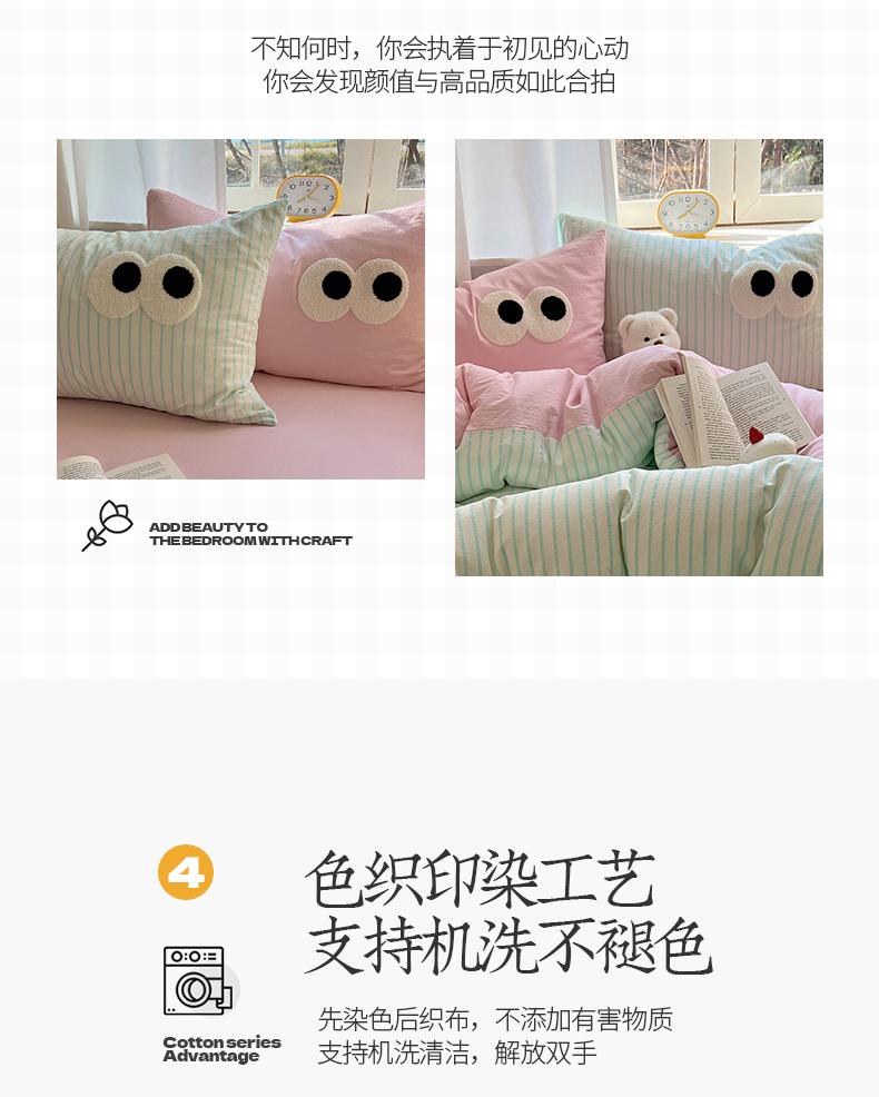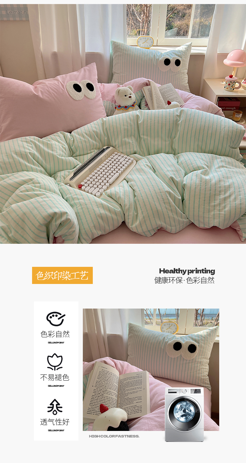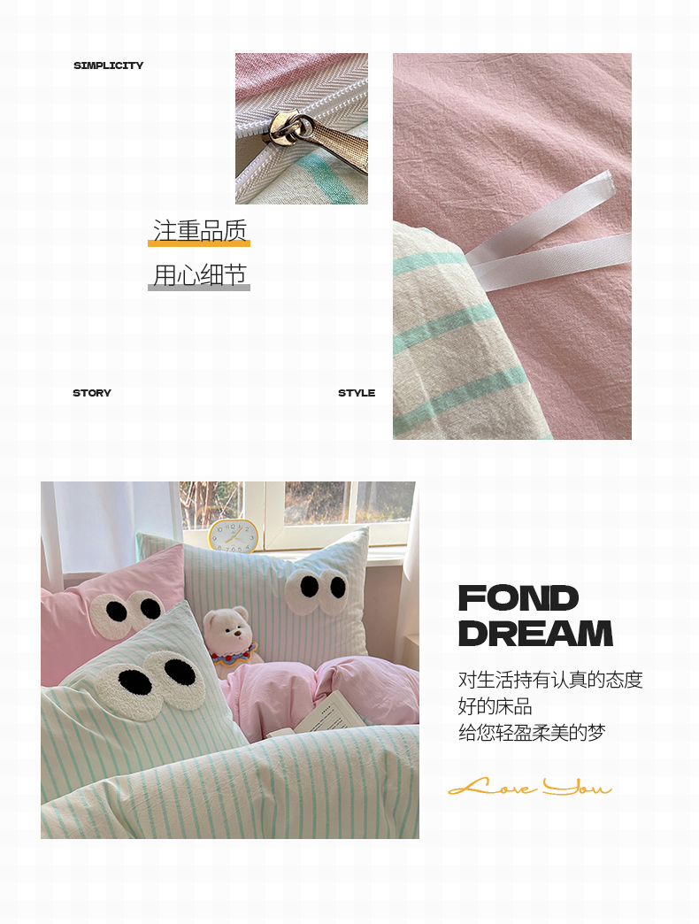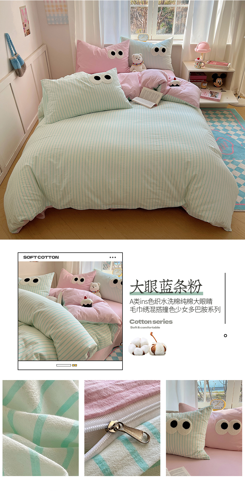 当前位置: 91家纺网 > 商品网购 > 床品套件 > 四件套 > 水洗棉四件套 > 桃子家居 2026新款A类ins色织水洗棉纯棉大眼睛毛巾绣混搭撞色少女多巴胺系列四件套 色织水洗棉-大眼蓝条粉
