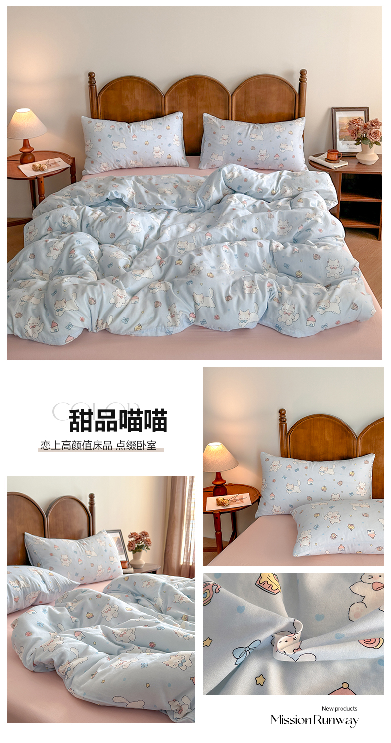 当前位置: 91家纺网 > 商品网购 > 床品套件 > 四件套 > 全棉普通四件套 > 2025新款A类母婴级有氧全棉纯棉双层纱纯棉印花四件套 场景二 甜品喵喵