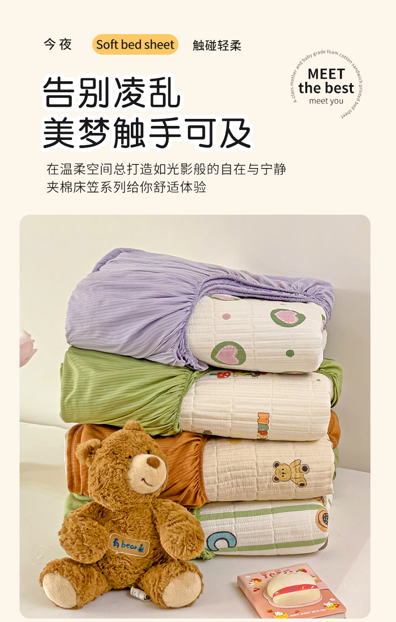 • 91家纺网 家纺一手货源 找家纺 恬澳家纺 2025新款A类泡泡棉夹棉印花床笠 艾丽-熊宝