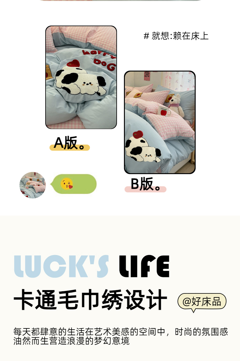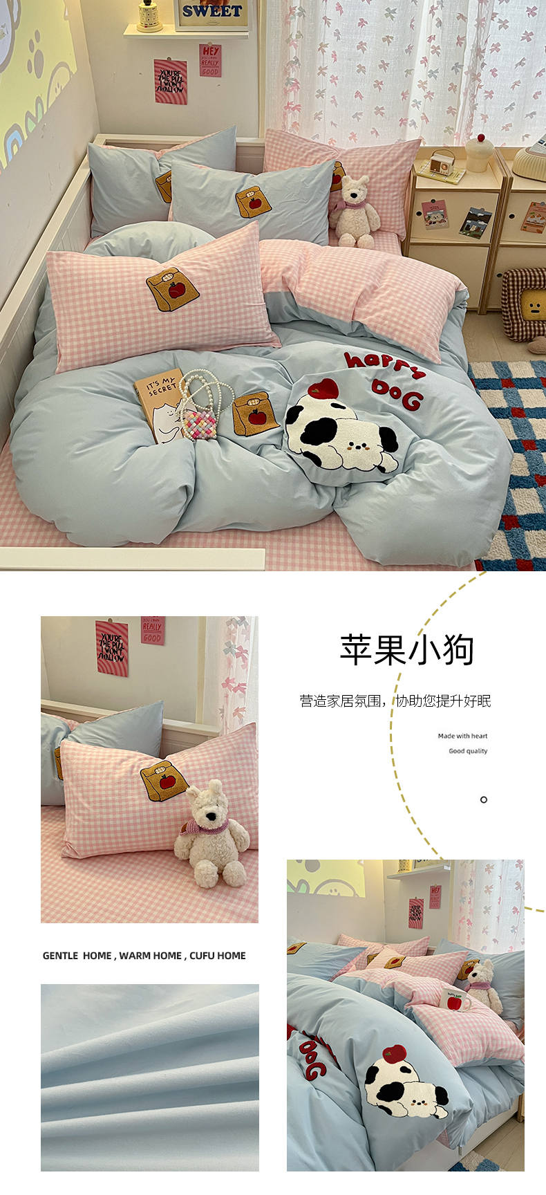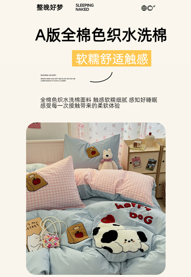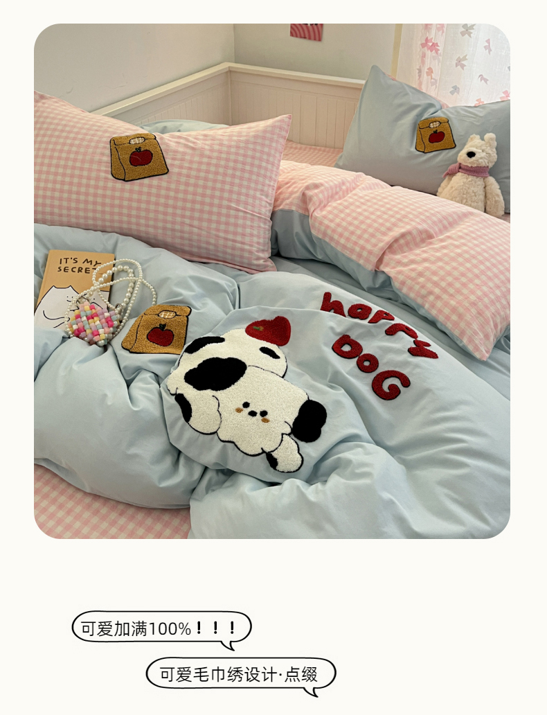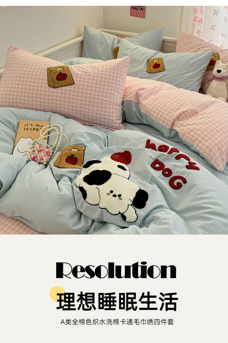 商品名称:呗旺鹿 2025新款A类全棉色织水洗棉毛巾绣系列四件套 苹果小狗