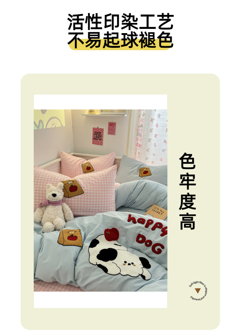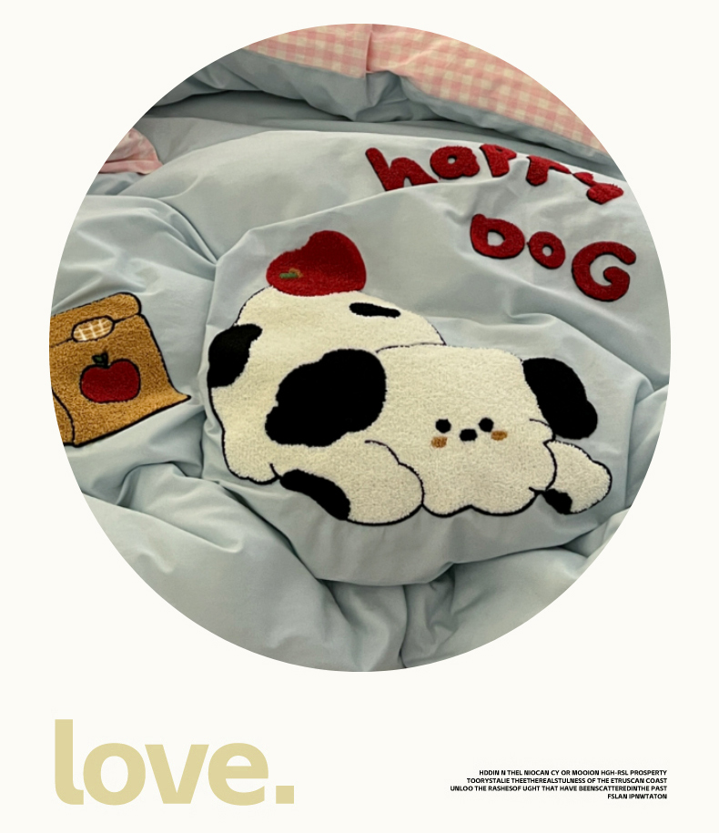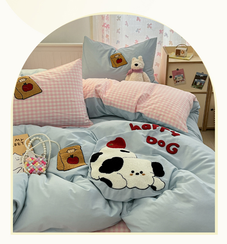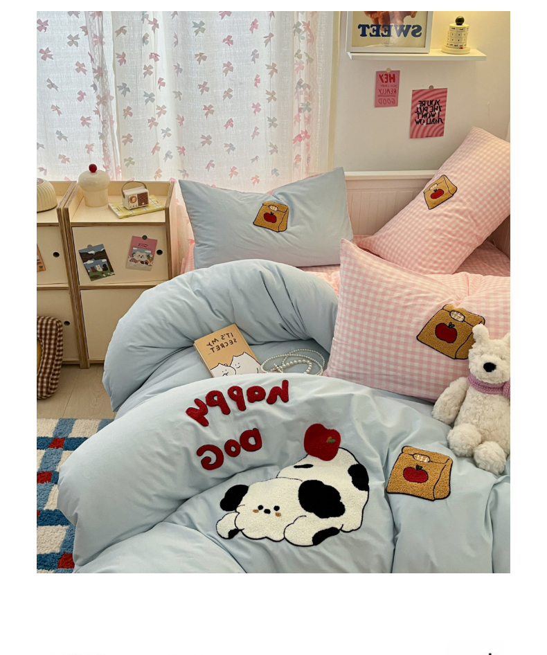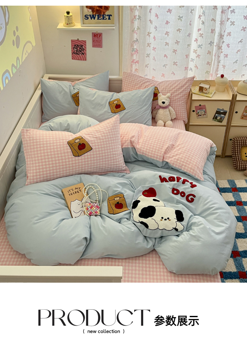 商品名称:呗旺鹿 2025新款A类全棉色织水洗棉毛巾绣系列四件套 苹果小狗