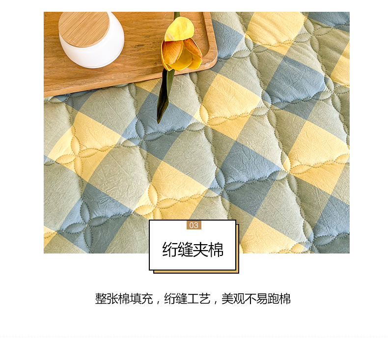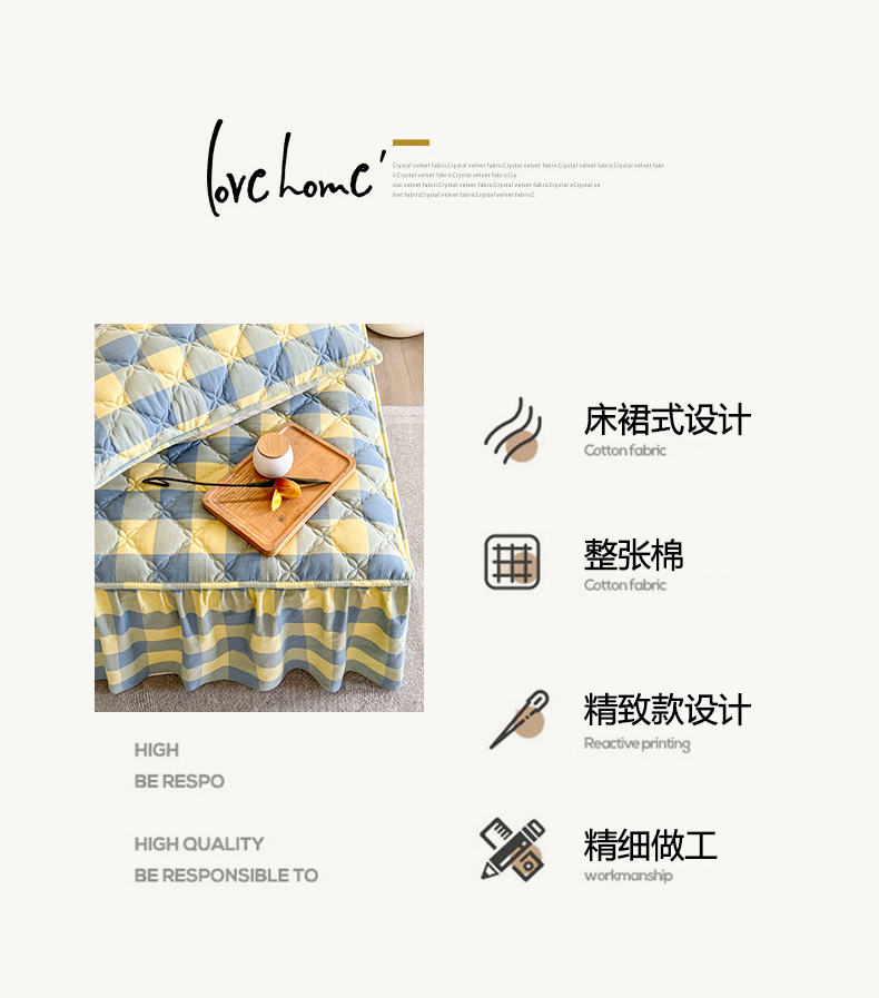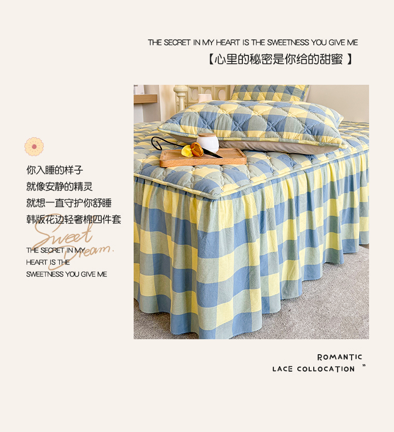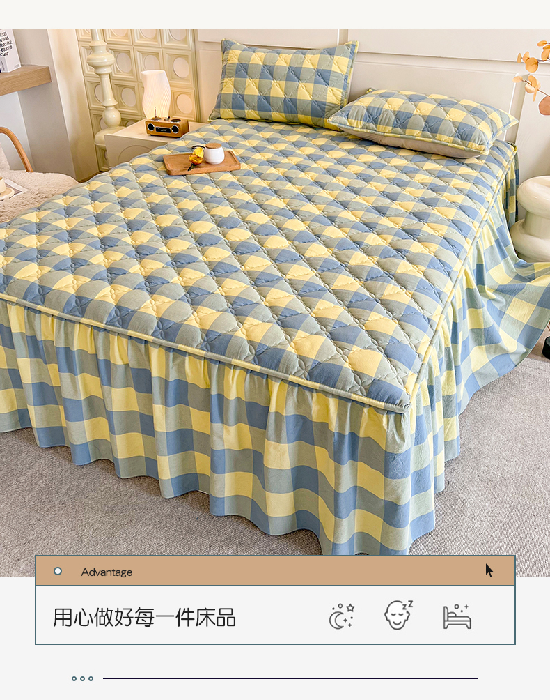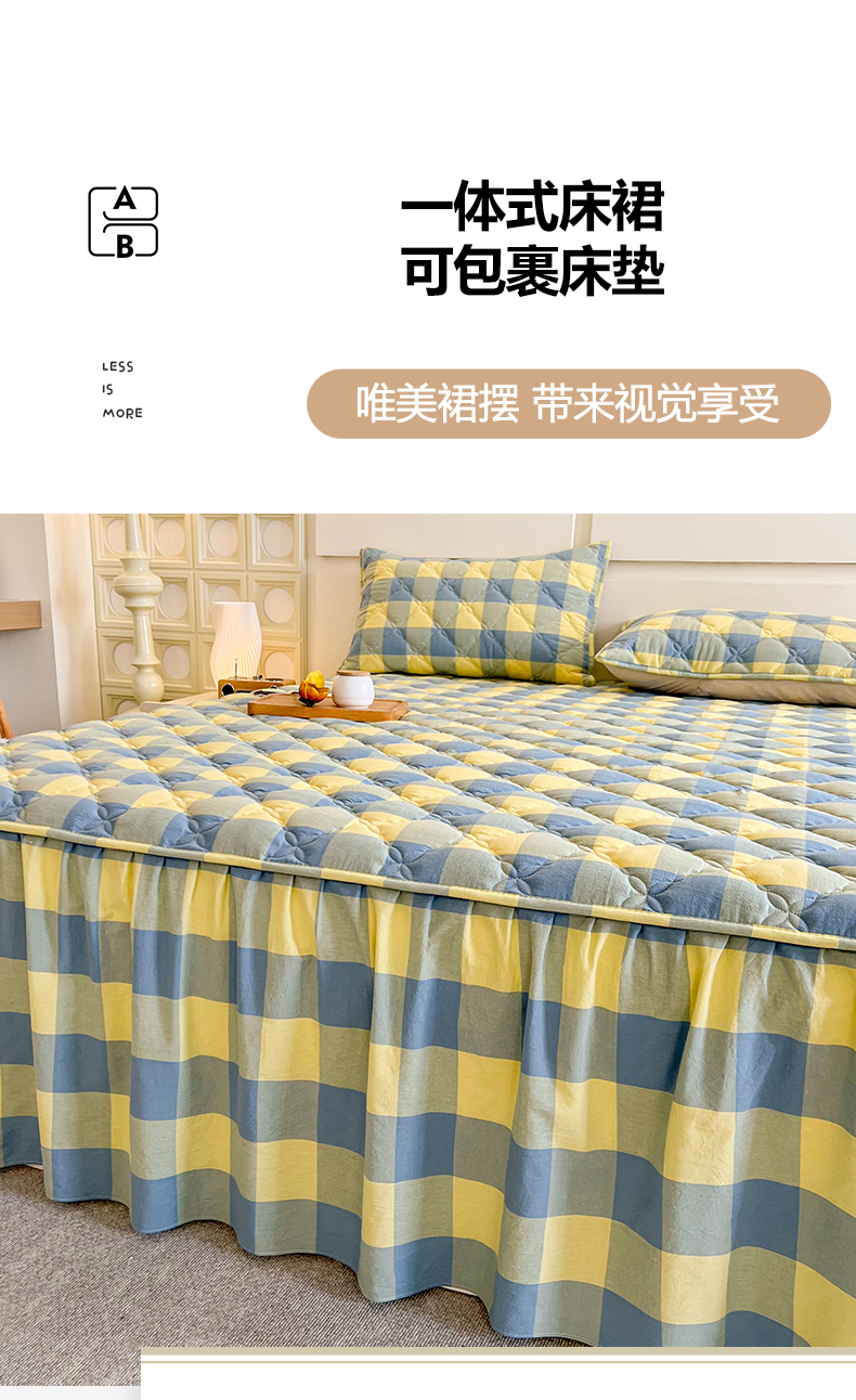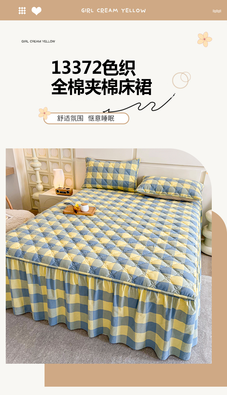 糯米猪家纺 2025新款全棉色织水洗棉床裙 兰黄大格