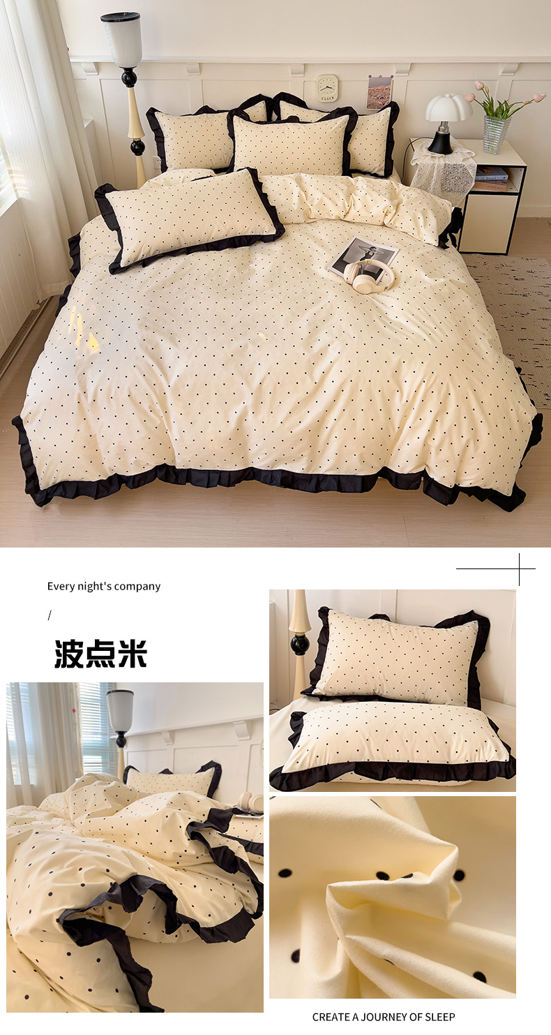 当前位置: 91家纺网 > 商品网购 > 床品套件 > 四件套 > 水洗棉四件套 > 艺玲家纺 2025新款韩版法式赫本风黑色花边水洗棉印花四件套 波点米
