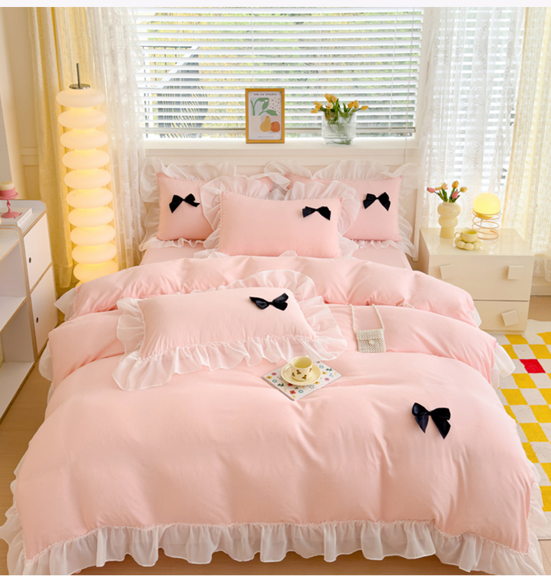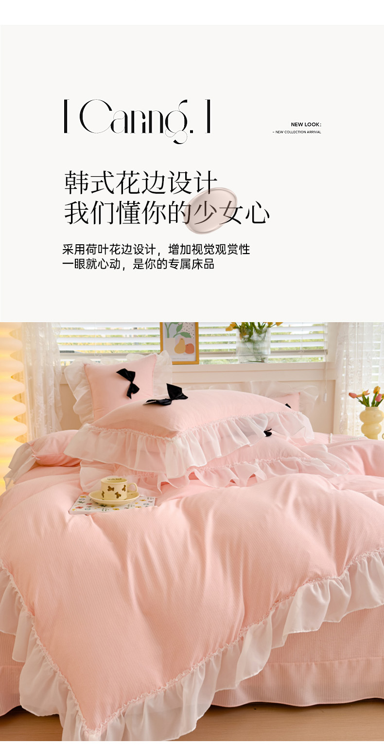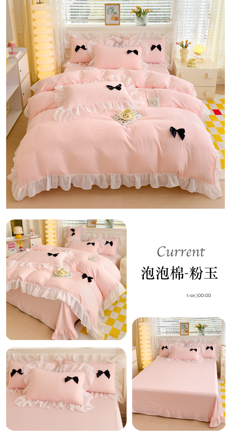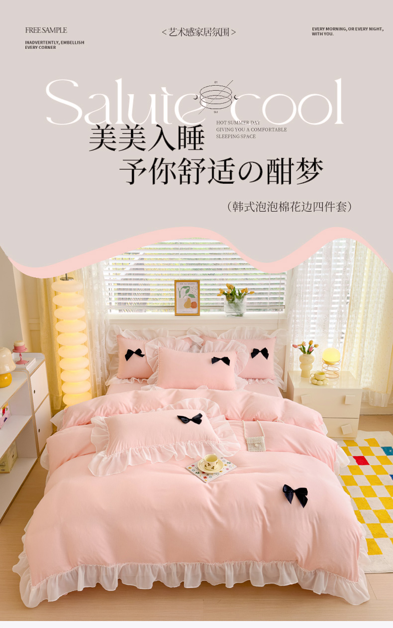 (买家秀 爆款花型不断货)A类母婴级少女风韩式公主风泡泡纱床上四件套韩式泡泡棉花边四件套水洗棉四件套 泡泡棉-粉玉