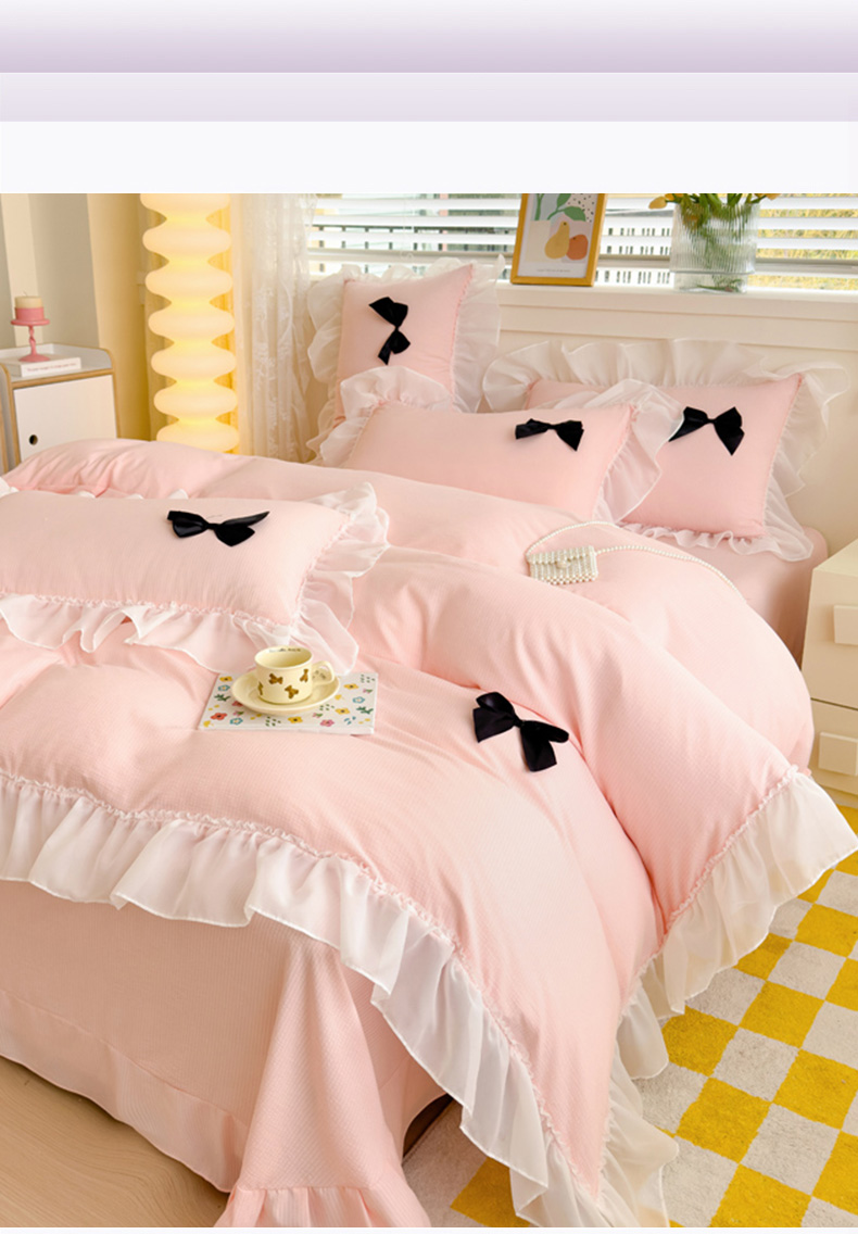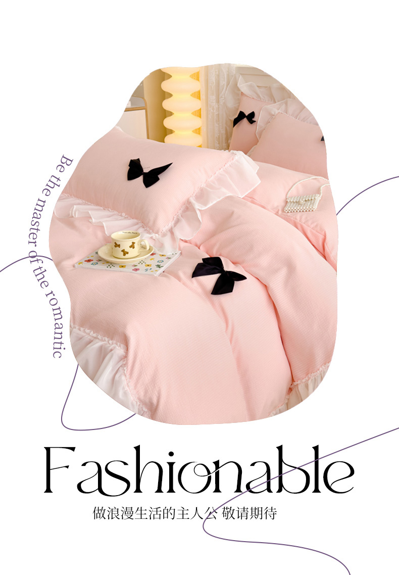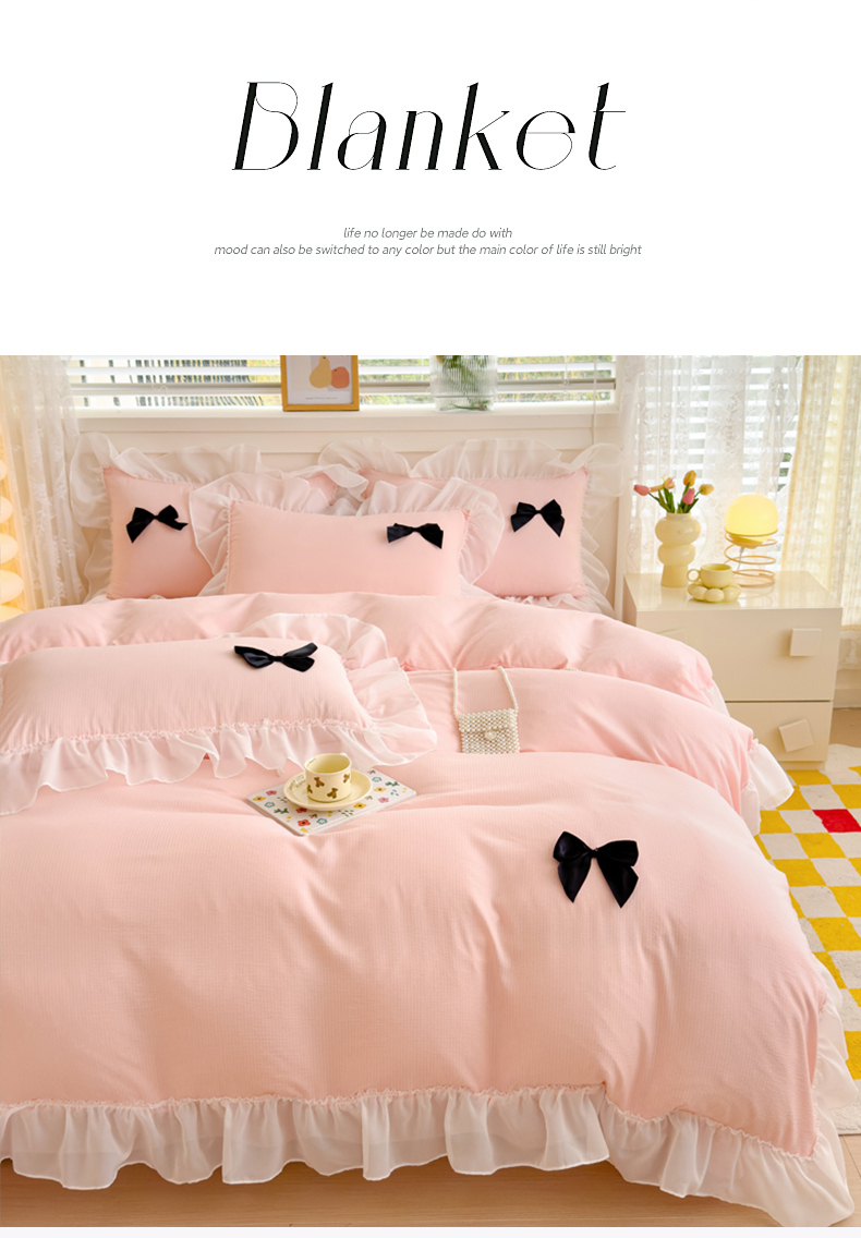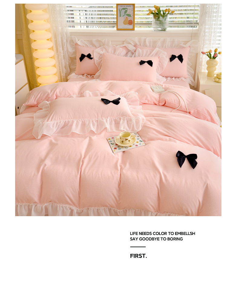 (买家秀 爆款花型不断货)A类母婴级少女风韩式公主风泡泡纱床上四件套韩式泡泡棉花边四件套水洗棉四件套 泡泡棉-粉玉