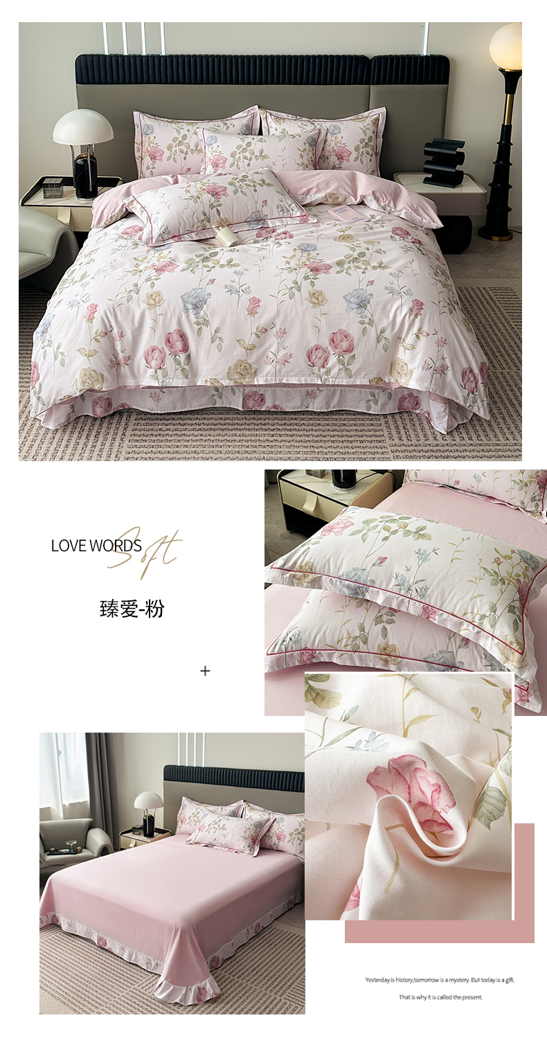 当前位置: 91家纺网 > 商品网购 > 床品套件 > 四件套 > 全棉普通四件套 > 眷恋家纺 2025年春夏全棉铂金棉13376数码印花四件套 臻爱-粉