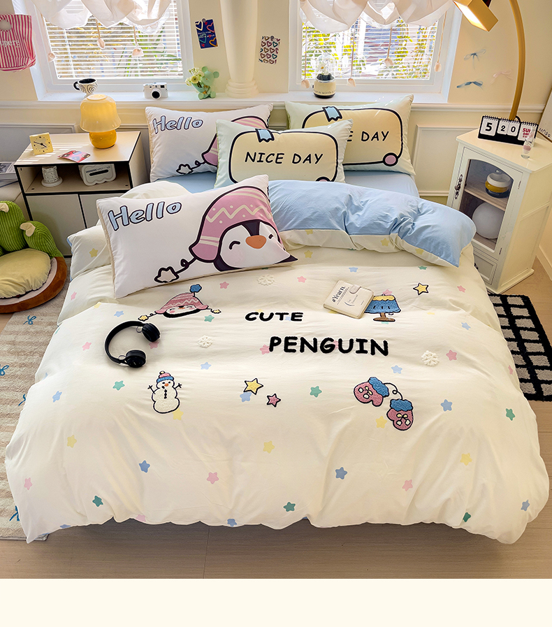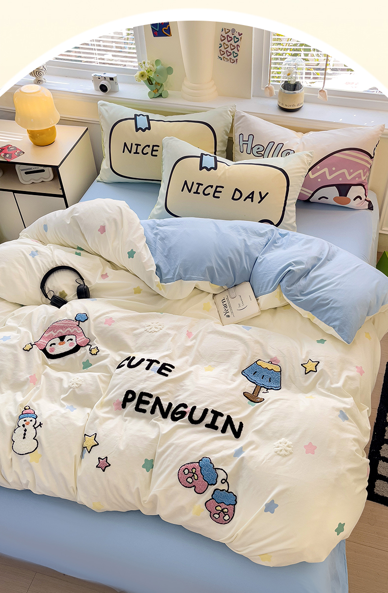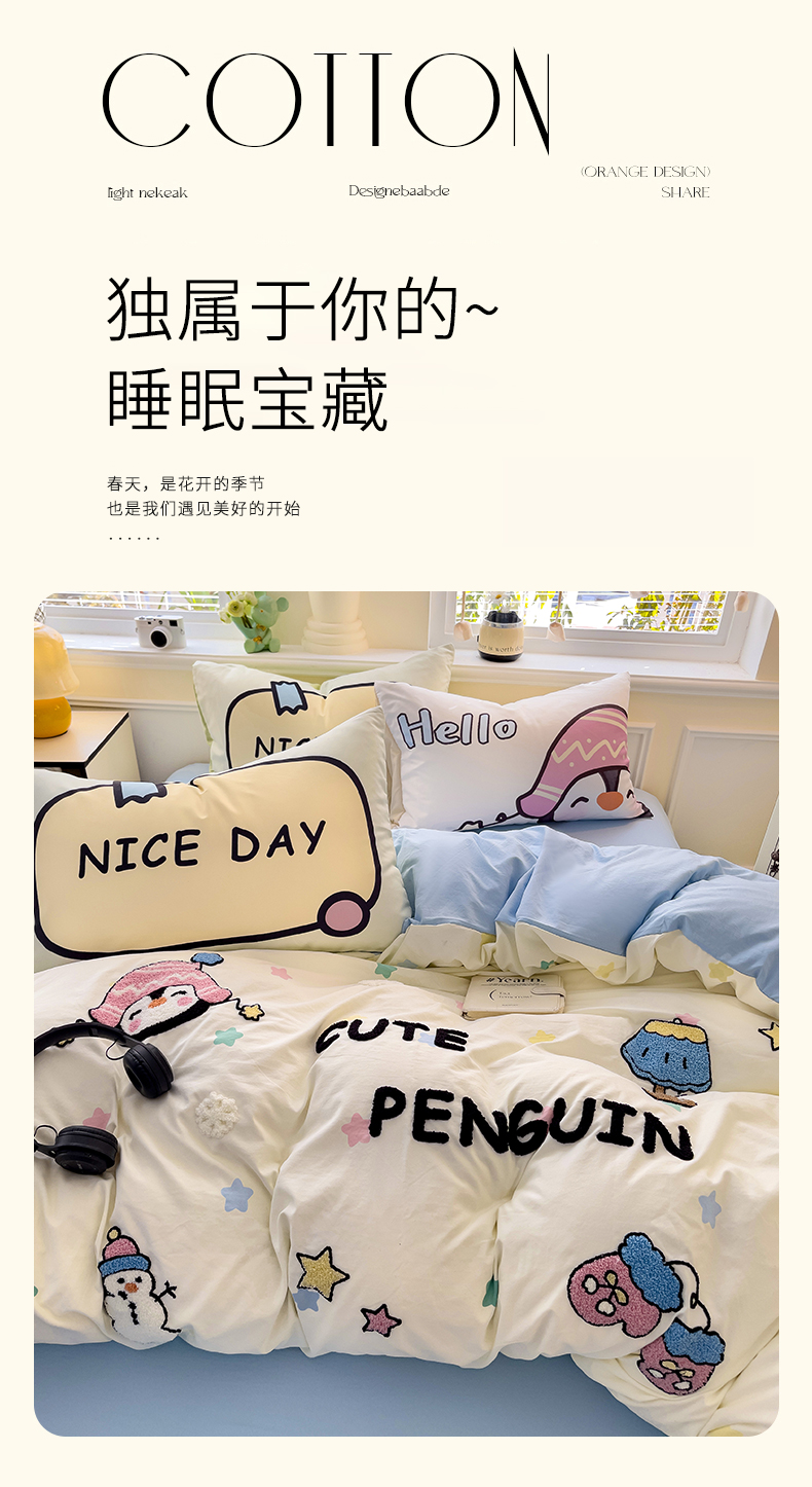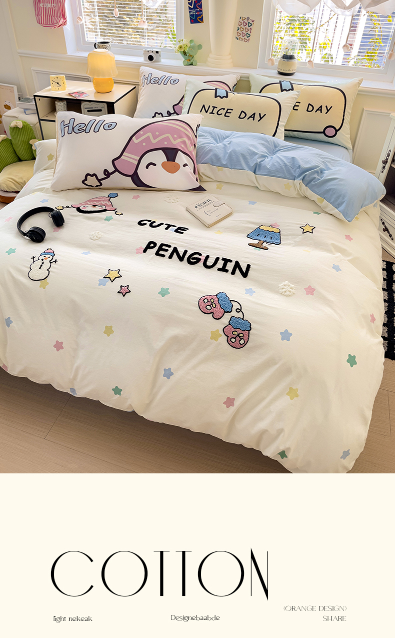 当前位置: 91家纺网 > 商品网购 > 床品套件 > 四件套 > 全棉普通四件套 > 尤米【提供买家秀】2025新款水洗棉大版卡通毛巾绣四件套 企鹅-星星