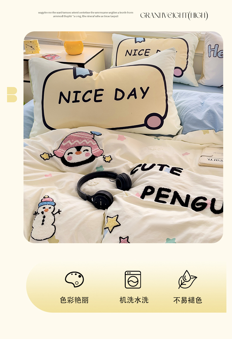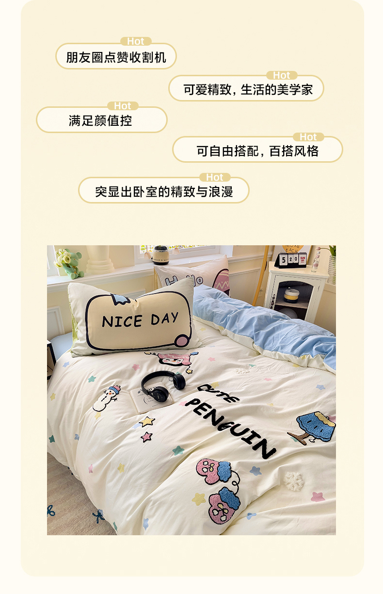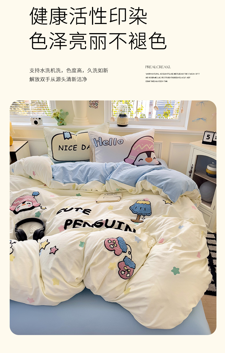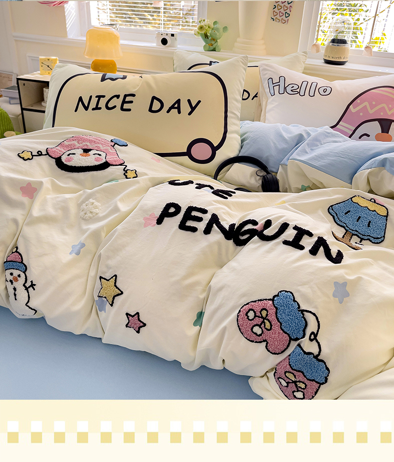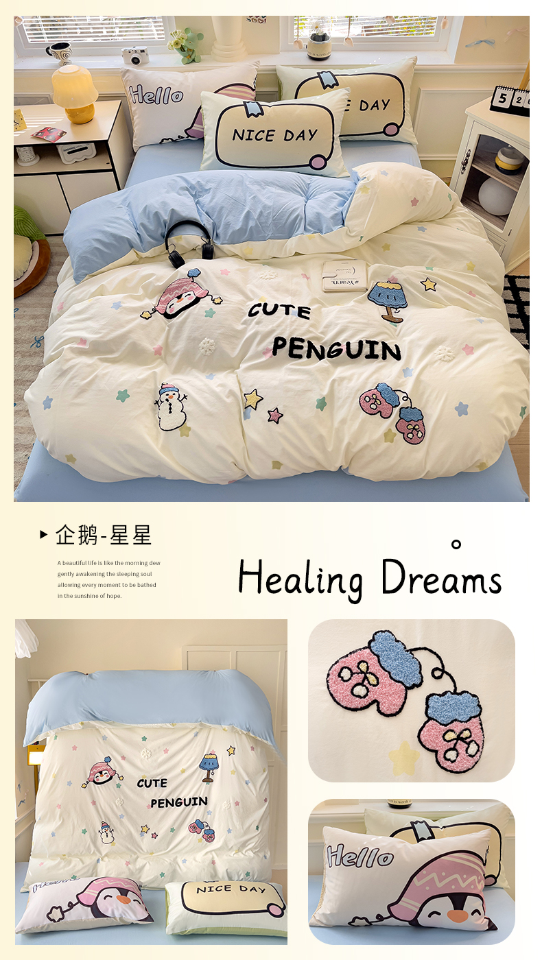当前位置: 91家纺网 > 商品网购 > 床品套件 > 四件套 > 全棉普通四件套 > 尤米【提供买家秀】2025新款水洗棉大版卡通毛巾绣四件套 企鹅-星星