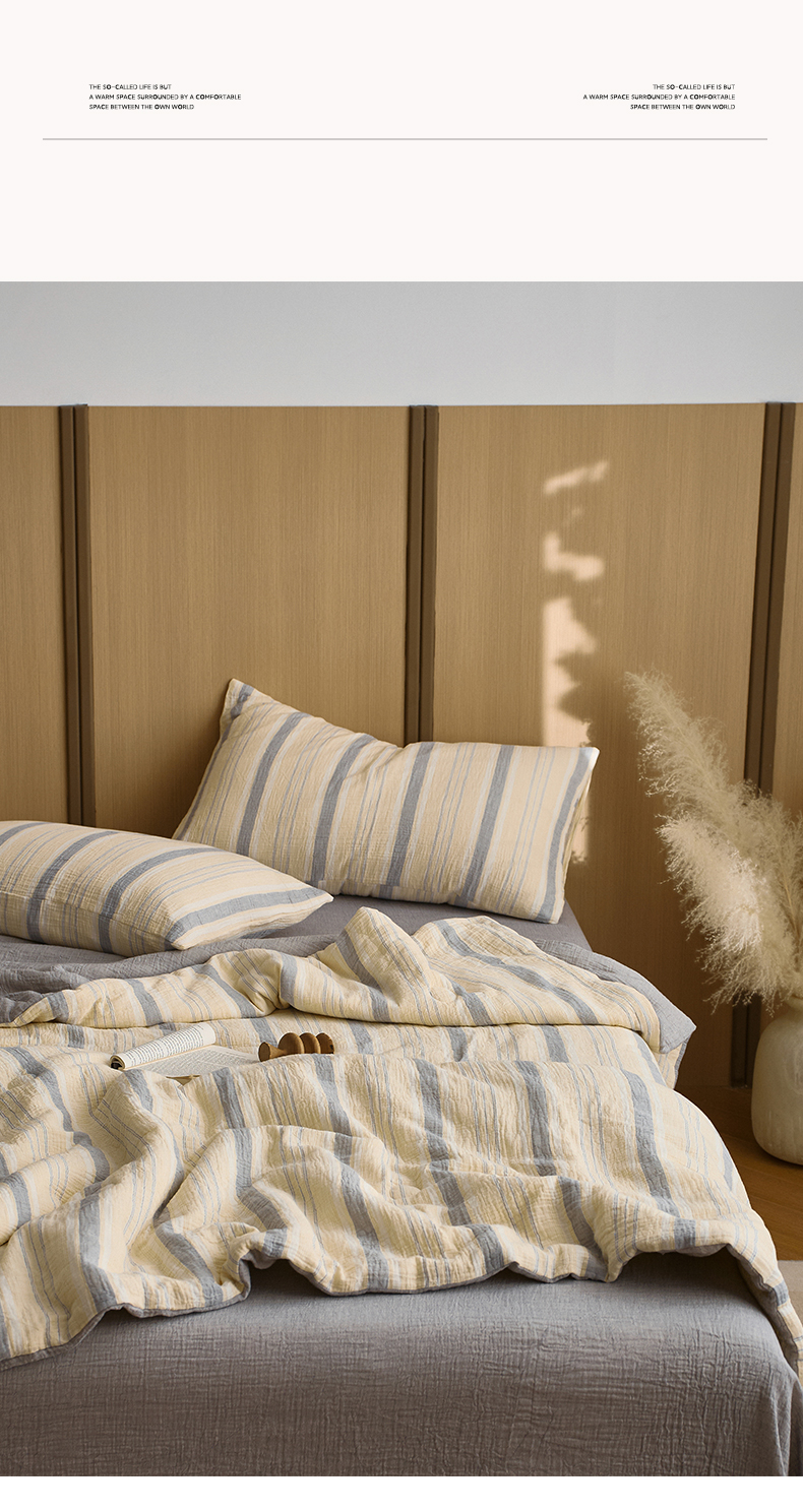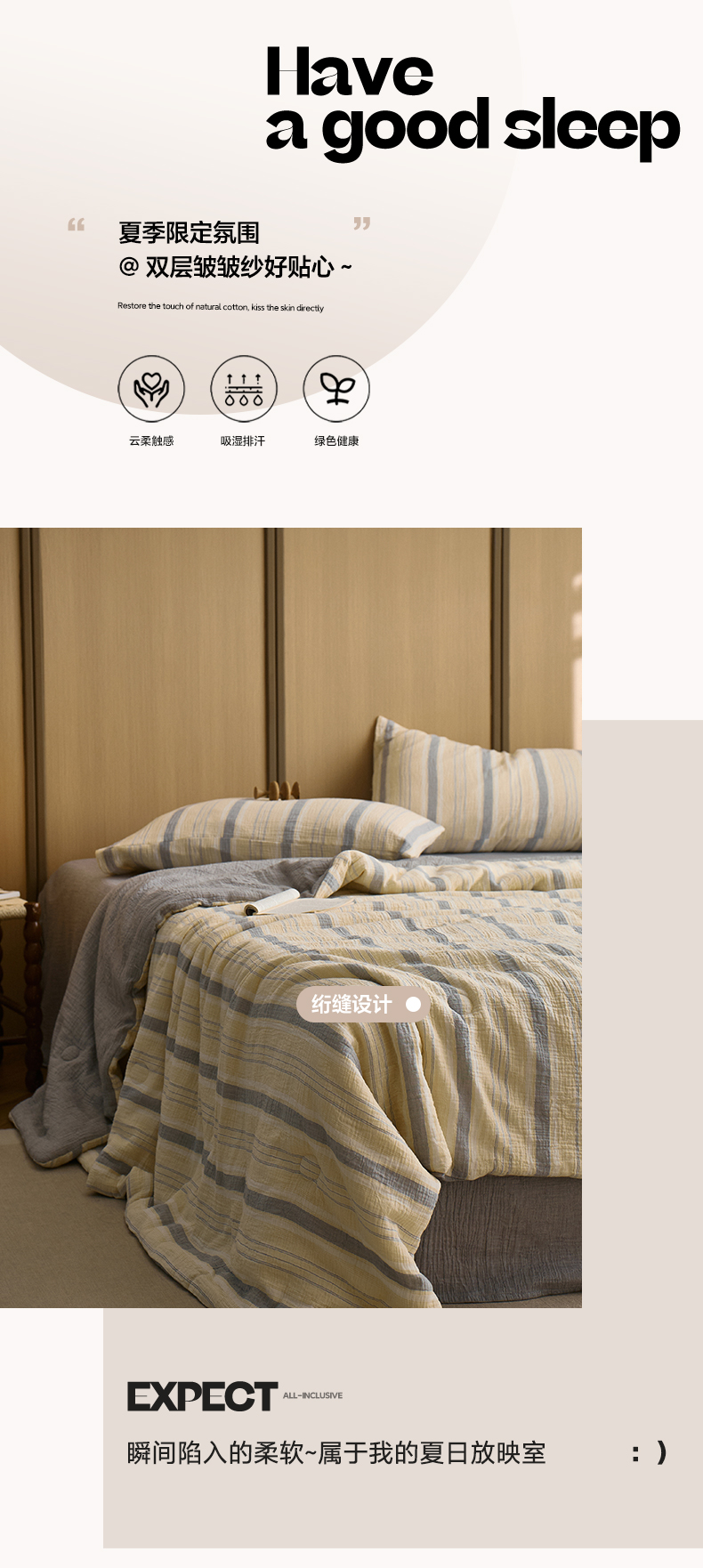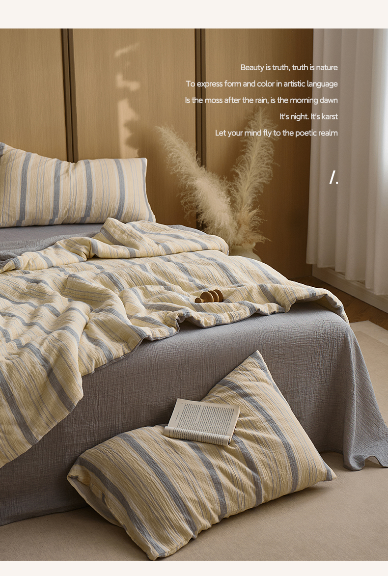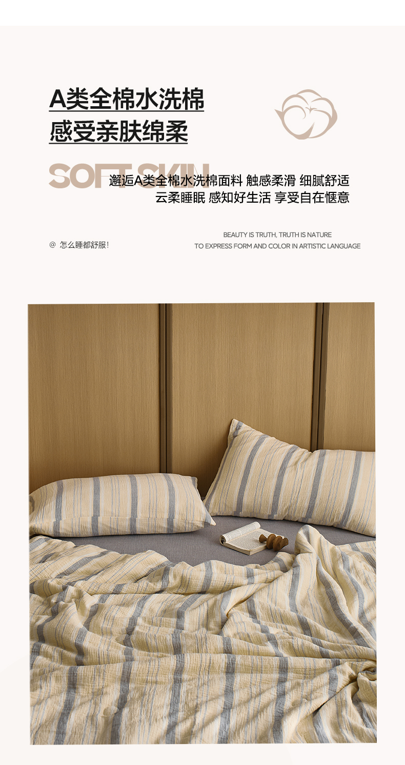 • 91家纺网 家纺一手货源 找家纺 一加一 2025新款A类母婴级水洗全棉无印双层皱皱纱牛奶蛋白夏被四件套 时予黄灰