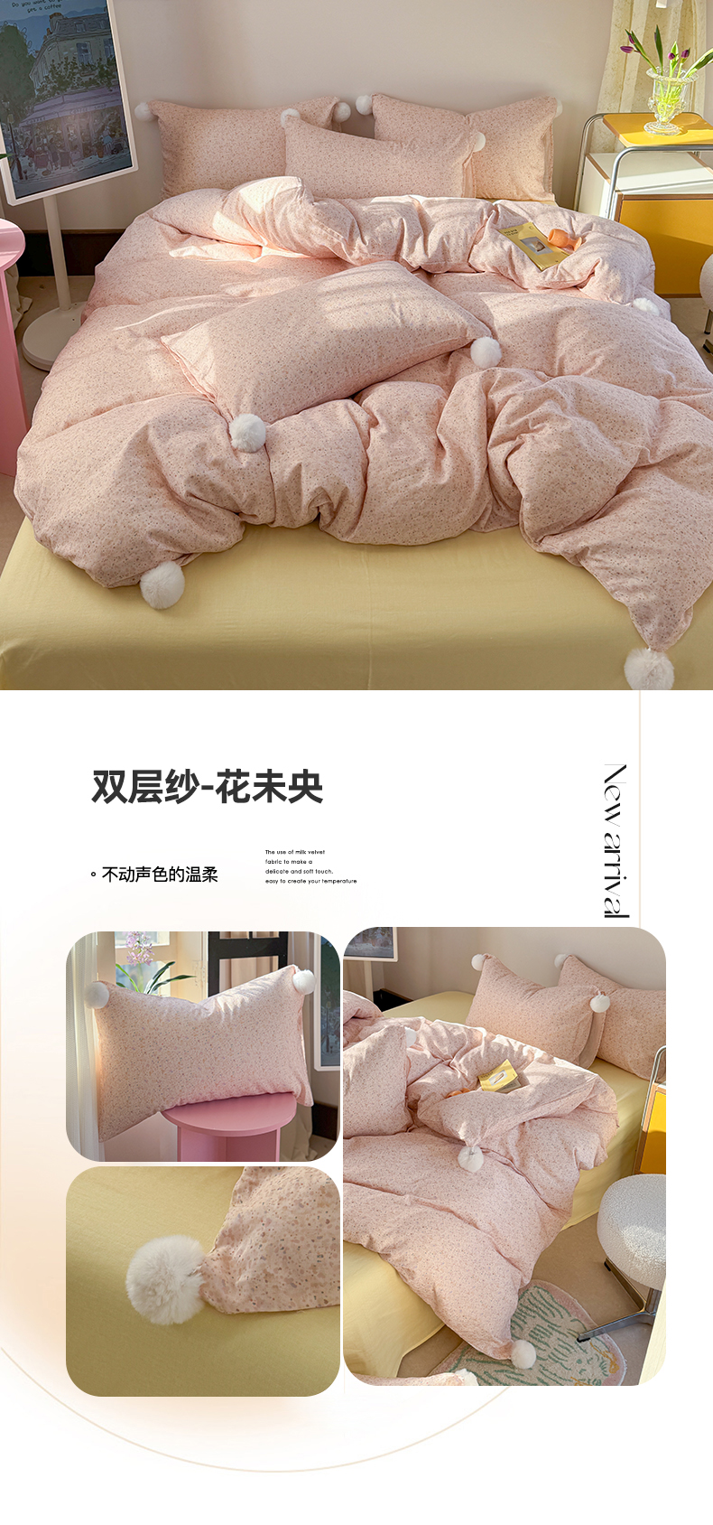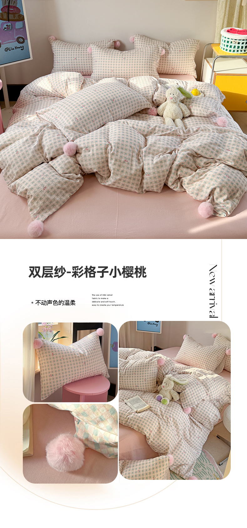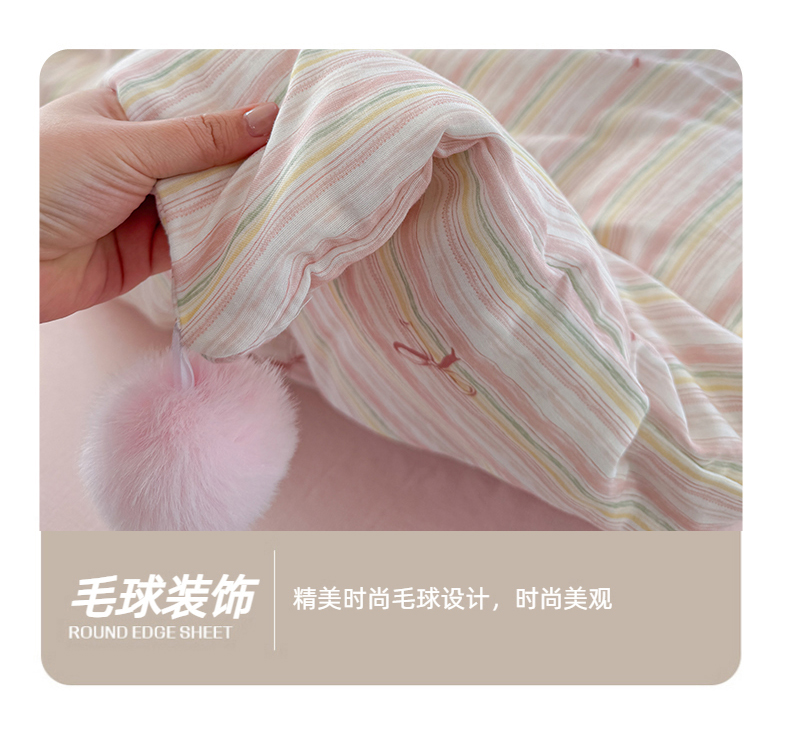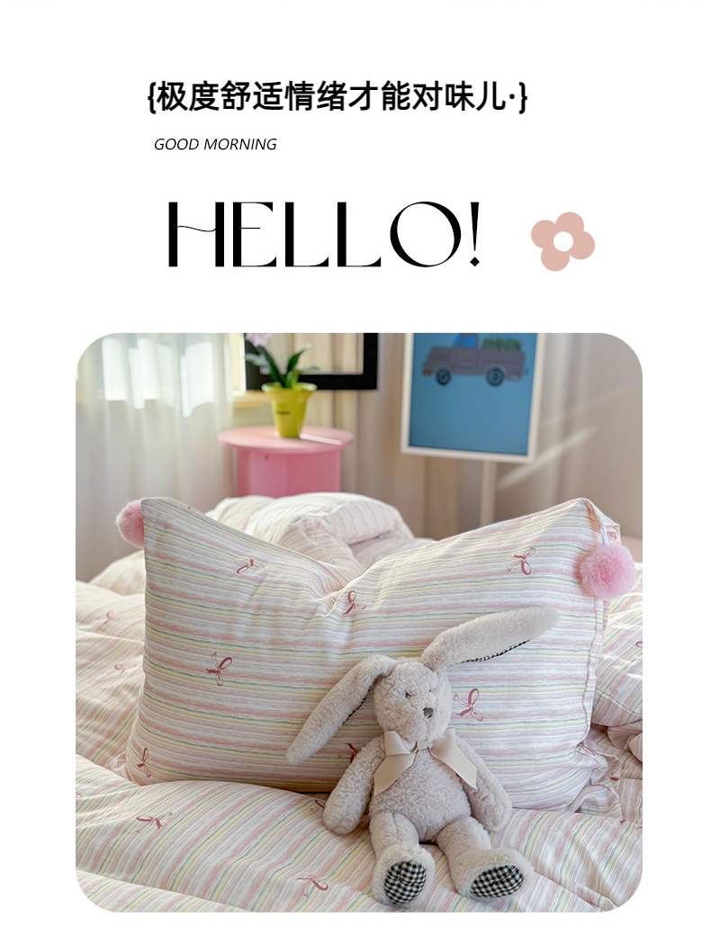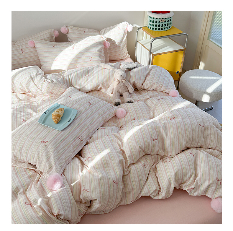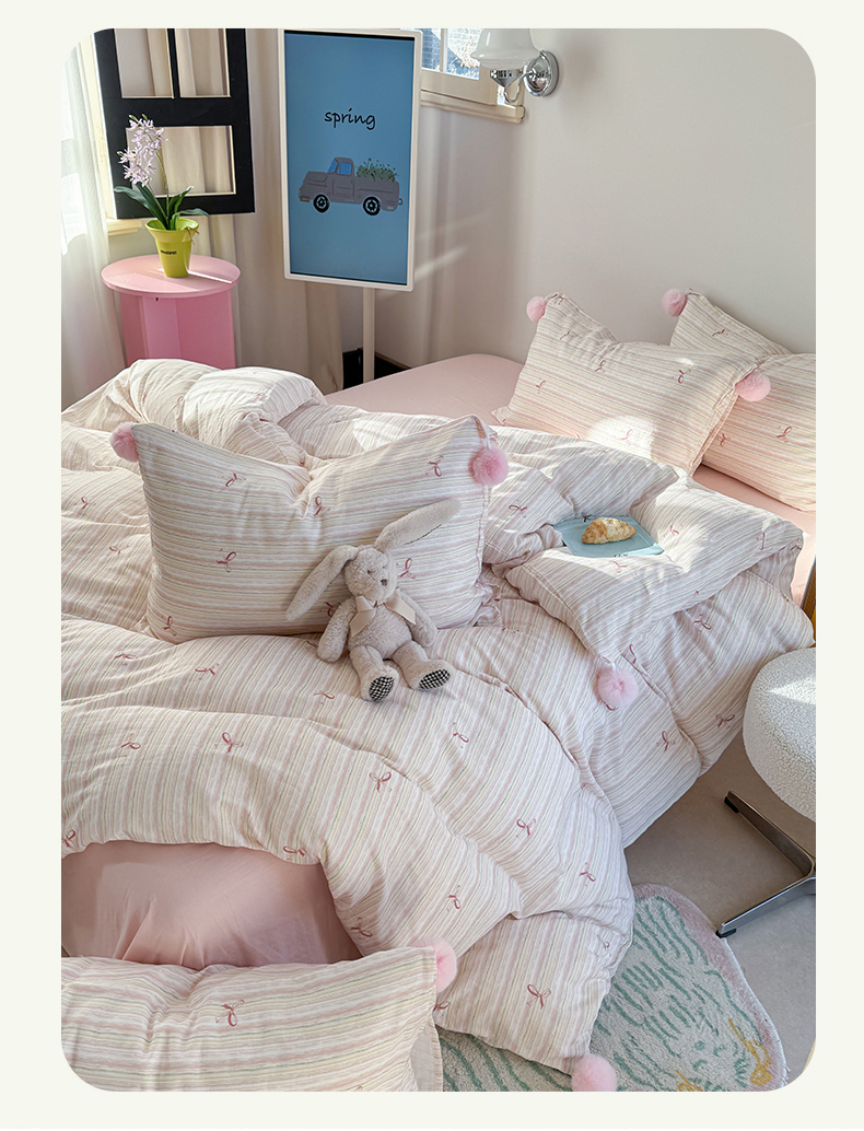 金爱家 2025新款亲肤舒适纯棉双层纱四件套 双层纱-彩条蝴蝶结