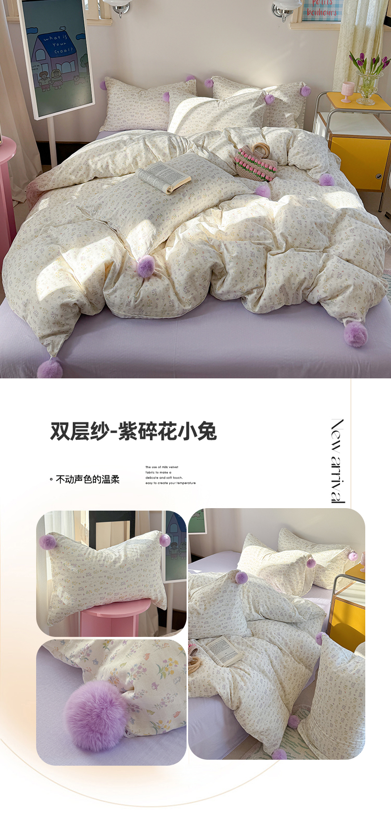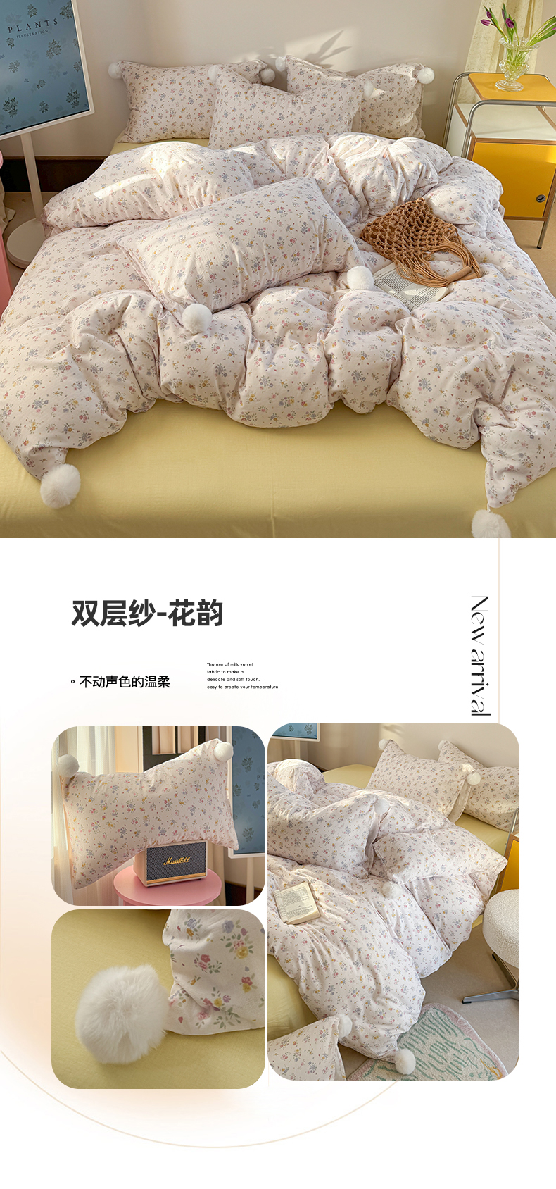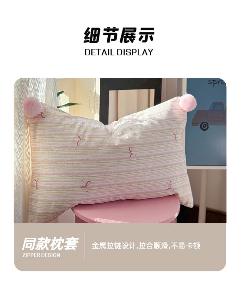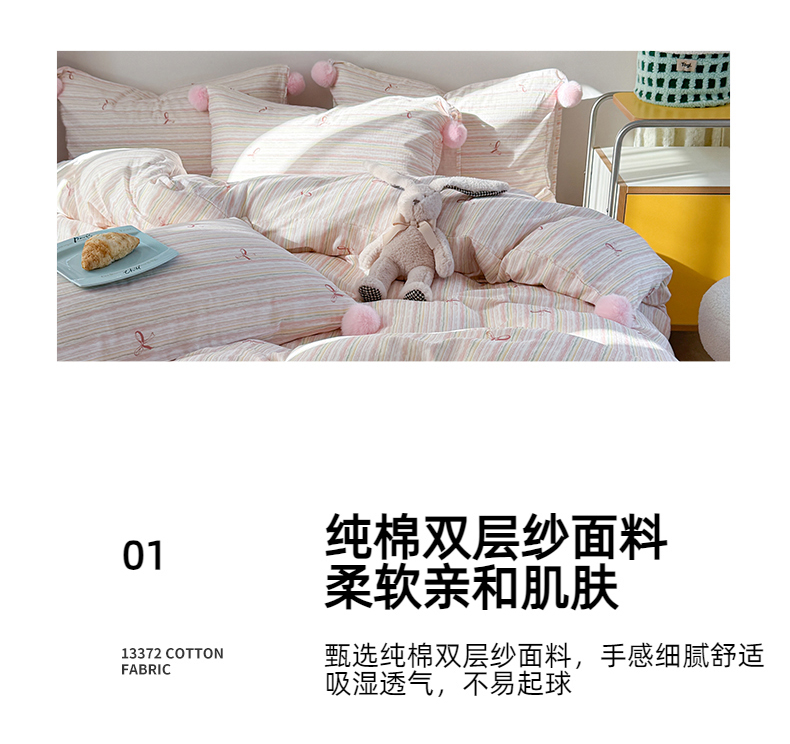 商品名称:金爱家 2025新款亲肤舒适纯棉双层纱四件套 双层纱-彩条蝴蝶结