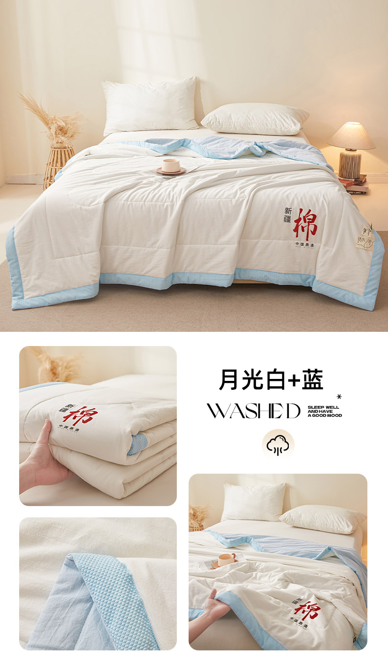 (总)熙宴家纺 2025新款水洗棉100%新疆棉花夏被-月光白,月光白+灰,月光白+蓝,月光白+绿,月光白+玉