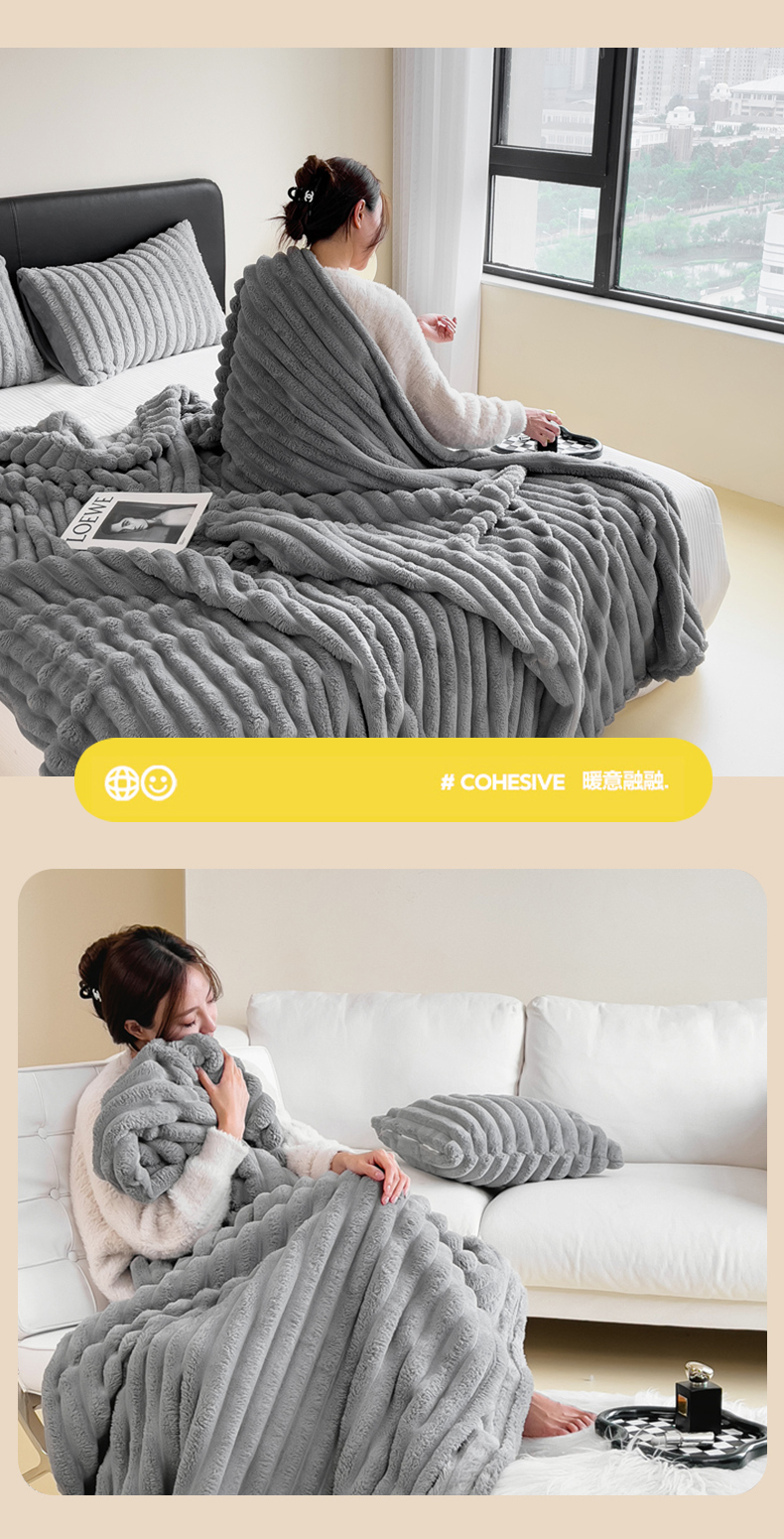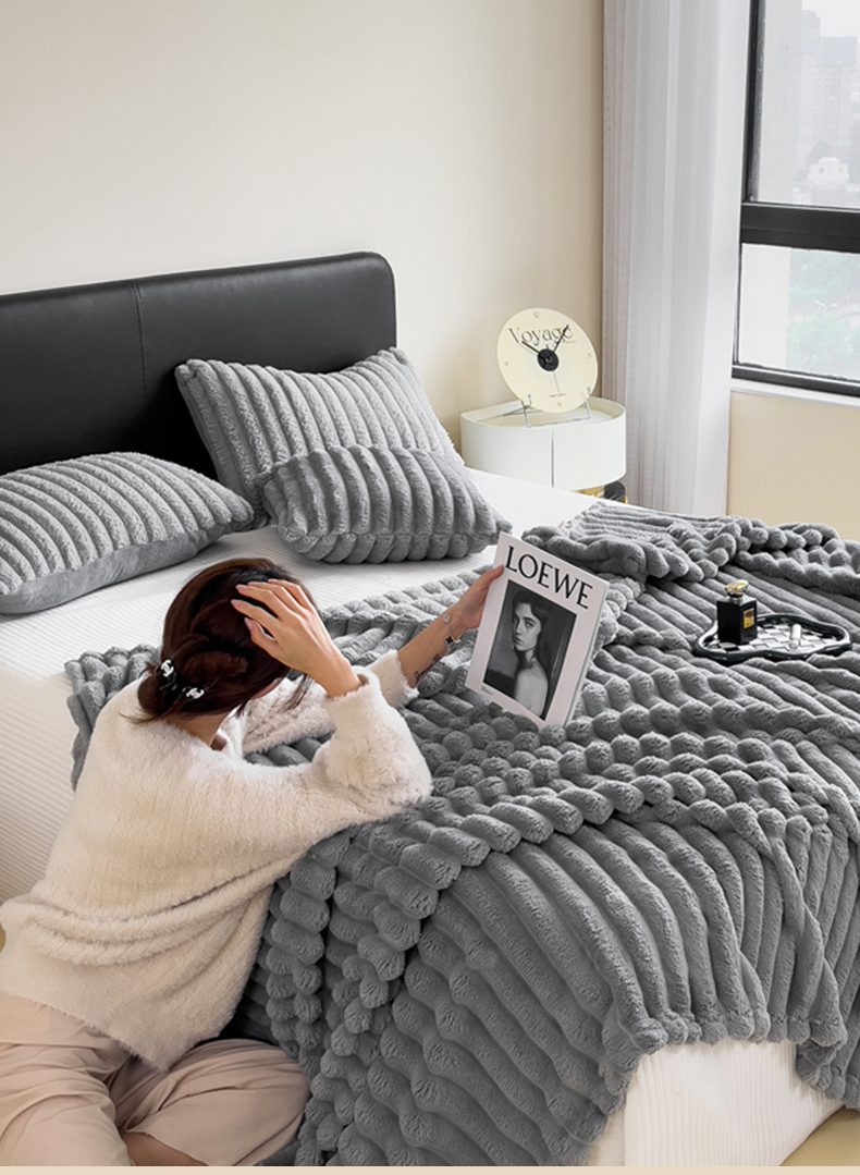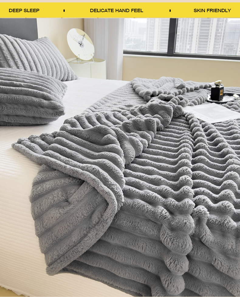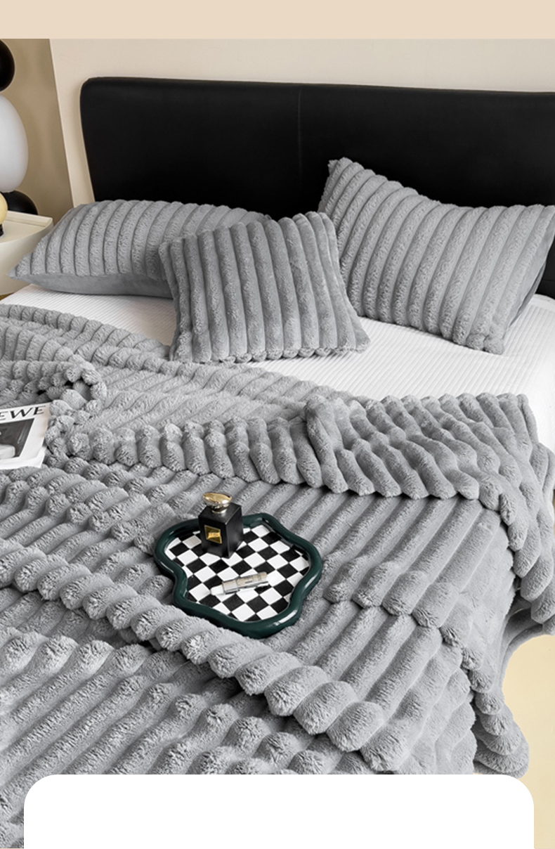 商品名称:一帆毯业 跨境外贸2025新款仿兔毛宽抽条牛奶绒盖毯 抽条浅灰